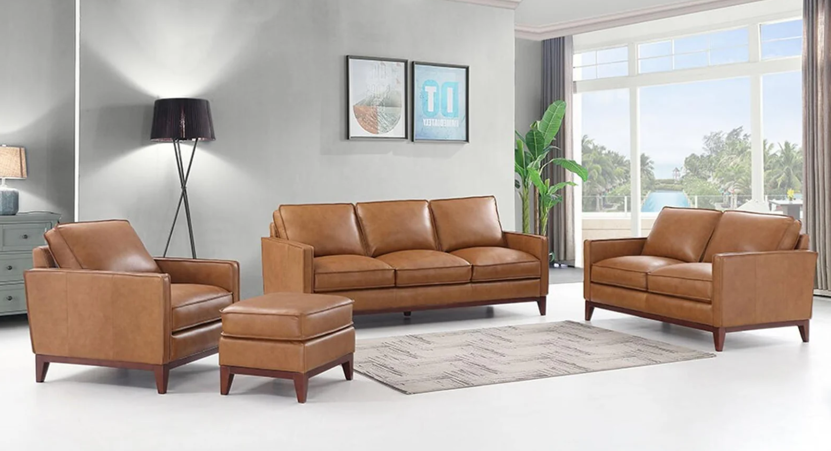 The Georgetown Newport 3 PC Living Room Set – Camel is a perfect reflection of this lasting color movement. Upholstered in richly colored camel brown top-grain leather, the Newport collection showcases a refined mid-century modern silhouette with thin pinched seam track arms and a wood base. The warm leather tone embodies the earthy palette that defined 2025 — and continues to anchor sophisticated living rooms in 2026 with timeless luxury.