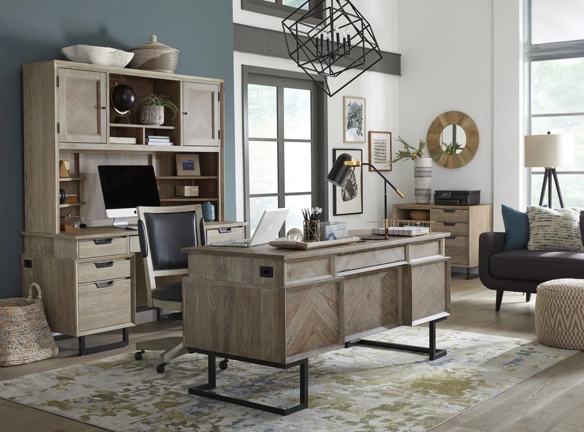 -Aspen Home Harper Point 66" Executive Desk: Designed with both style and durability in mind, the Harper Point Executive Desk features a solid wood construction with a bleached khaki finish that blends seamlessly with a desert palette. Its spacious surface and sturdy build make it ideal for positioning near windows, where it can stand up to natural light without fading or warping—perfect for productive days in your St. George home office.