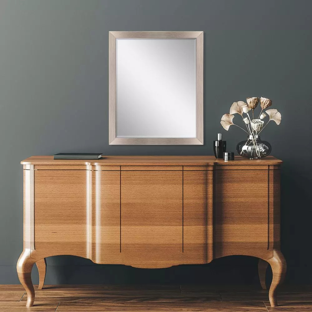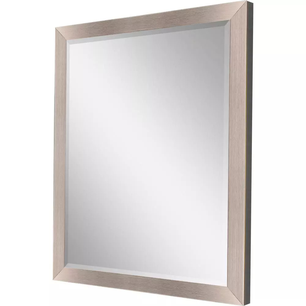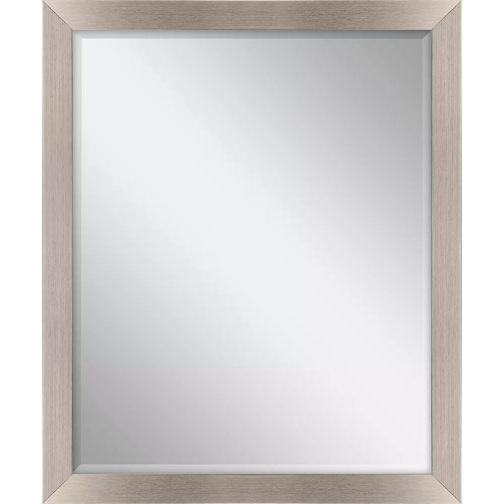 Elegant beveled mirror is framed in a sleek contemporary moulding in a brushed silver finish with black lip.