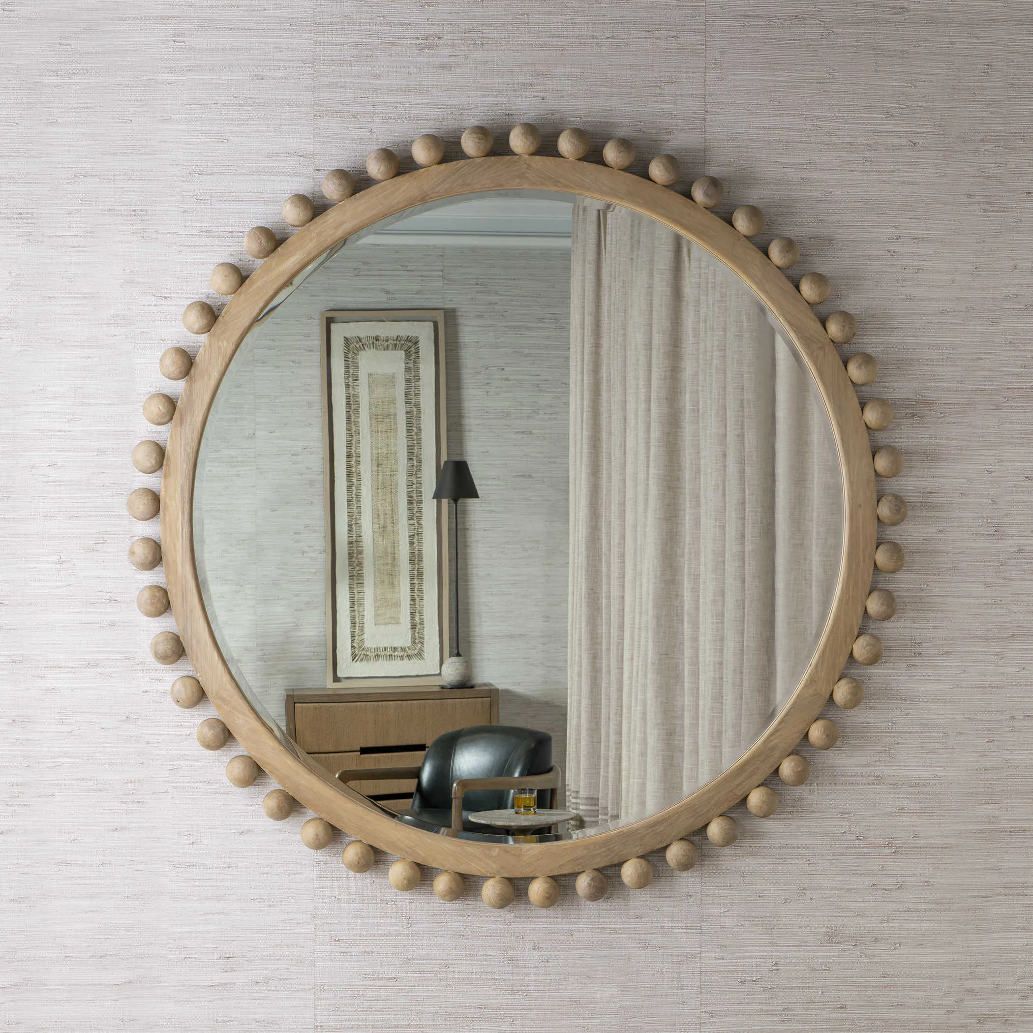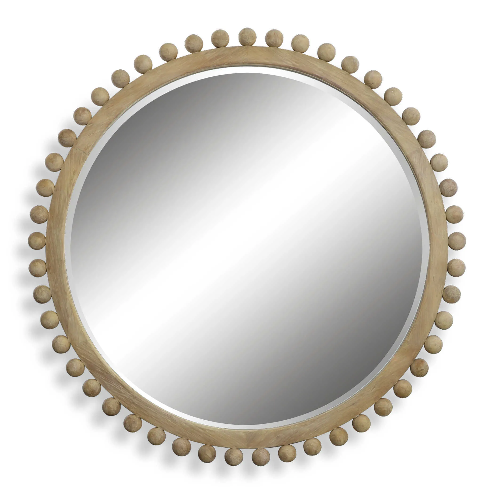 Hand-brushed, solid wood spheres line the outer edge of a wooden frame, all in a natural finish. Mirror features a generous 1" bevel.