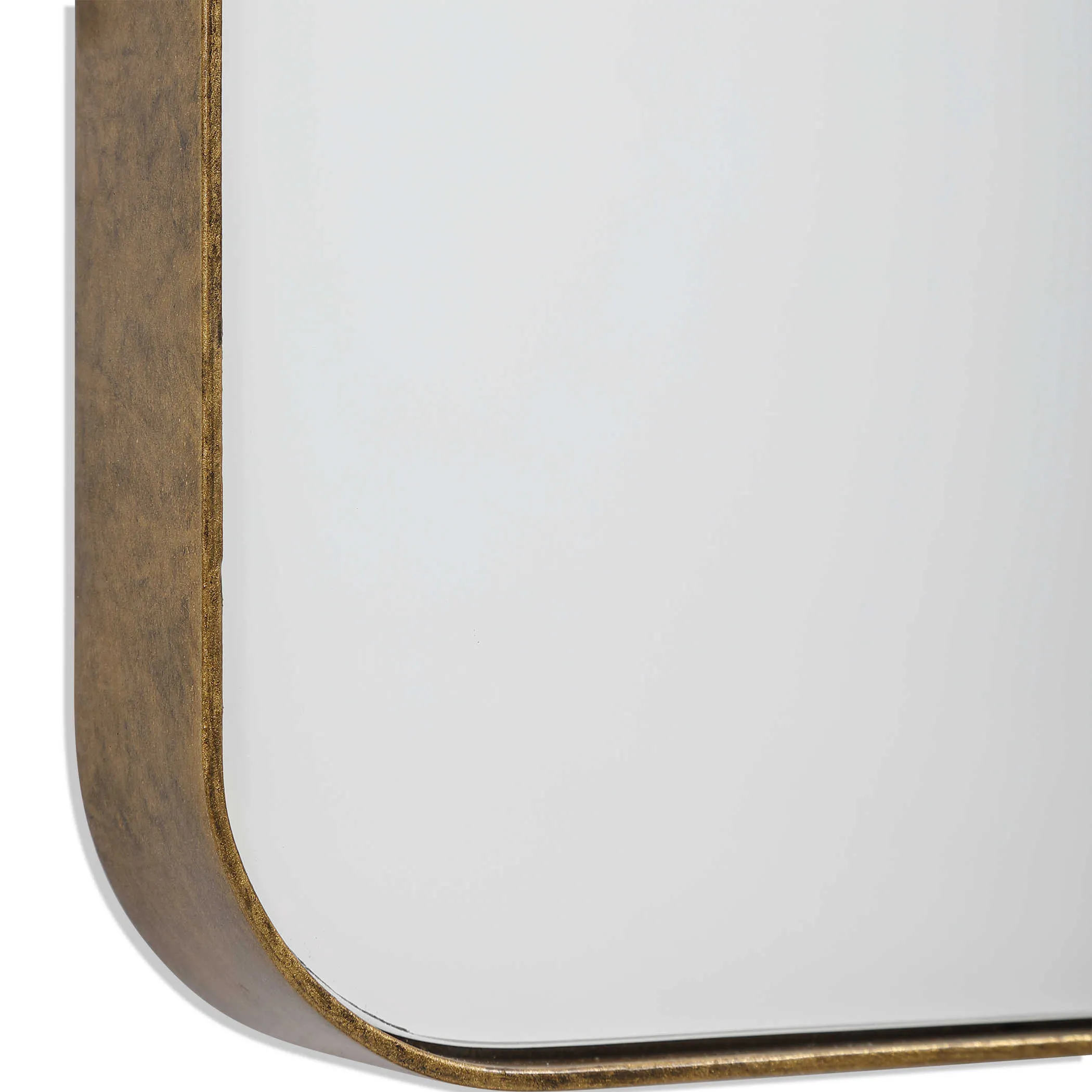 The clean and sophisticated Embrace Mirror has a frame made of white glass encased in an antique gold leaf metal frame. May be hung horizontal or vertical.