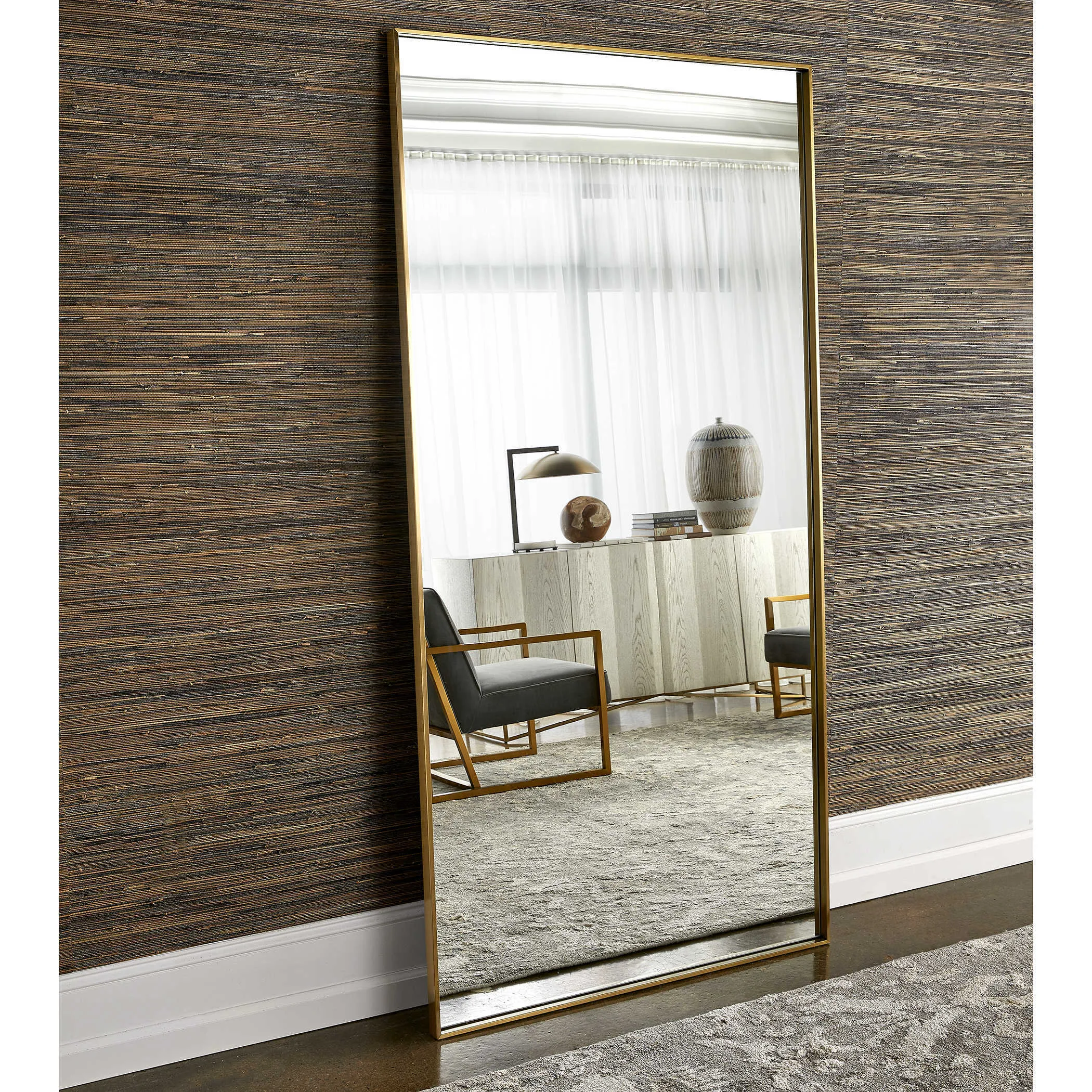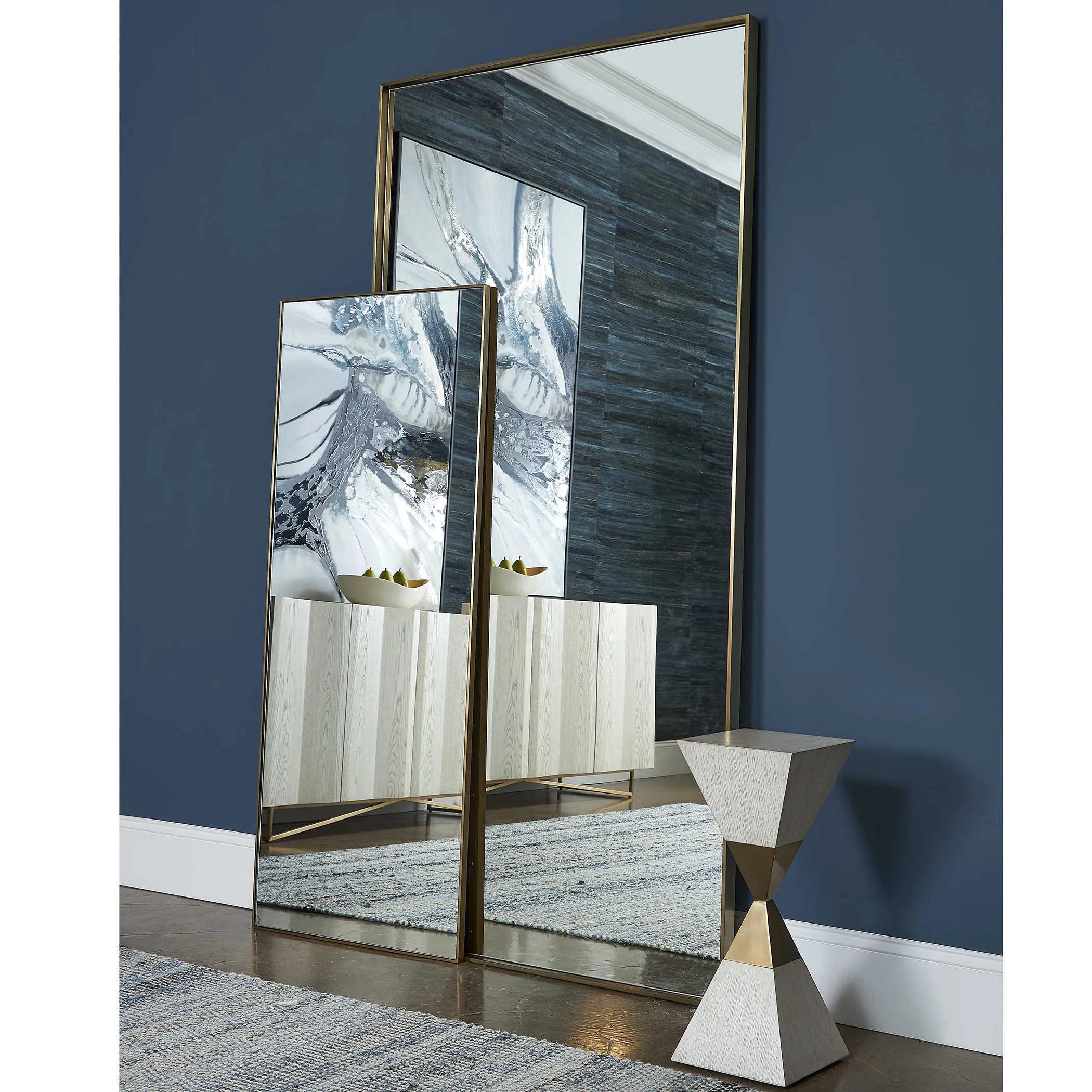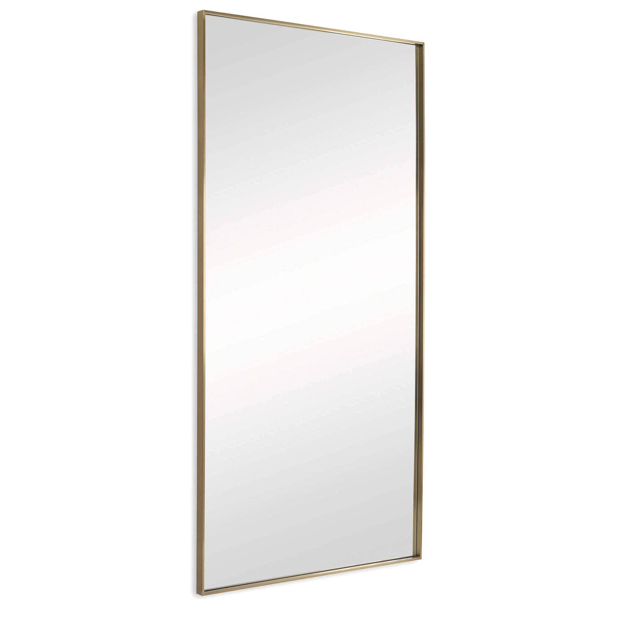 This mirror features a slim stainless steel frame finished in a light plated brushed brass. Its grand stature creates a beautiful statement while its fresh design maintains a clean and simple look. Mirror may be hung horizontal or vertical.