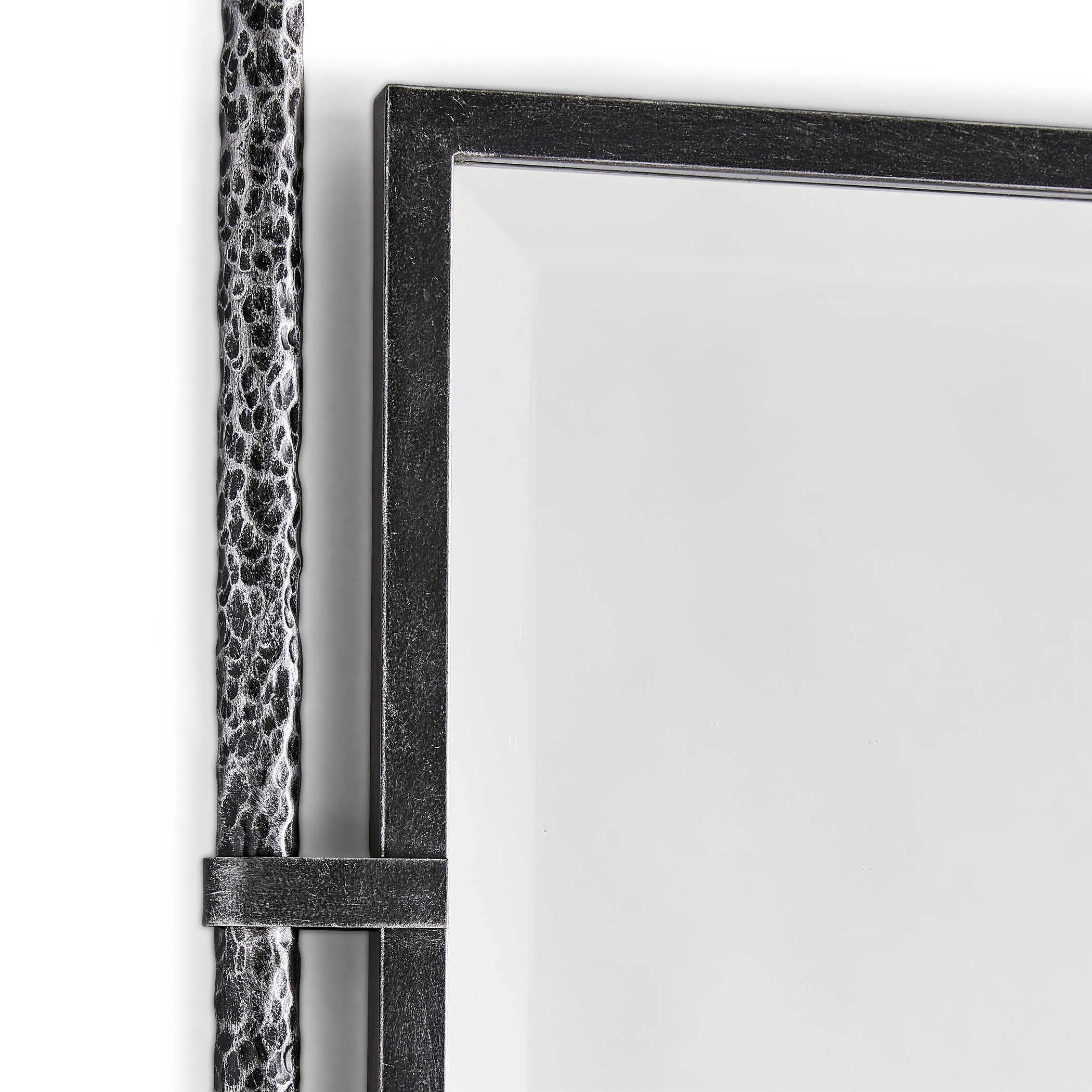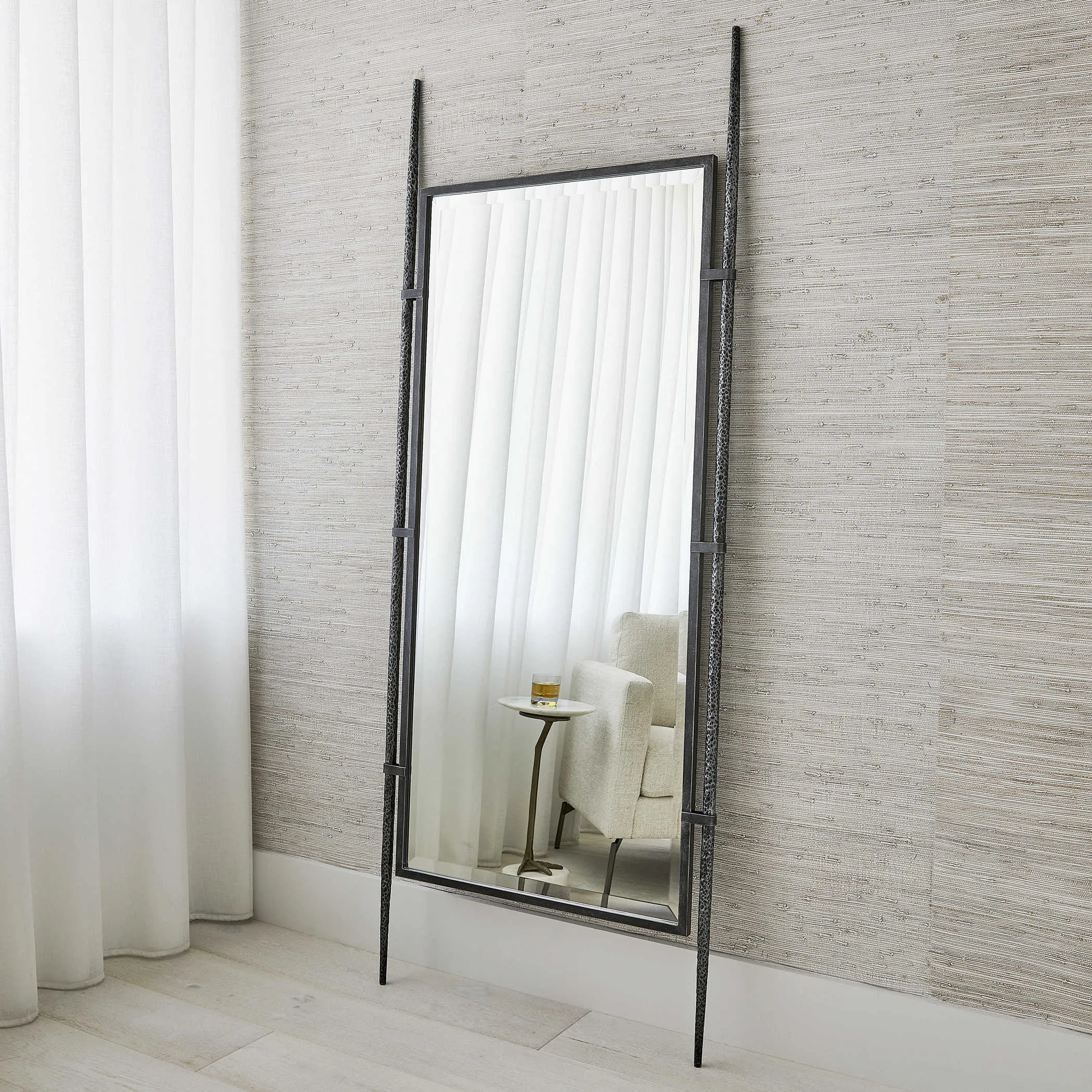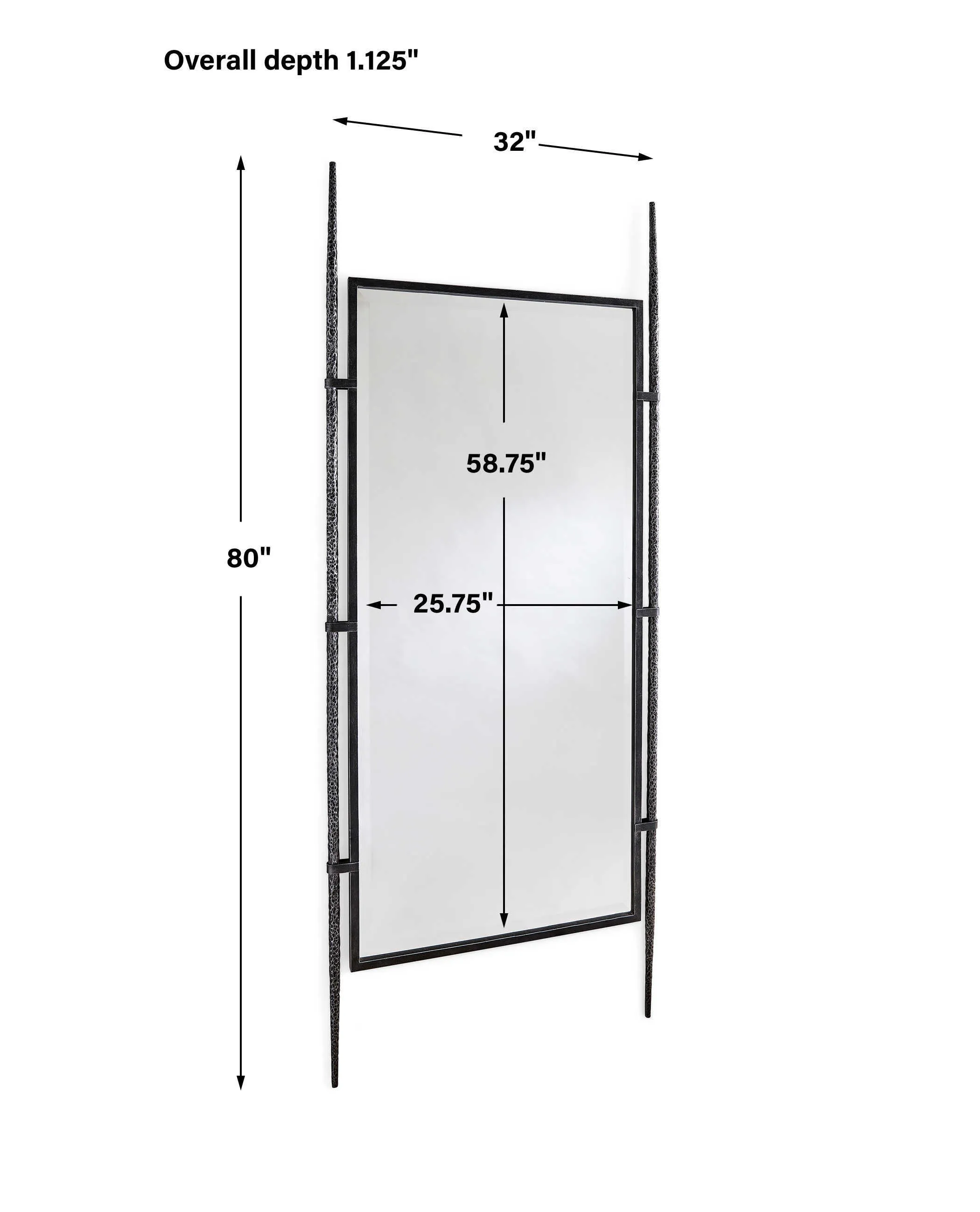 The center steel frame is suspended between two hand-forged textured legs. The mirror has a generous 1.25" bevel. Can be hung or leaned against a wall using the non-tip kit provided.