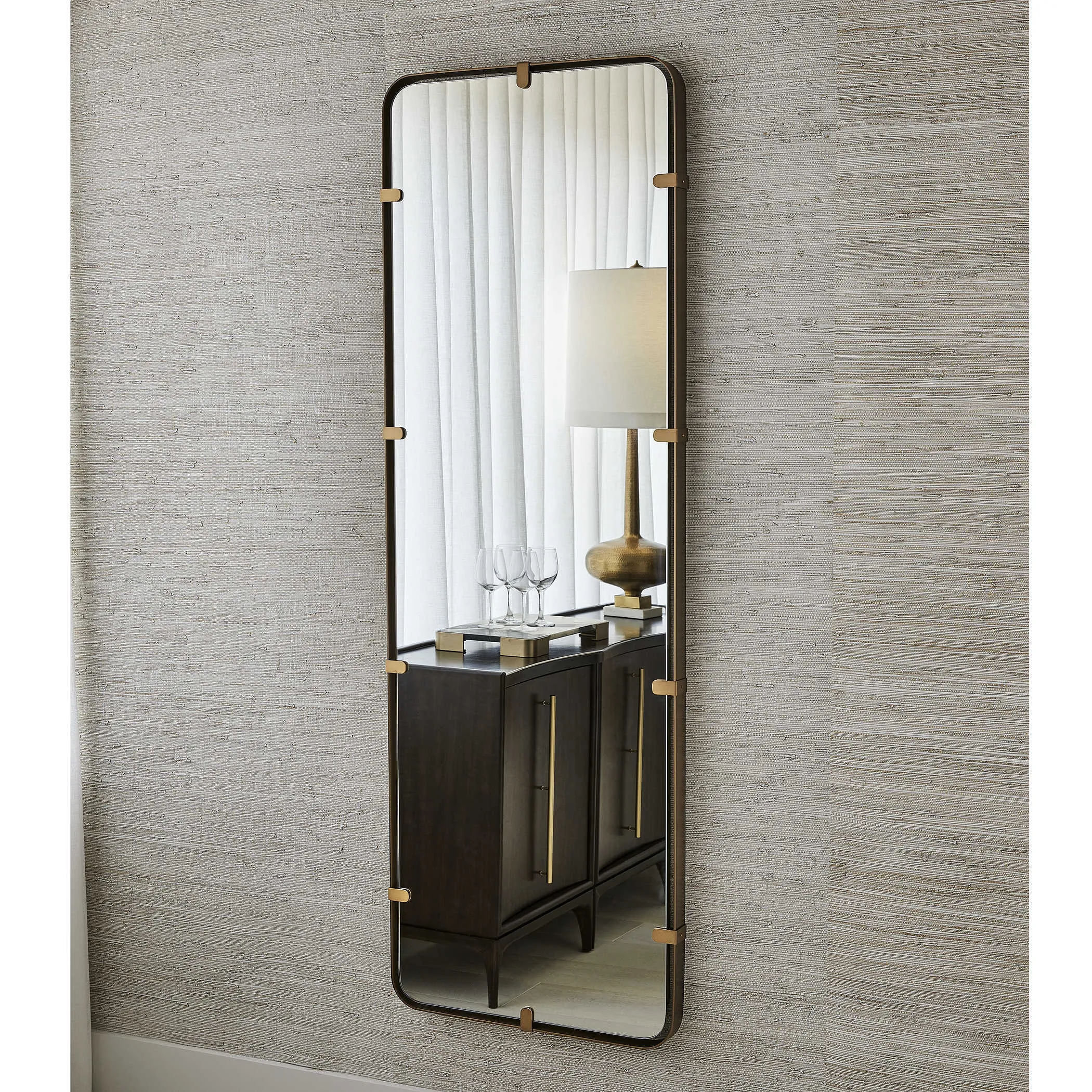 A ribbon of bronze-finished steel surrounds a floating mirror held by clips in a brass finish. All edges are curved, bringing elegance to the mixed materials. May lean on wall or be hung horizontal or vertical.