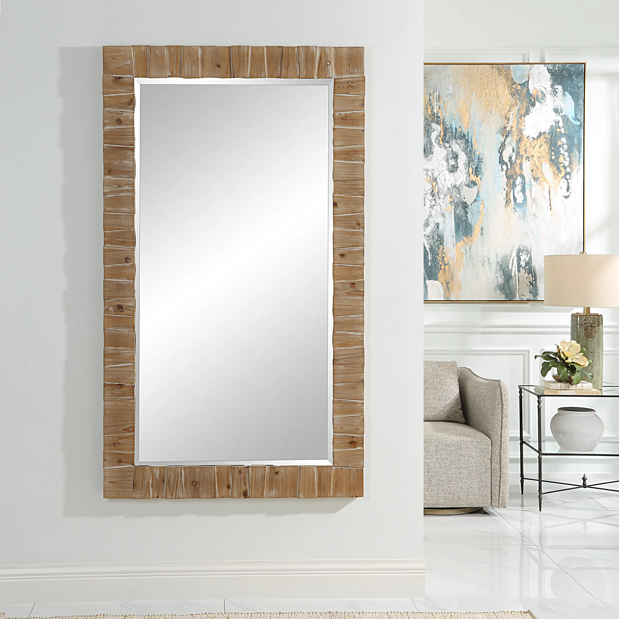 Perfect Addition To Any Coastal Cottage, This Oversized Mirror Features Overlapped Slabs Of Solid Fir Wood Creating An Alternating Pattern, Accented With A Subtle Light Gray Wash. Mirror Has A Generous 1 1/4" Bevel. May Be Hung Horizontal Or Vertical.