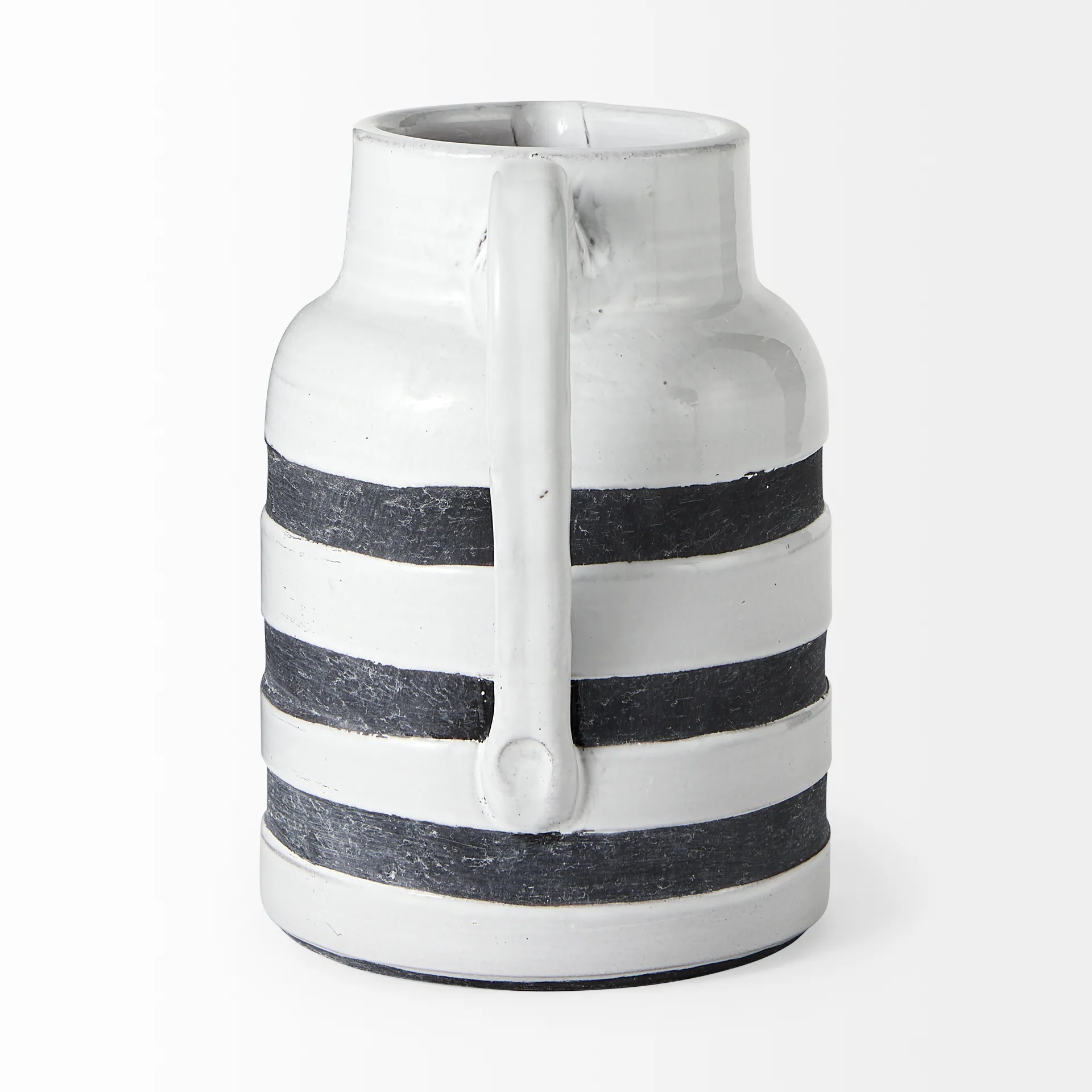 Expertly crafted from ceramic and designed to look like a rustic, weathered water pitcher with a pouring handle, the Harmon II is the larger of two spectacular decorative vases from the Harmon series. Finished in a rustic white tone with horizontal charcoal stripes with a soft white wash, the Harmon II looks absolutely gorgeous in any space and setting but is most recommended for spaces based on the Farmhouse design style.