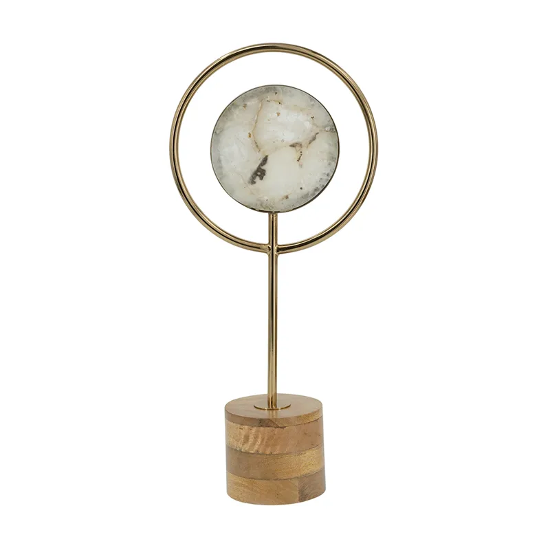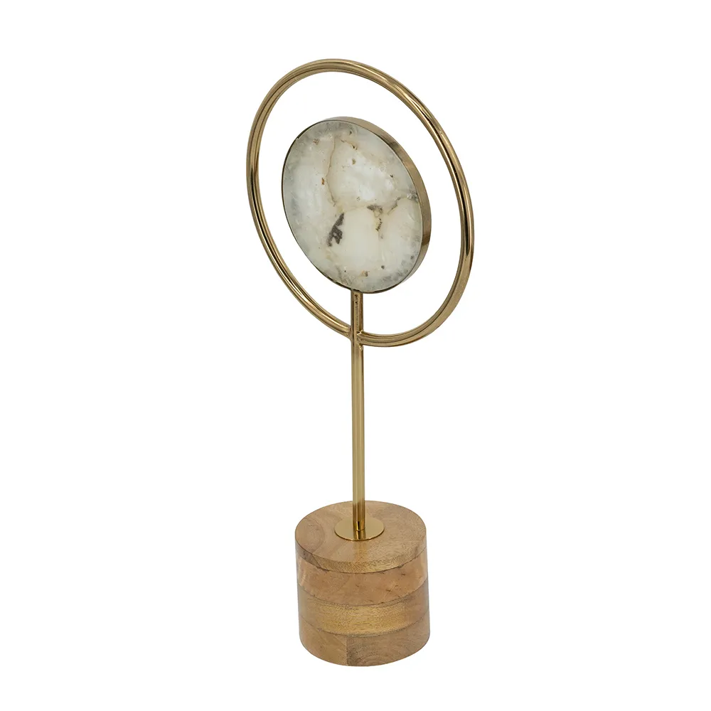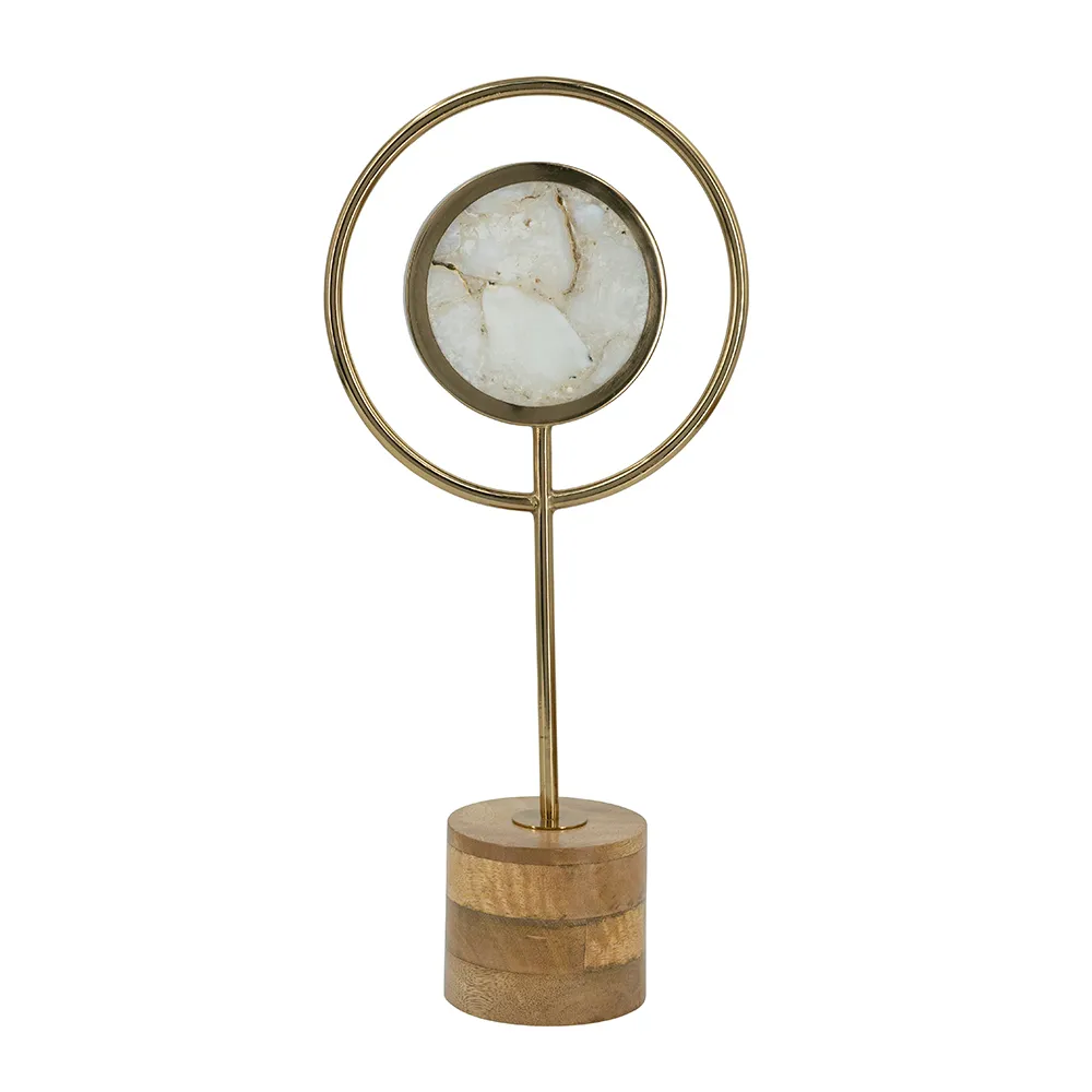 Showcasing the timeless beauty of natural materials, this sculpture features a slice of authentic white agate, framed in a ring of slender gold iron. Set atop a grained wooden base, it is certain to infuse any living room, entryway, or bedroom with a pop of organic charm.