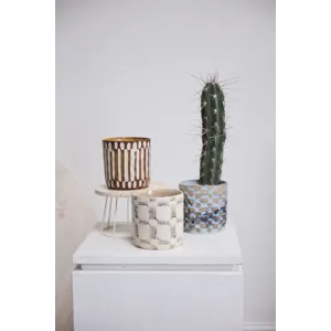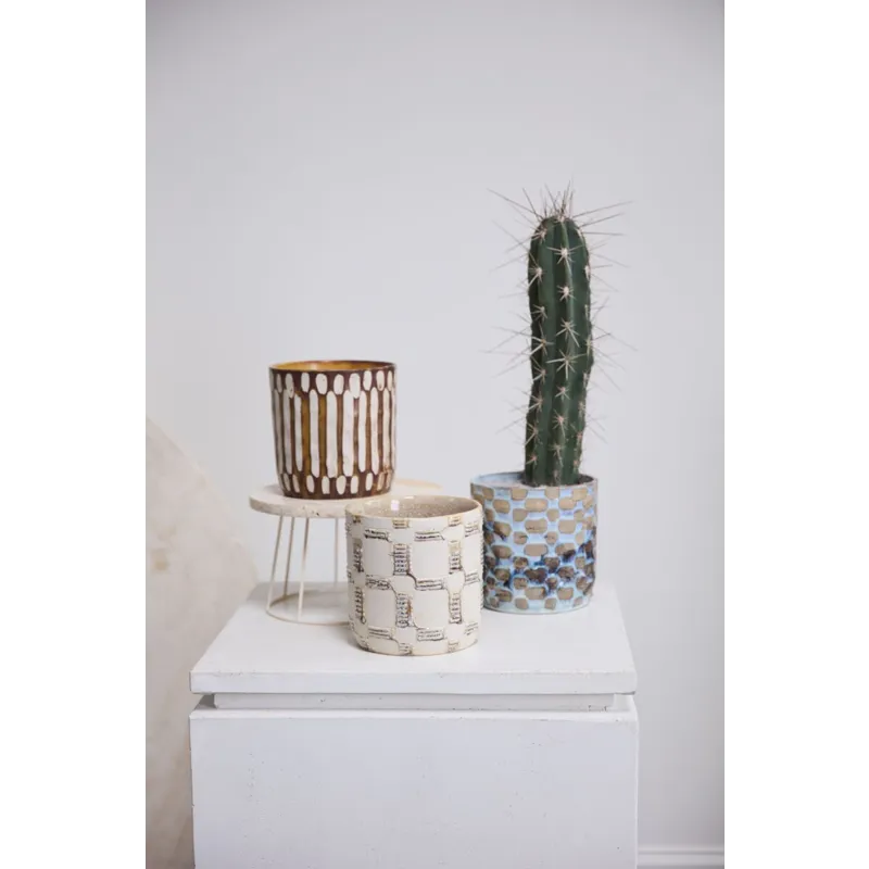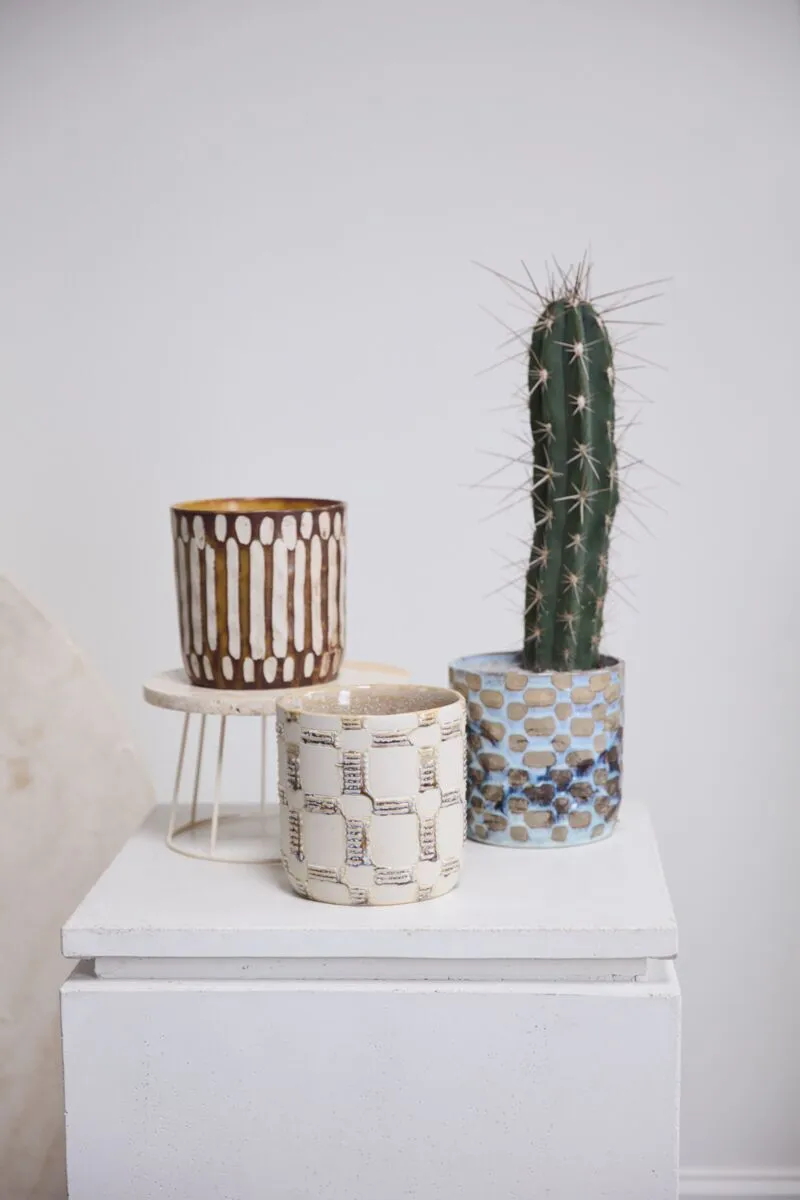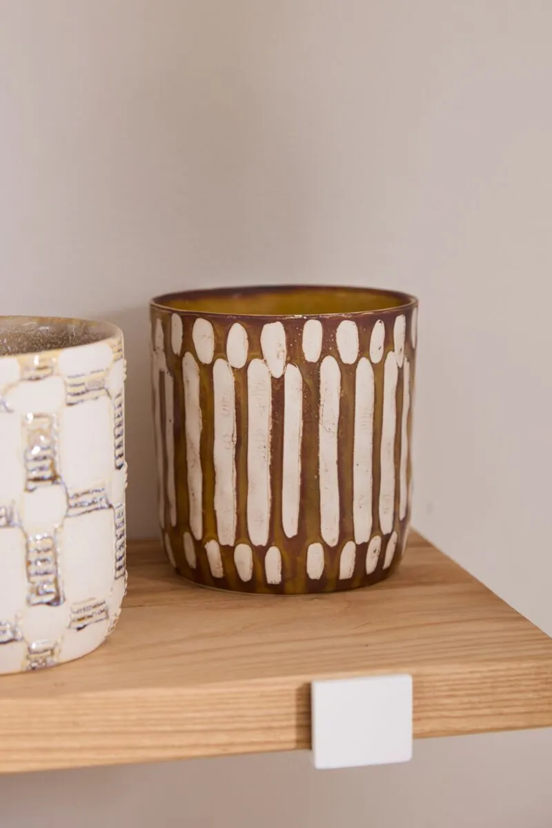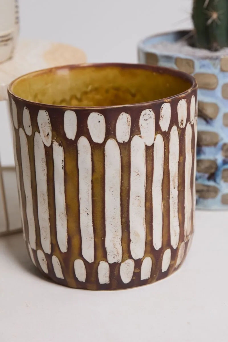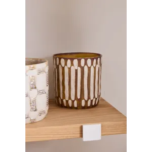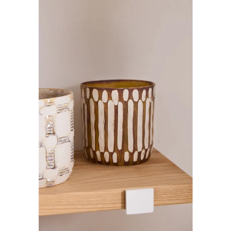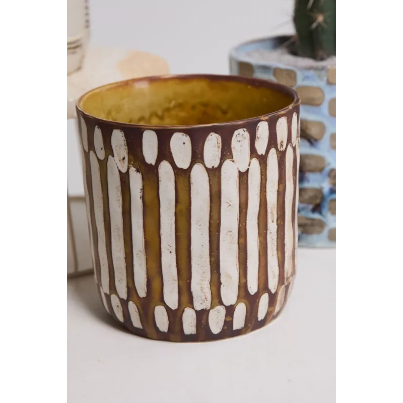 Artisanal in hue & pattern, the ceramic cylinder Anselm Pot is a display of craftmanship for plants in the home. Inspired by our Amira Mug Set, this pot features a slightly textural finish, hand painted dimensional pattern, & earth tones of warm brown & light tan. Pair with a 6-inch drop-in plant for a beautiful gift, & arrange alongside the other Anselm Pots for a cohesive, artful display.