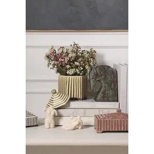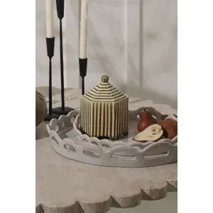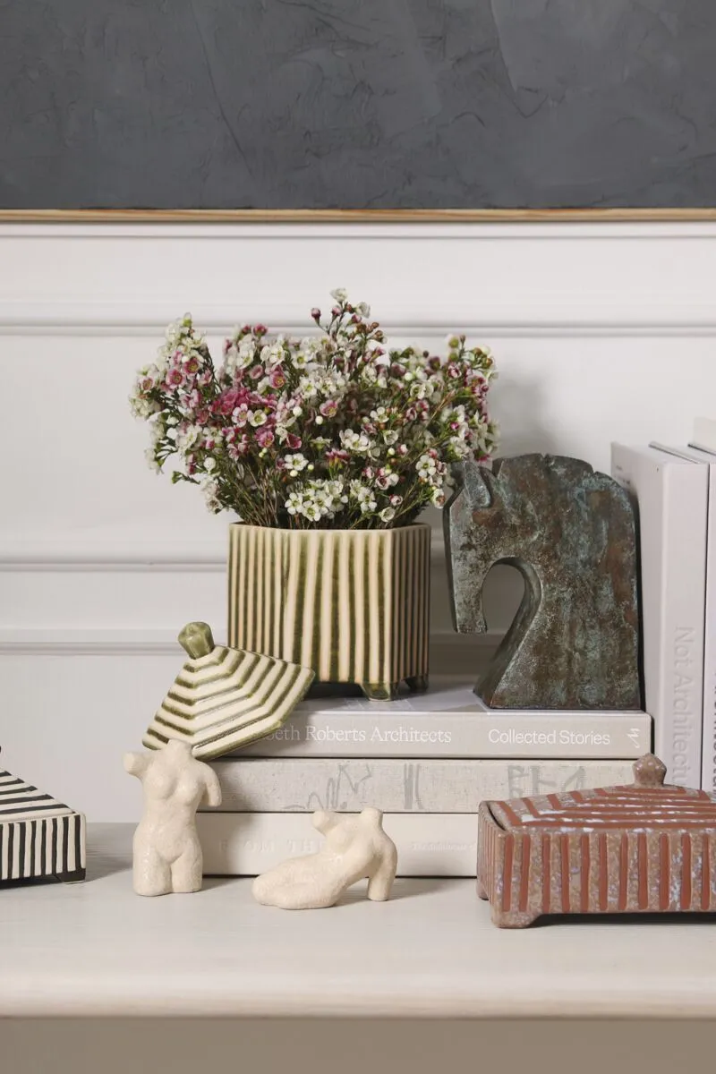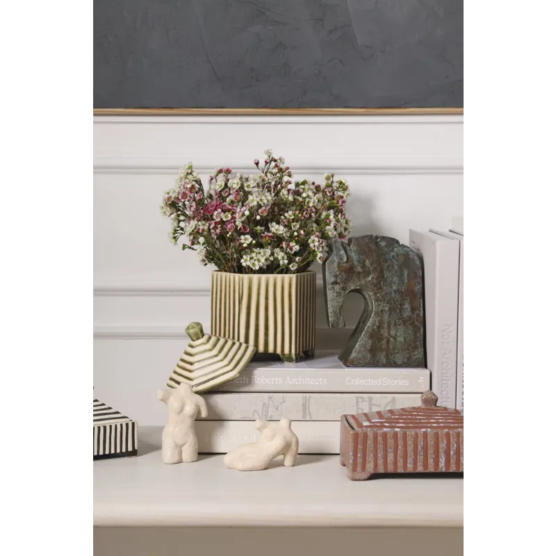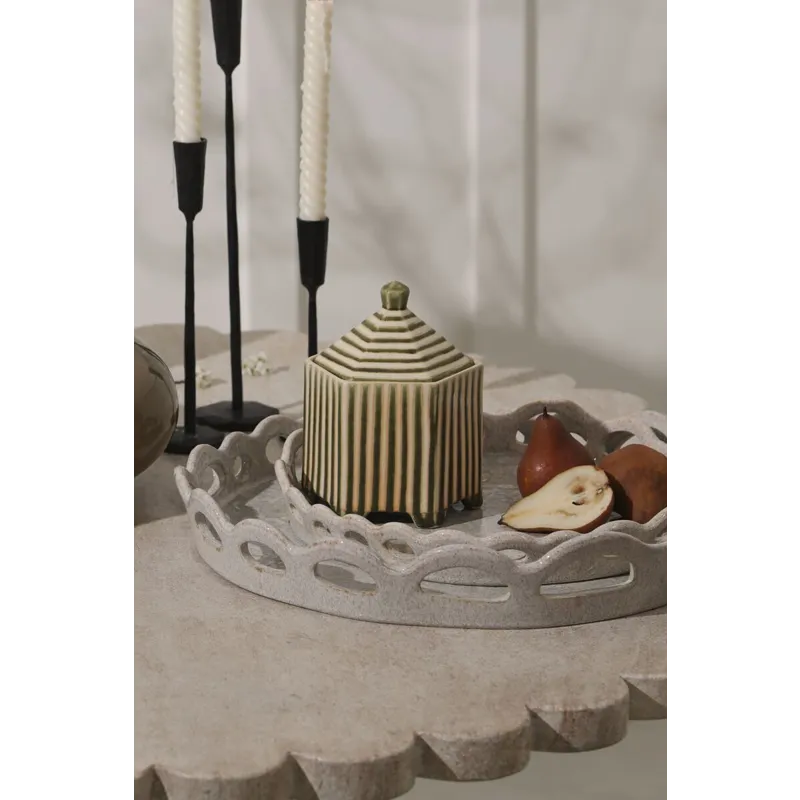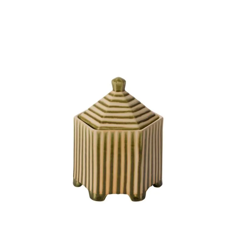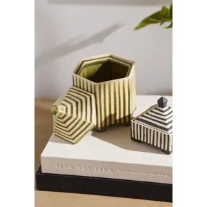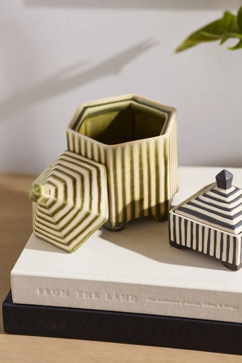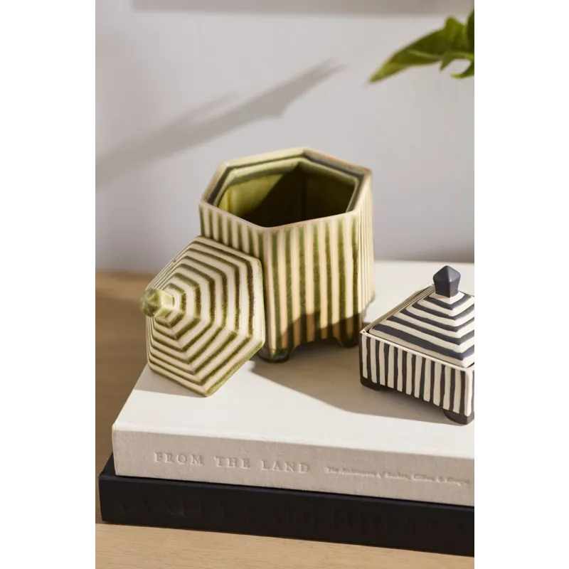 Small with a striking impact, the footed hexagonal ceramic Banda Decorative Box brings functional artistry to any shelf display. Featuring an inset lid that easily lifts off, an off-white ground color with slightly raised green stripes for tactile interest, petite feet, & a reactive glaze, this trinket box is great for stashing matchbooks, jewelry, or other treasures while bringing an artisanal look to home decor.