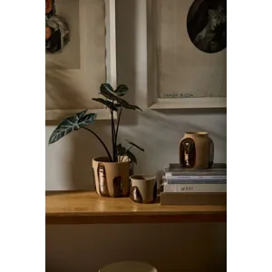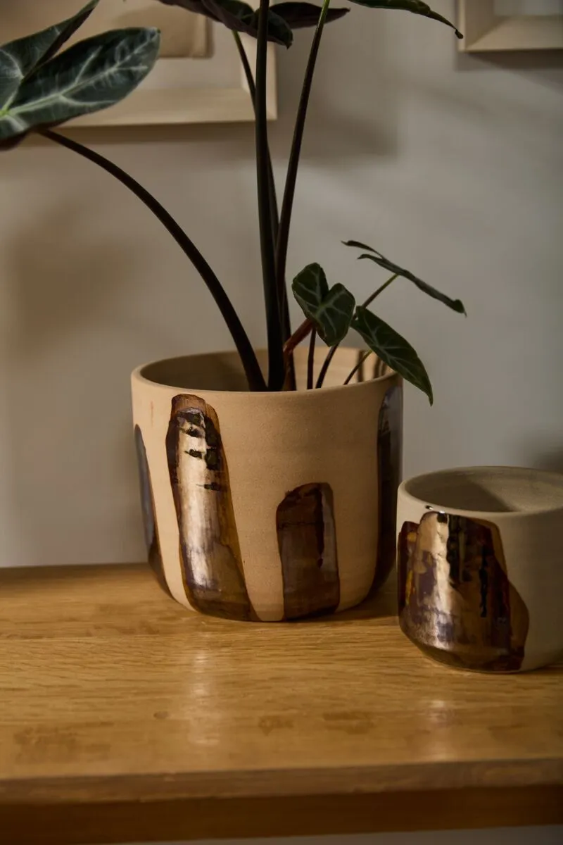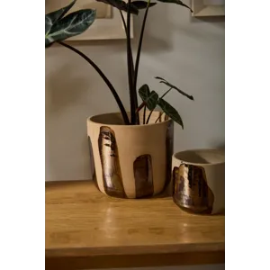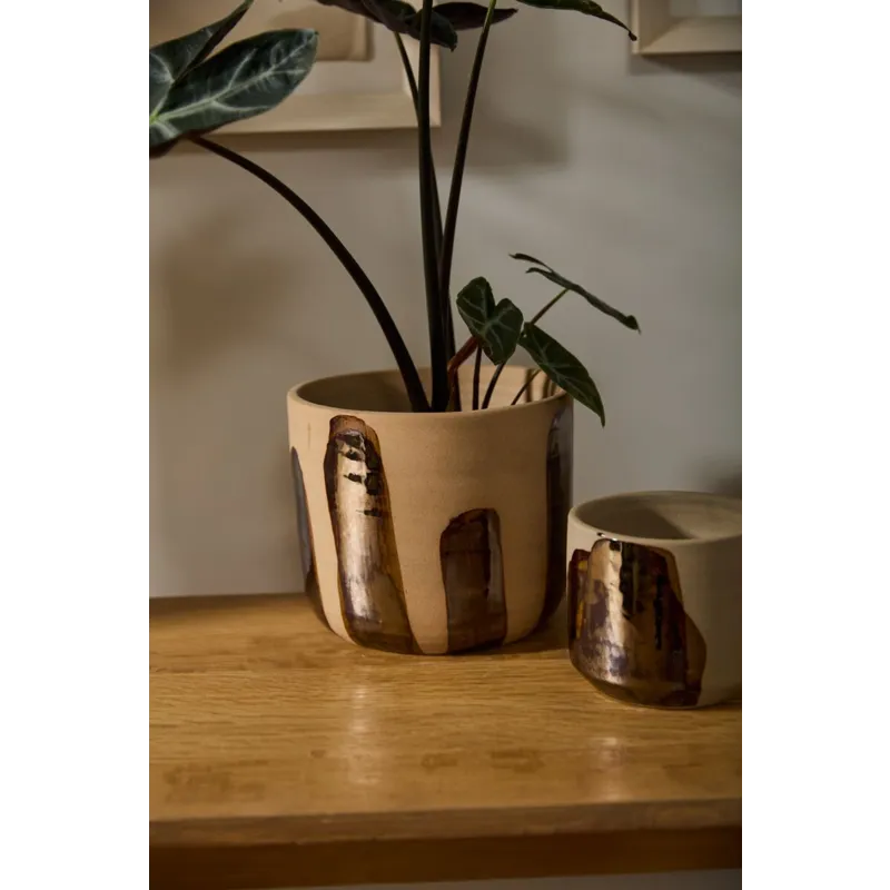Bring an earthy handcrafted look to plants & home decor with the versatile Bronze Brushstroke Pot. This natural tan clay pot features wide brushstrokes of bronze metallic glazing across the exterior. The blend of earthy & metallic tones offers a touch of shine to decor. Fill with a 6.5-inch azalea drop-in plant as a beautiful gift or decorative home accent.