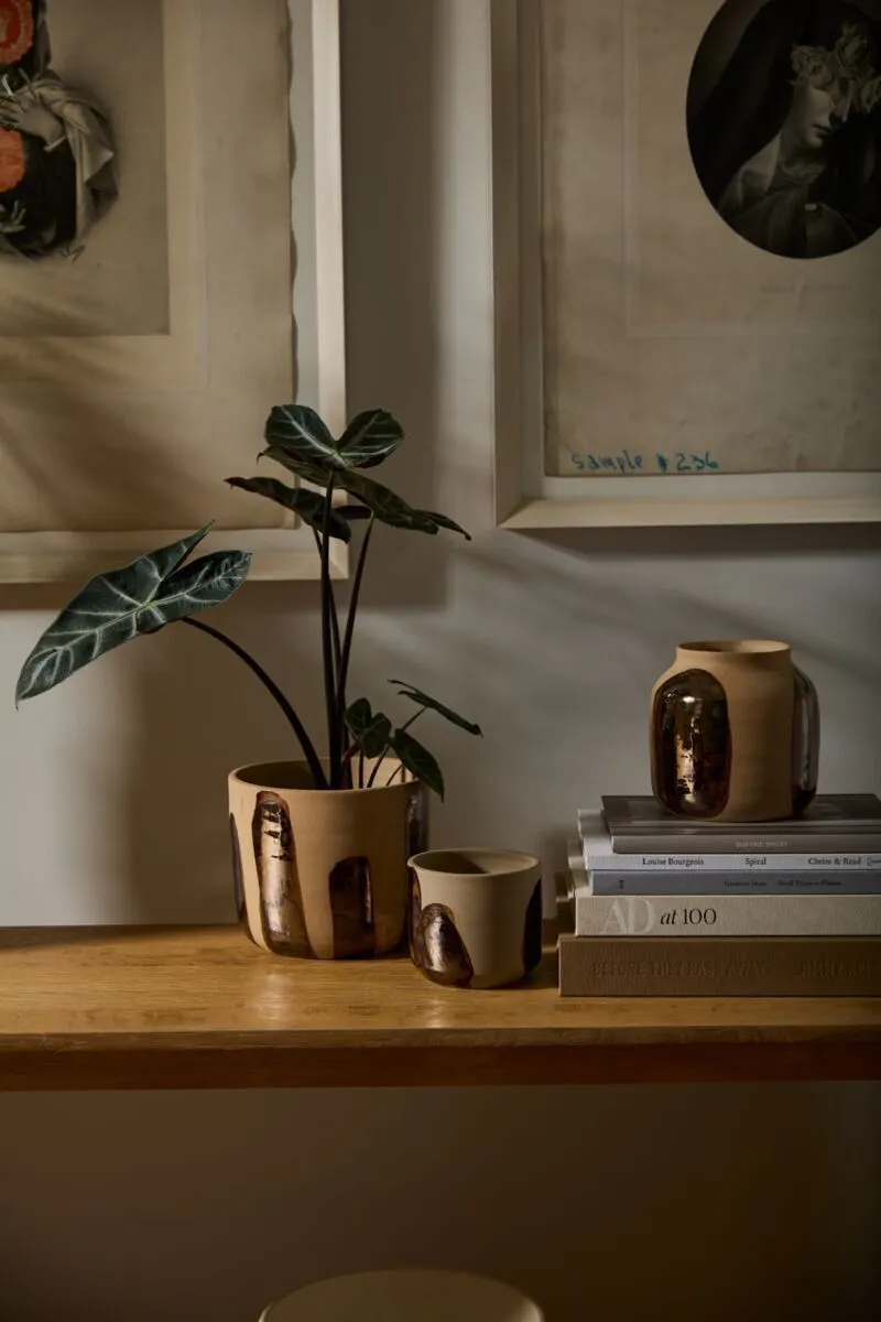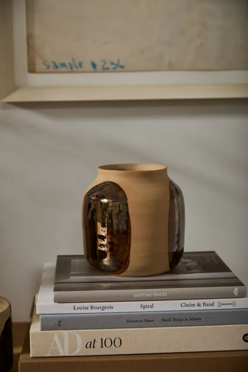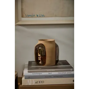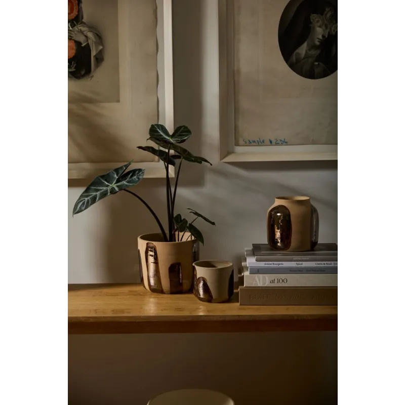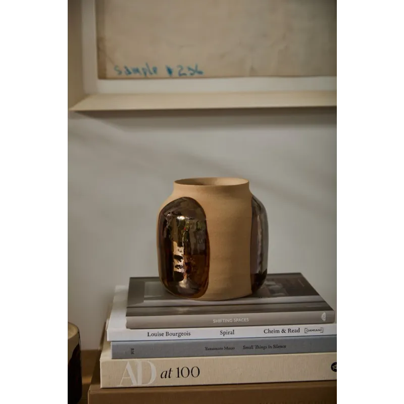 Bring an earthy handcrafted look to florals & home decor with the versatile Bronze Brushstroke Vase. This natural tan clay vessel features wide brushstrokes of bronze metallic glazing across the exterior. The blend of earthy & metallic tones offers a touch of shine to decor. Fill with fresh or dried florals for a gift or decorative home accent.