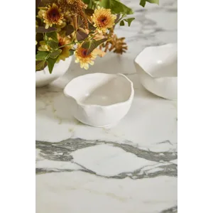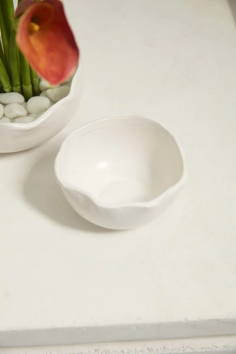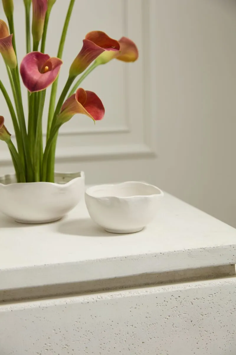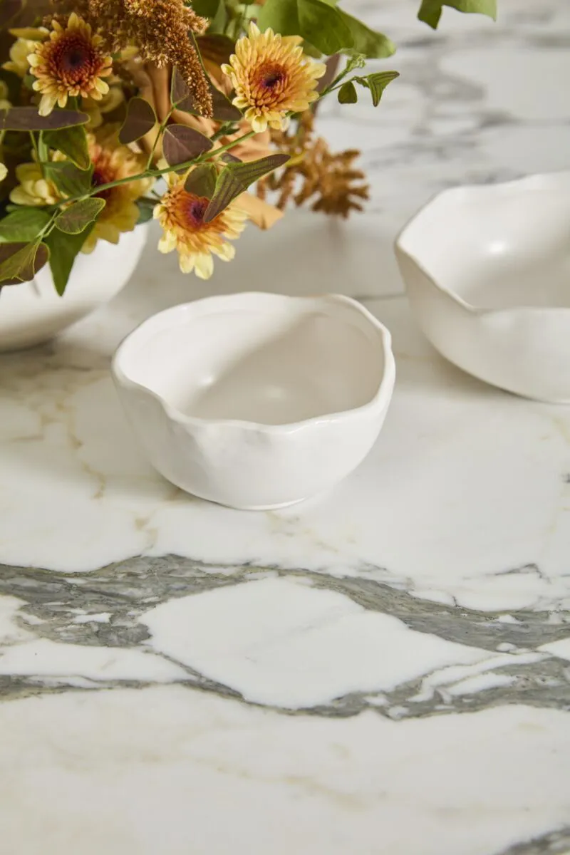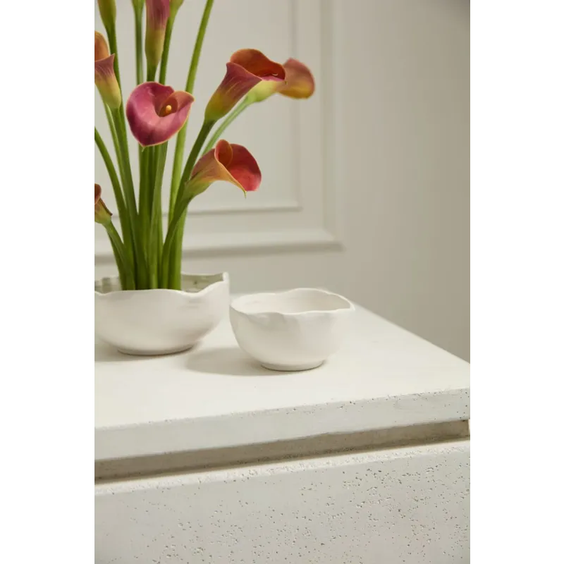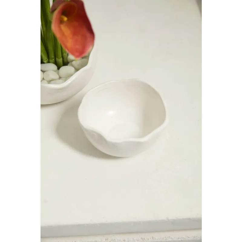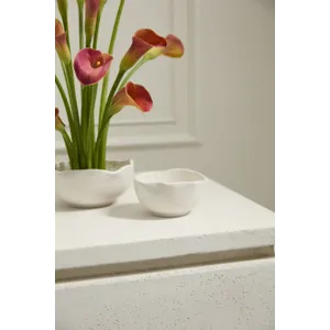 It's easy to make florals stand out with the organic simplicity of the Easy Bowl, a warm white ceramic bowl with an artfully irregular rim. This versatile bowl has a flat base to allow for secure attachment of a flower frog and enough room for any other floral mechanics needed. Perfect for creating smaller scale arrangements to layer down an event table, or for adding a pop of floral color on a small surface, both sizes of the Easy Bowl can be styled with any color palette.
