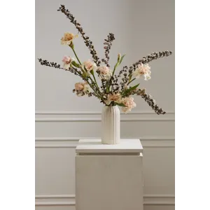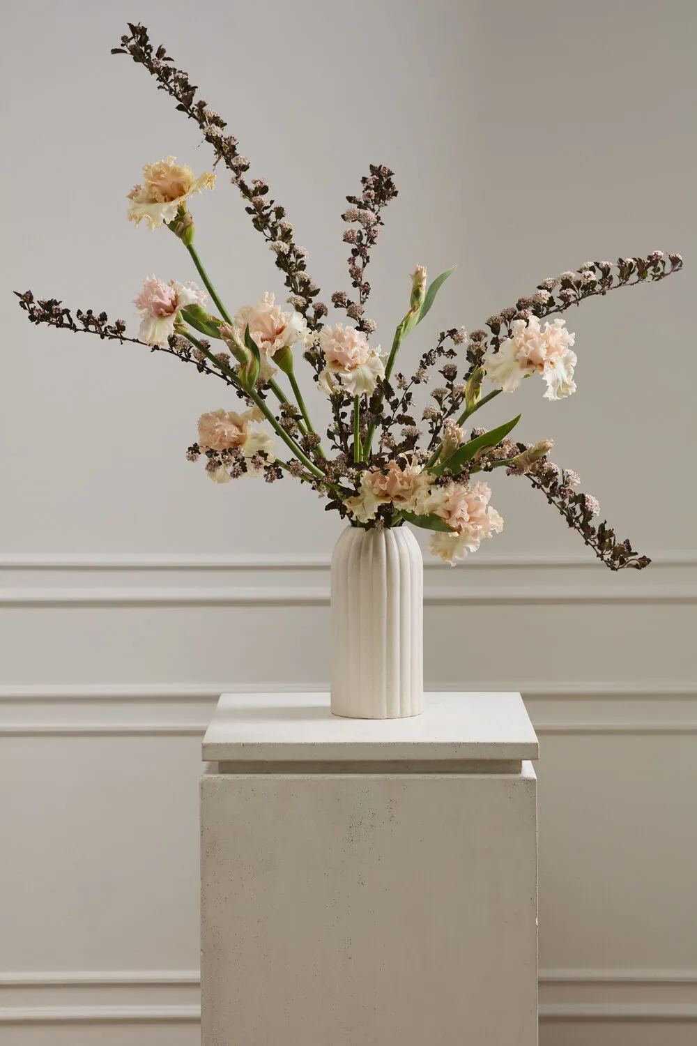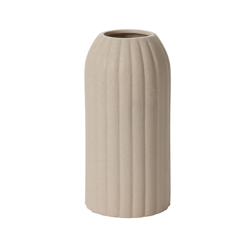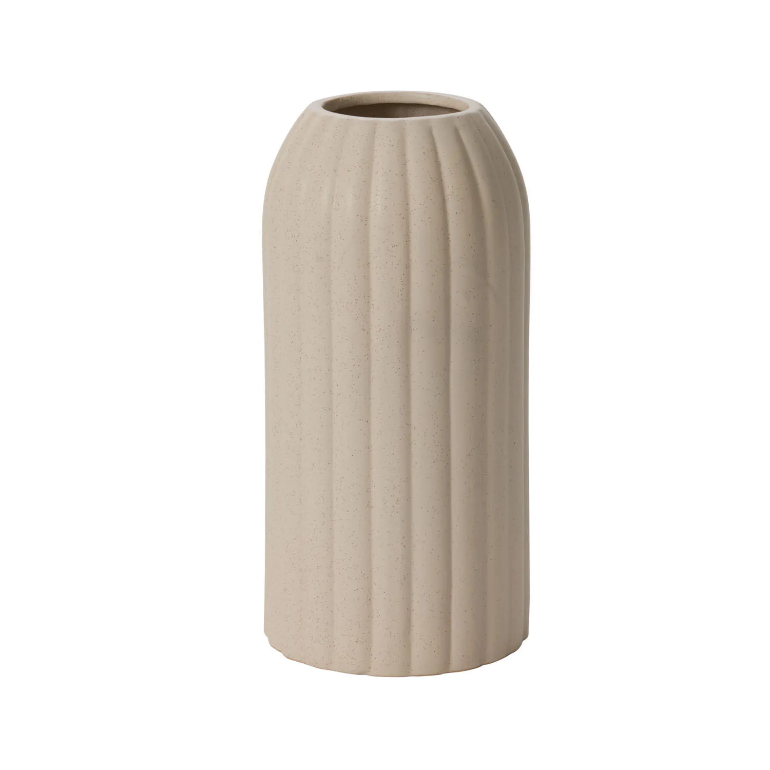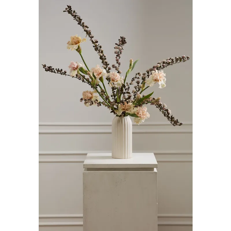 Showcase statement fresh or dried arrangements among home decor or for an event with the large-scale ceramic Heights Vase. Featuring a rounded top, dimensional top-to-bottom ribbing, & a matte white ground color with light grey speckling, this vessel offers a fresh, modern take on the classic cylinder vase.