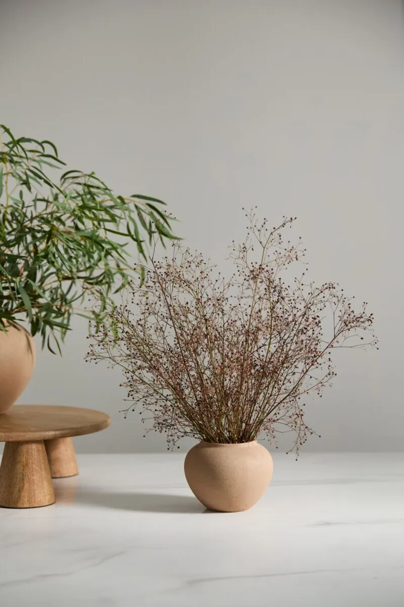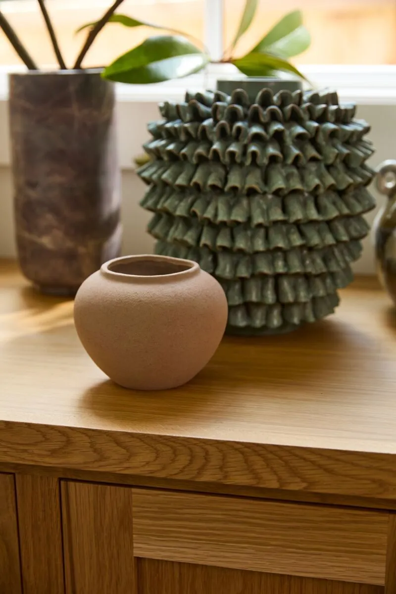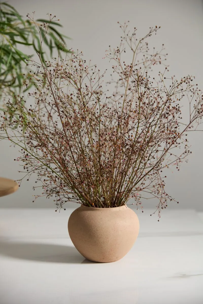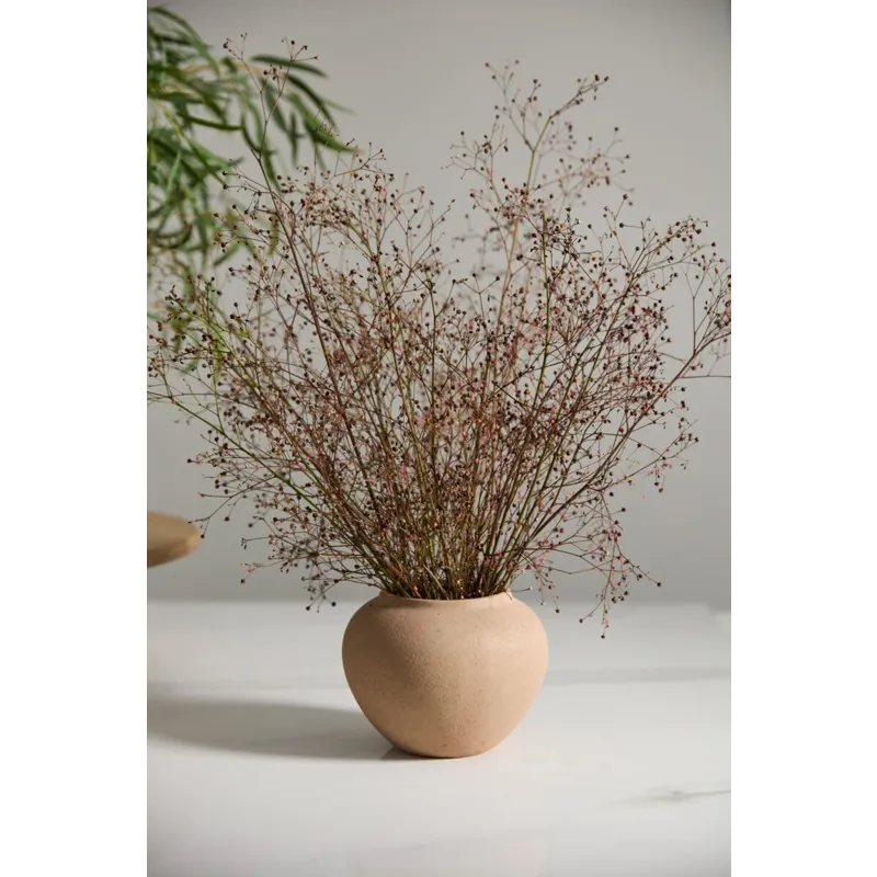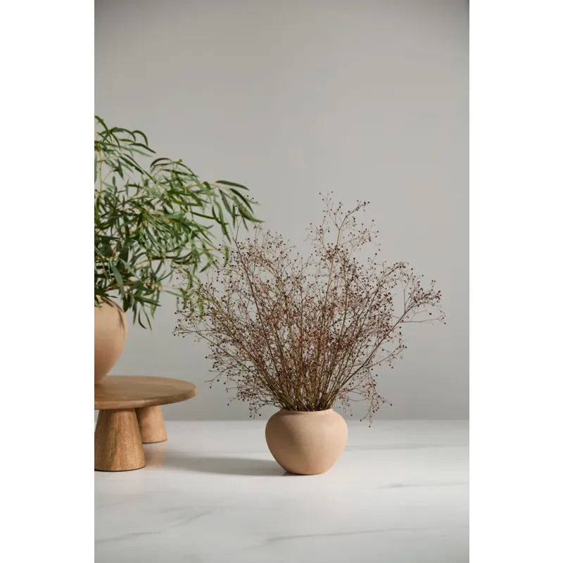 Bring a warm, old-world look & dimensional shape to tablescapes with the stoneware Kastanos Vase. Featuring a rounded rim with a small lip, a neutral shade of brown terracotta, textured matte finish, & subtle surface variation for an aged look, this vessel offers a simple, clean silhouette to shelf decor & coordinates with any color or floral palette.