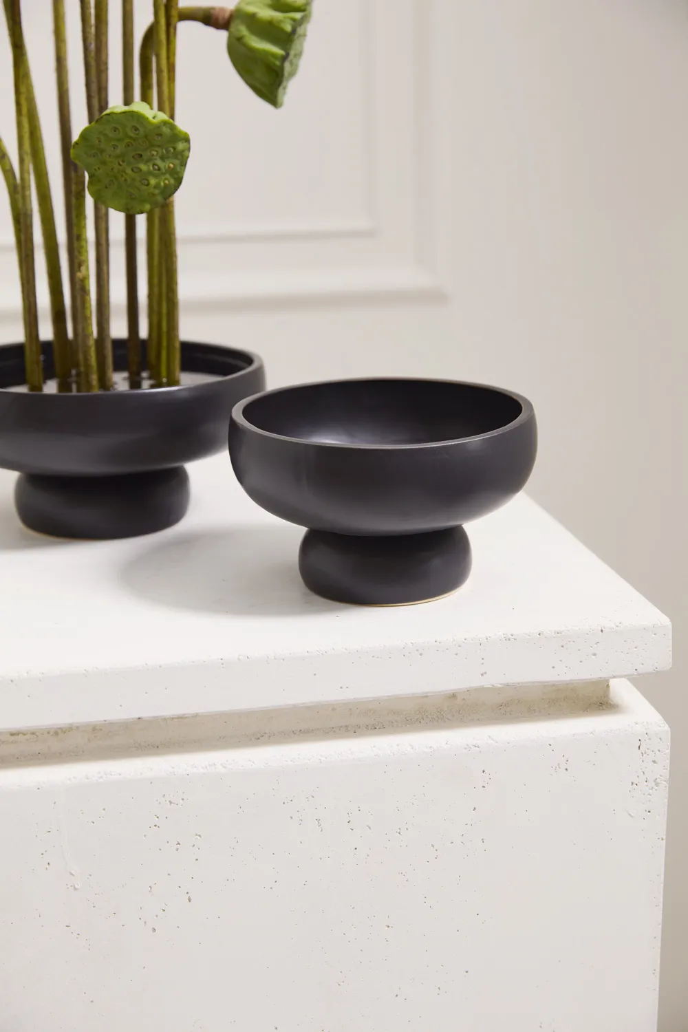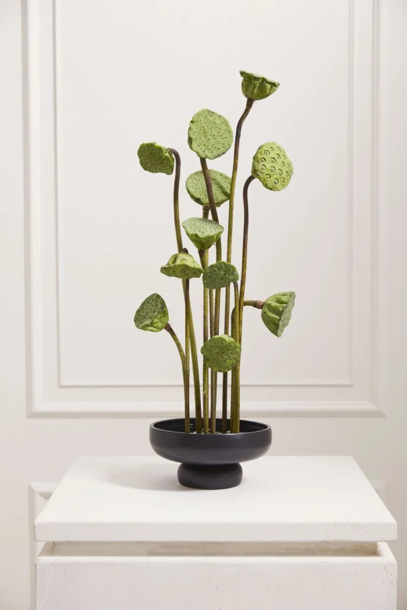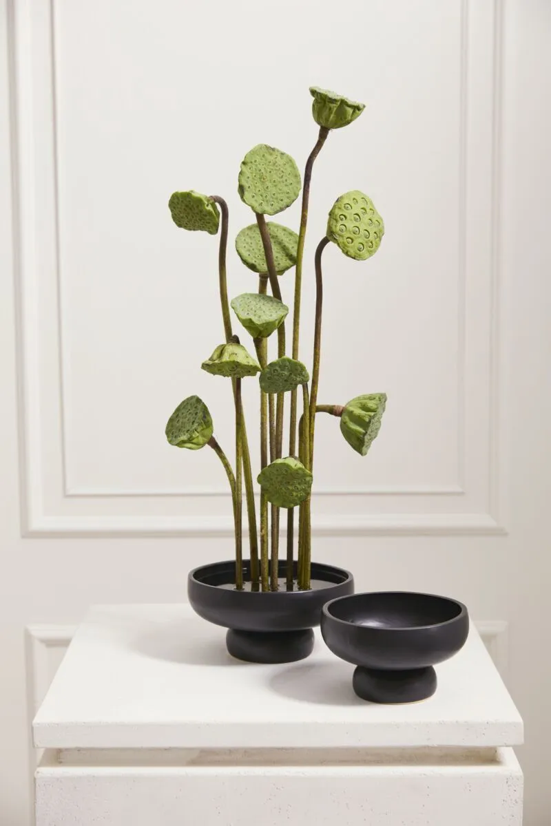 Modern arrangements will shine in the Nightingale Compote, a sleek, matte black ceramic compote with an open foot that accommodates stems and floral mechanics. Perfect for an ikebana inspired arrangement, a flower frog can be placed in the base to support artful floristry. The clean lines and minimal rounded foot of this vessel won't detract from what's on display above. The small size has a low profile and measures just under 4" tall with a 5.5" opening.