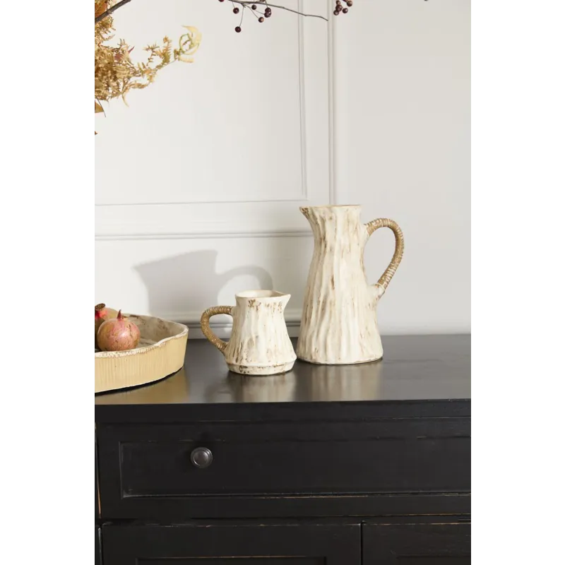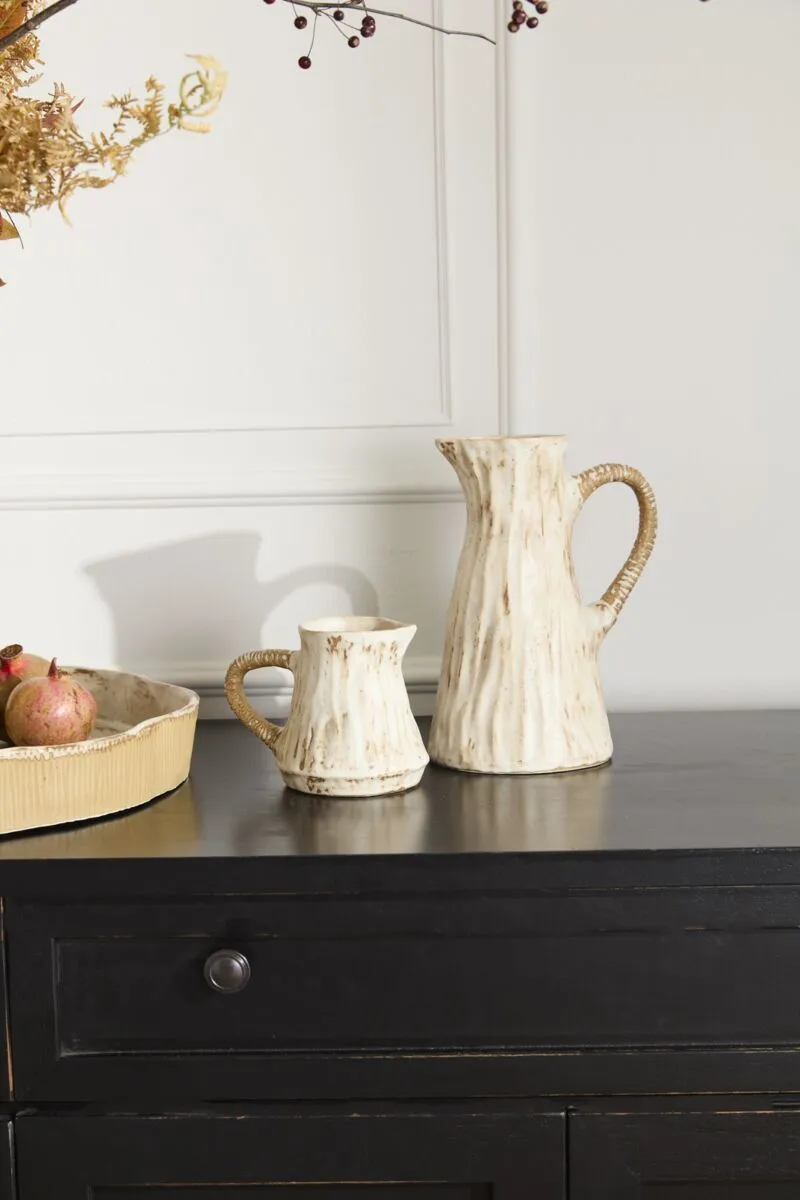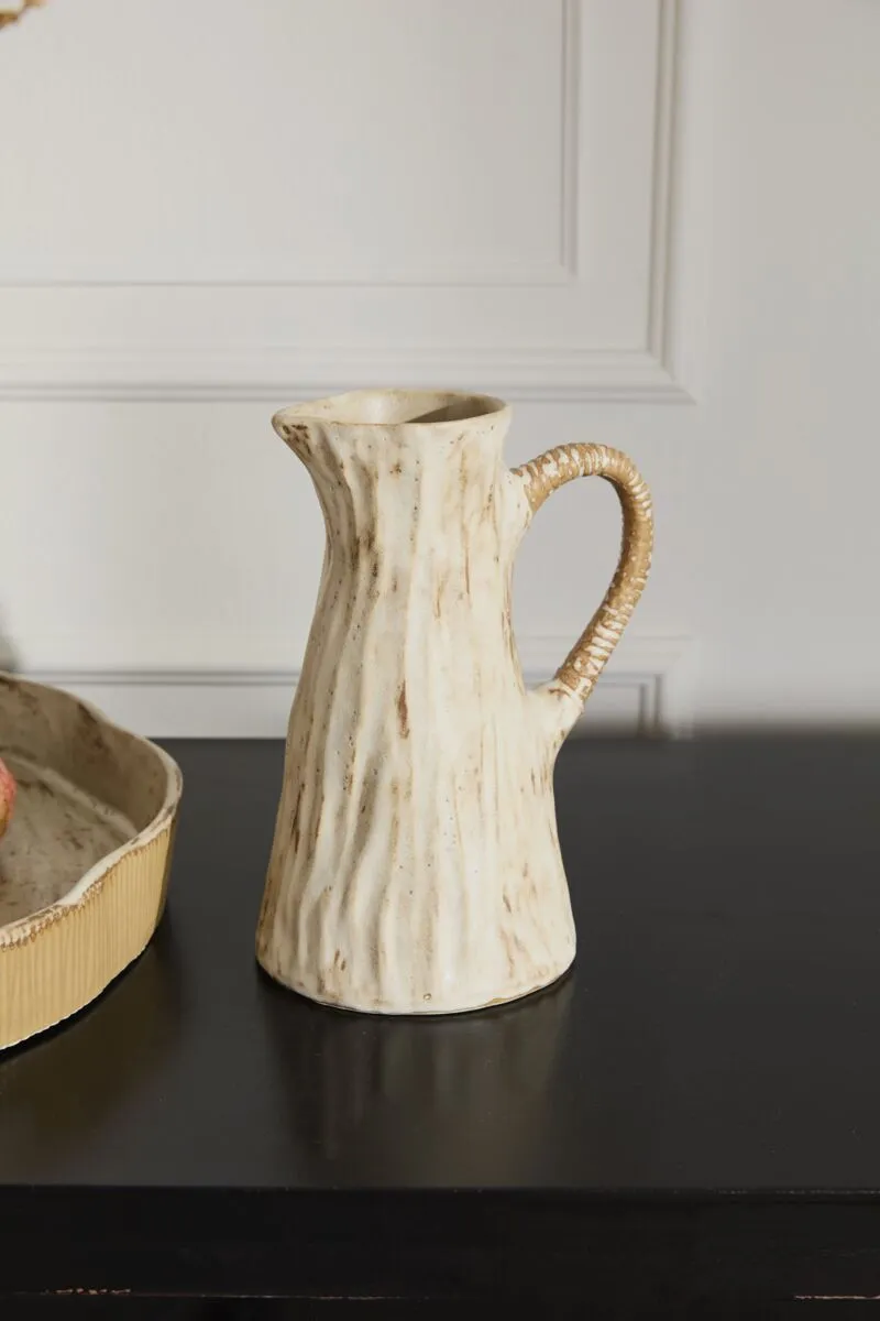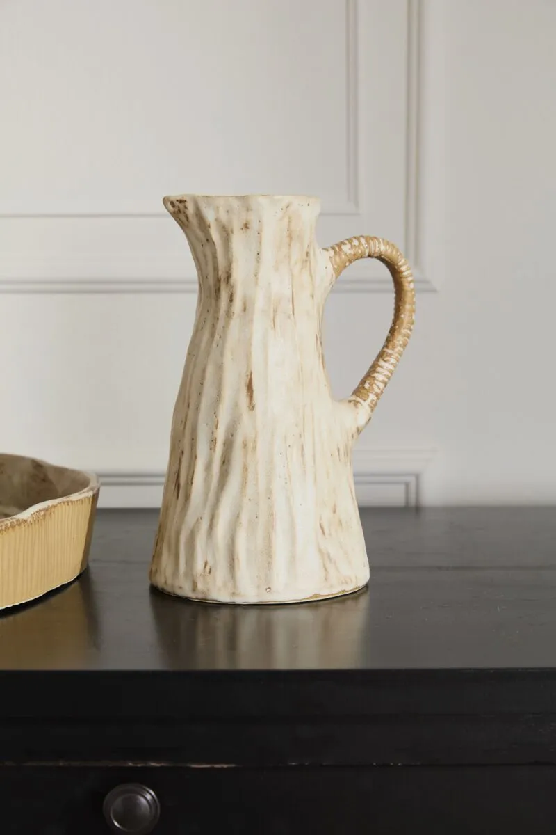 Bring the beauty of nature to the dining table with the large Sycamore Pitcher, featuring a beautiful bark inspired texture and finish. This artisinal pitcher holds 48 ounces, has a wide base, curved handle with carved lines, and an angled spout. Serve beverages family style from both sizes of pitchers alongside the rest of the Sycamore Collection.
