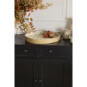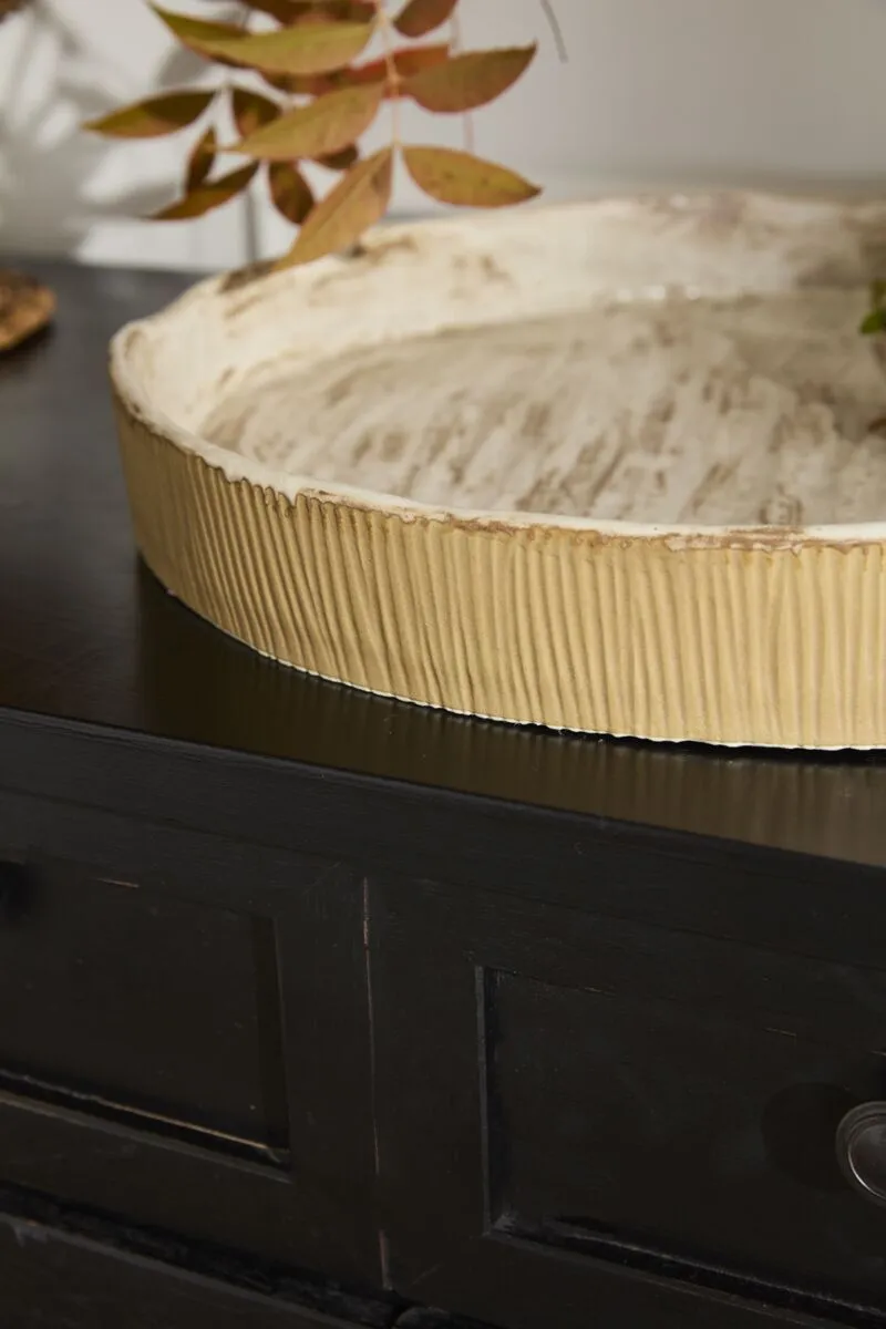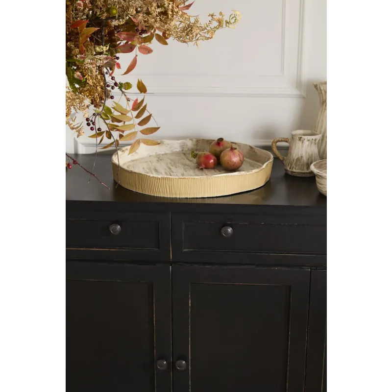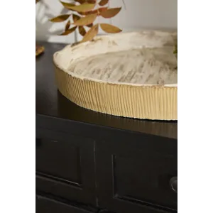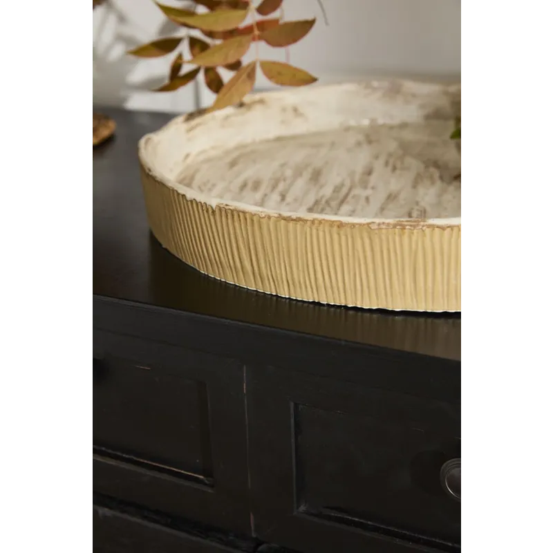 Bring the beauty of nature to the dining table with the Sycamore Tray, featuring a beautiful bark inspired texture and finish around the rim and interior. This artisinal serving tray can be used for hor'deurves, or for displaying a collection of harvest decorative styles. The circular tray has raised sides with carved vertical lines all around the exterior. Serve family style dishes at the table alongside the rest of the Sycamore Collection.