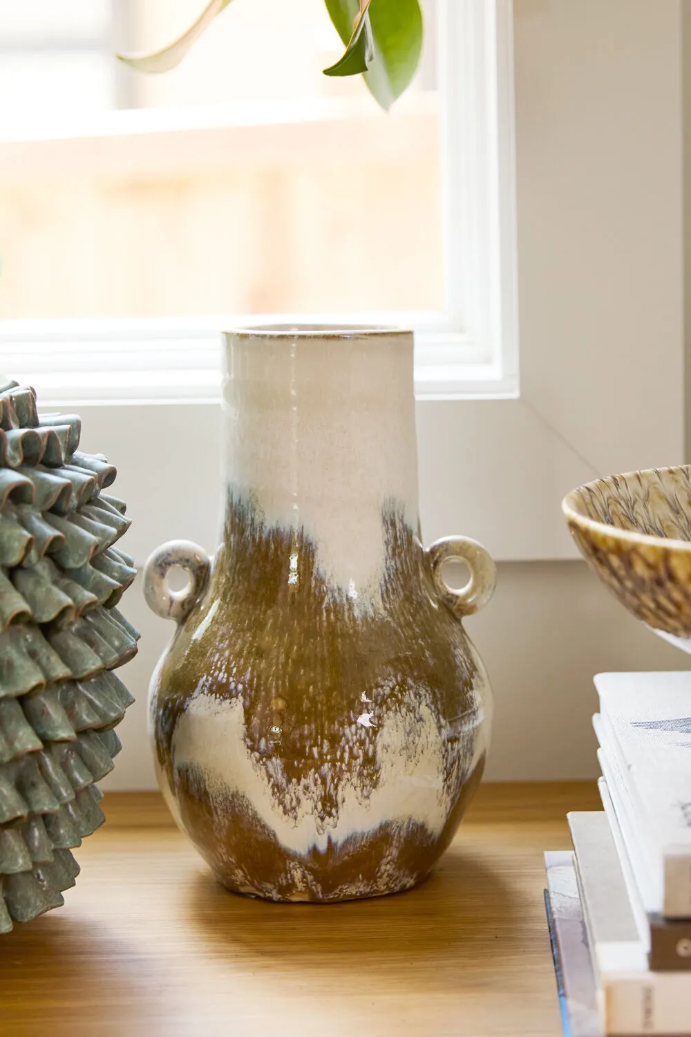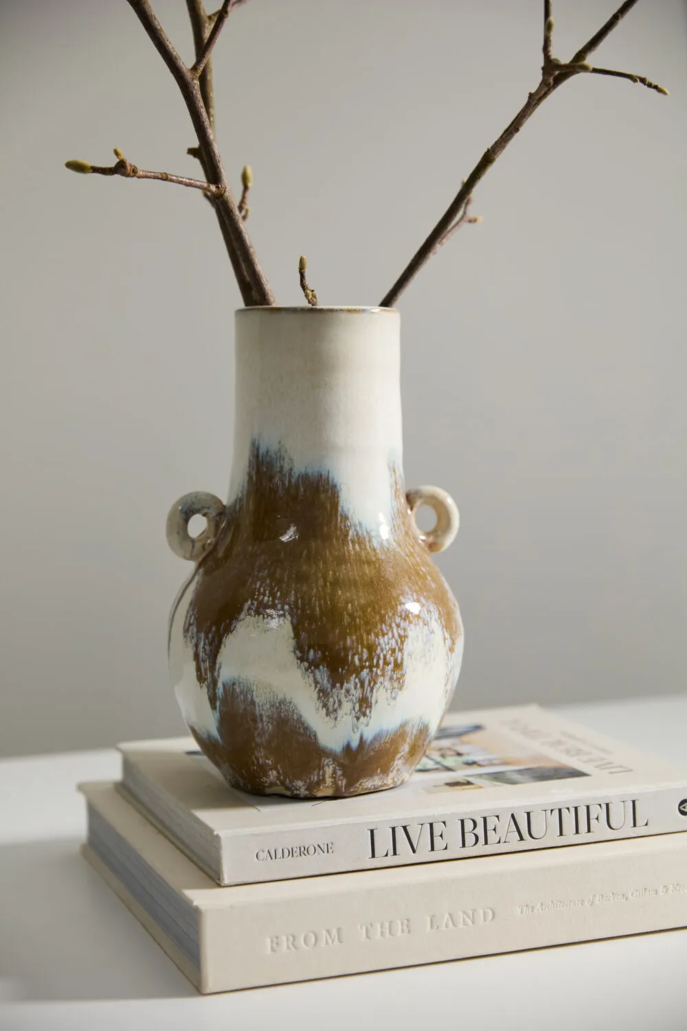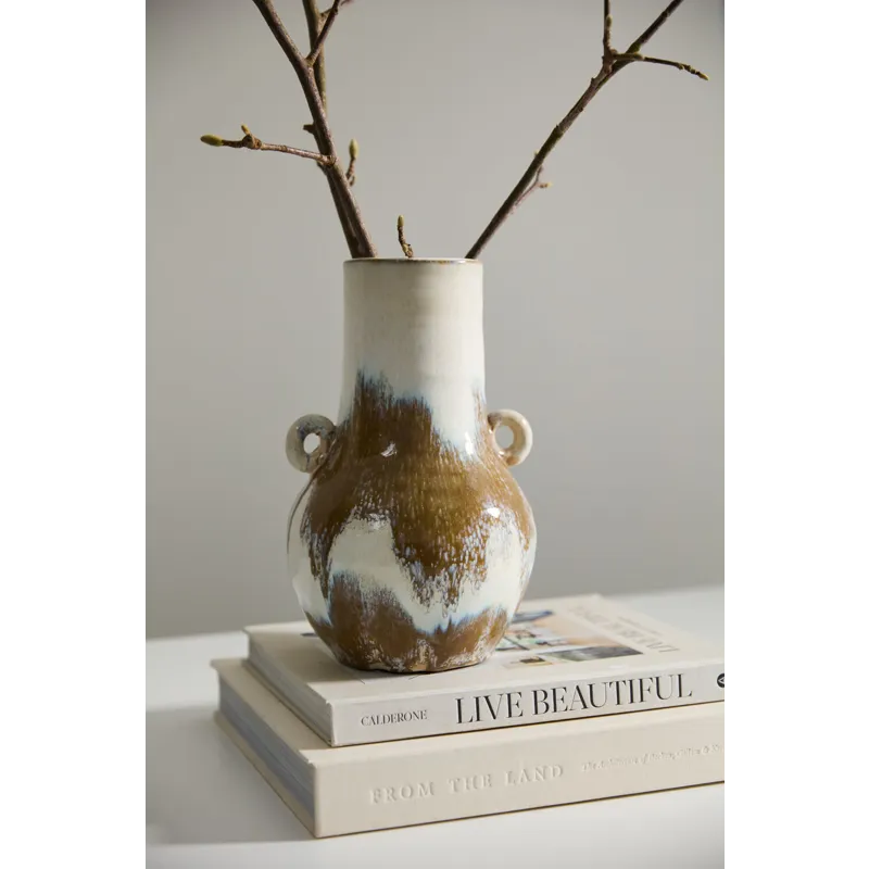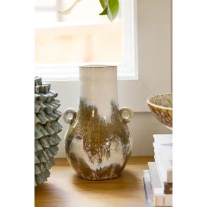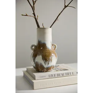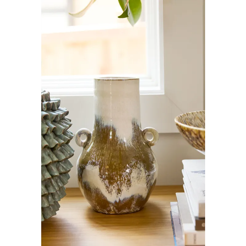 Brushed organic color is an ode to the handcrafted artisanal quality of the tall ceramic Ulysses Vase, featuring a round base, cylinder neck & opening, & 2 small circular handles. With a warm white base color & hand painted glossy finish with brown brush strokes, each piece is unique in its unique color application. This vessel's medium scale makes it a lovely, floral-friendly addition to a shelf, coffee table, or home console.
