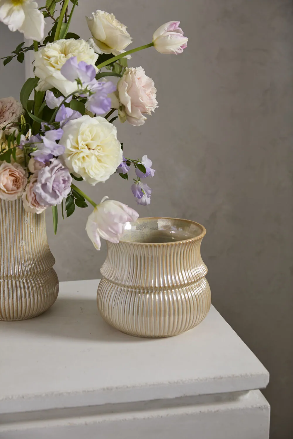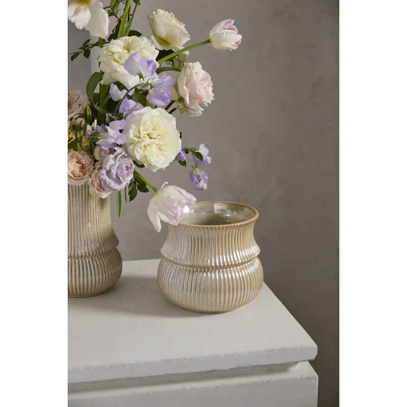 With delicate curves & interesting ribbing, the ceramic Verdant Pot gives drop-in plants an eye-catching home to thrive without overpowering. With its larger scale & off-white opalescent finish, this versatile pot is ideal for both plants or vibrant florals & pairs nicely with both Verdant Vase & the green colorway for everyday or event displays.