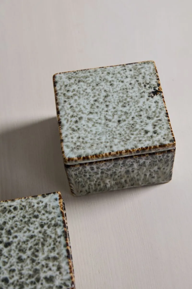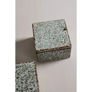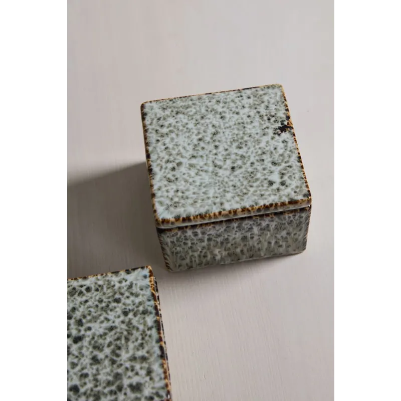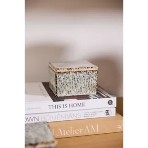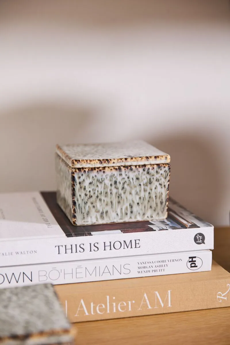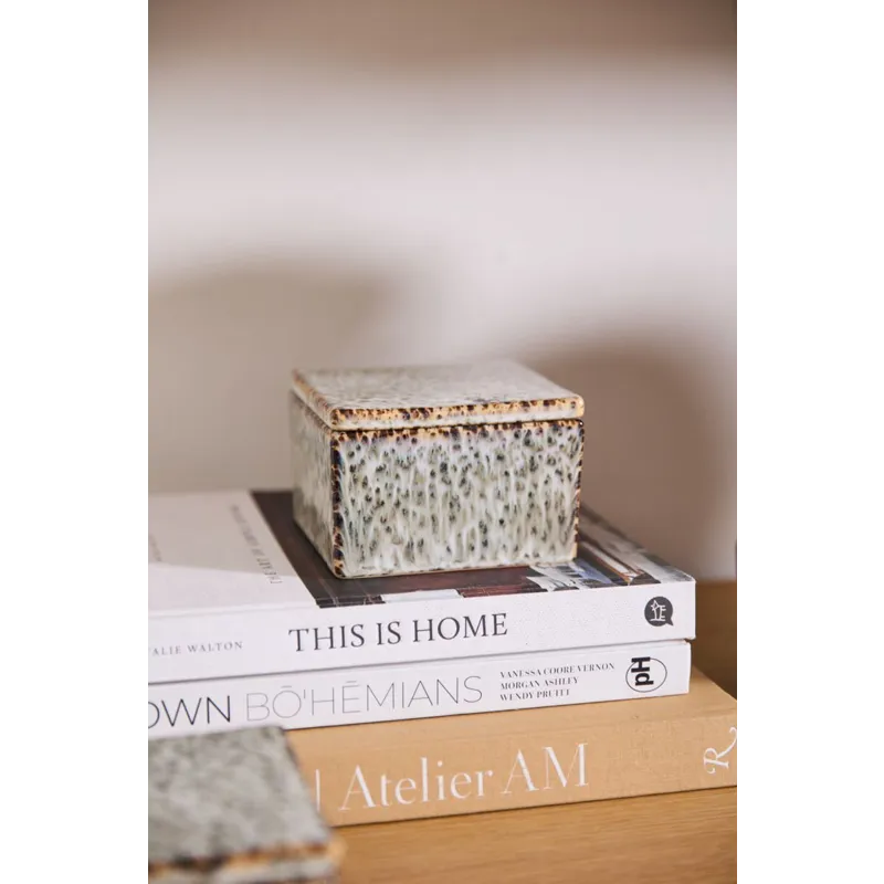 Display artisanal style anywhere in the home with the stunning Whisper Lidded Box. This square ceramic box features a removable lid, smooth glossy finish, & a reactive glaze of grey, green, tan, & blue flecked over a neutral off-white base. Each box is unique with surface variation & perfect for hiding trinkets, storing jewelry, & arranging on styled shelves as a decorative home accent. Layer with the coordinating Starling & Freestone Collections for intentional home decor.