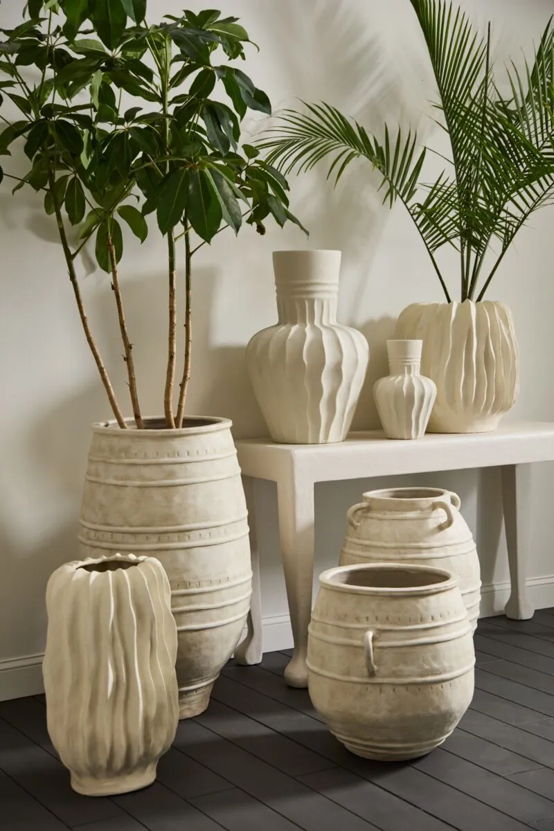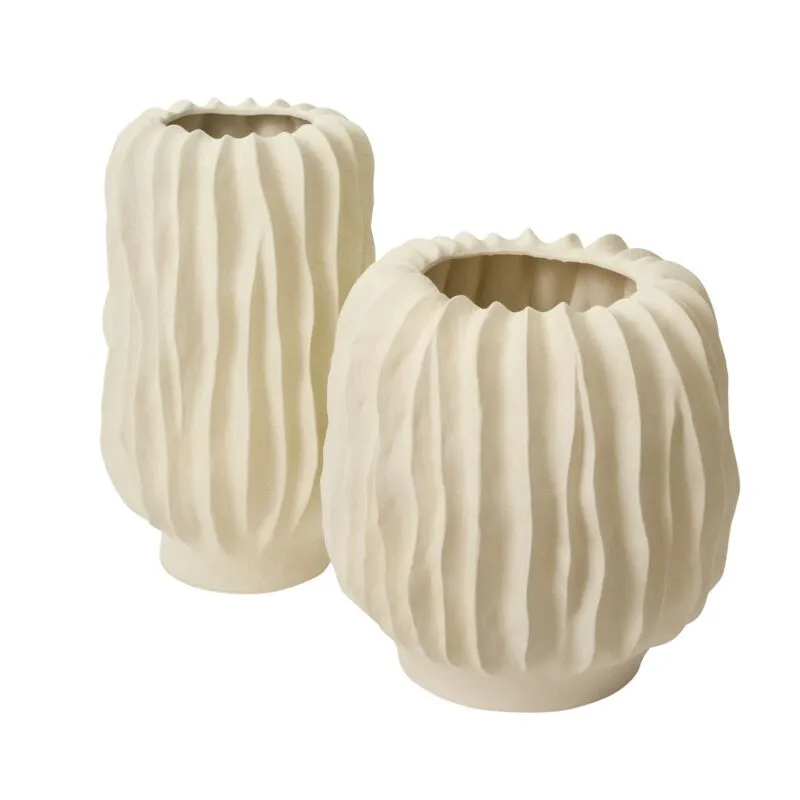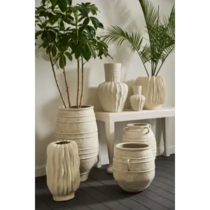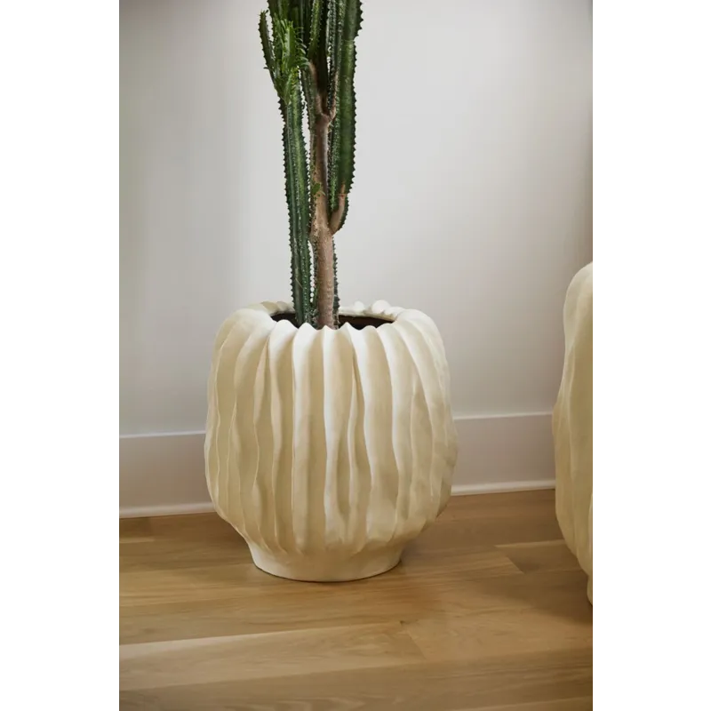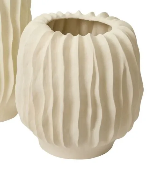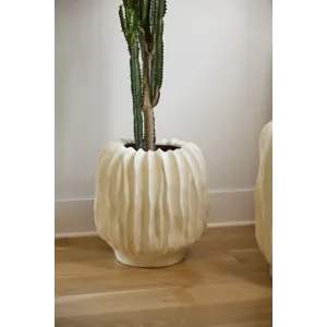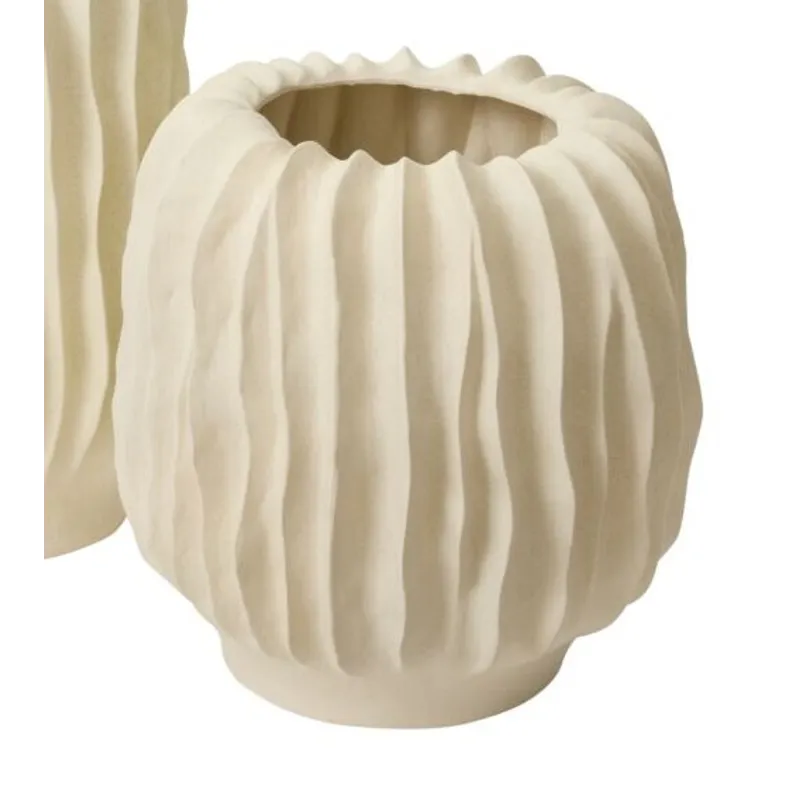 Get swept away with the old-world look & dimensional intrigue of the large ceramic Windswept Pot. This vessel is perfect on a large surface or the floor & creates an eye-catching moment with its rolled lip, rounded bottom, & deep, organically shaped waves that stretch from top to bottom. An off-white tone is versatile & timeless, perfect for highlighting bright bouquets or plants. Layer the 2 Windswept silhouettes together for a dynamic display.