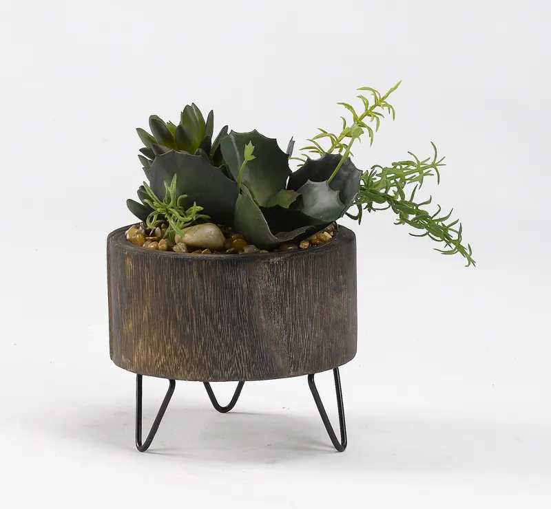 Assorted Succulents in Round Wooden Planter w/Wire Legs