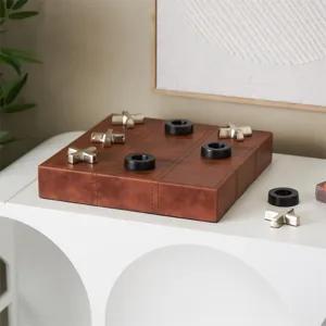 Brown Faux Leather Tic Tac Toe Home Decor Game Set with Black and Silver Pieces