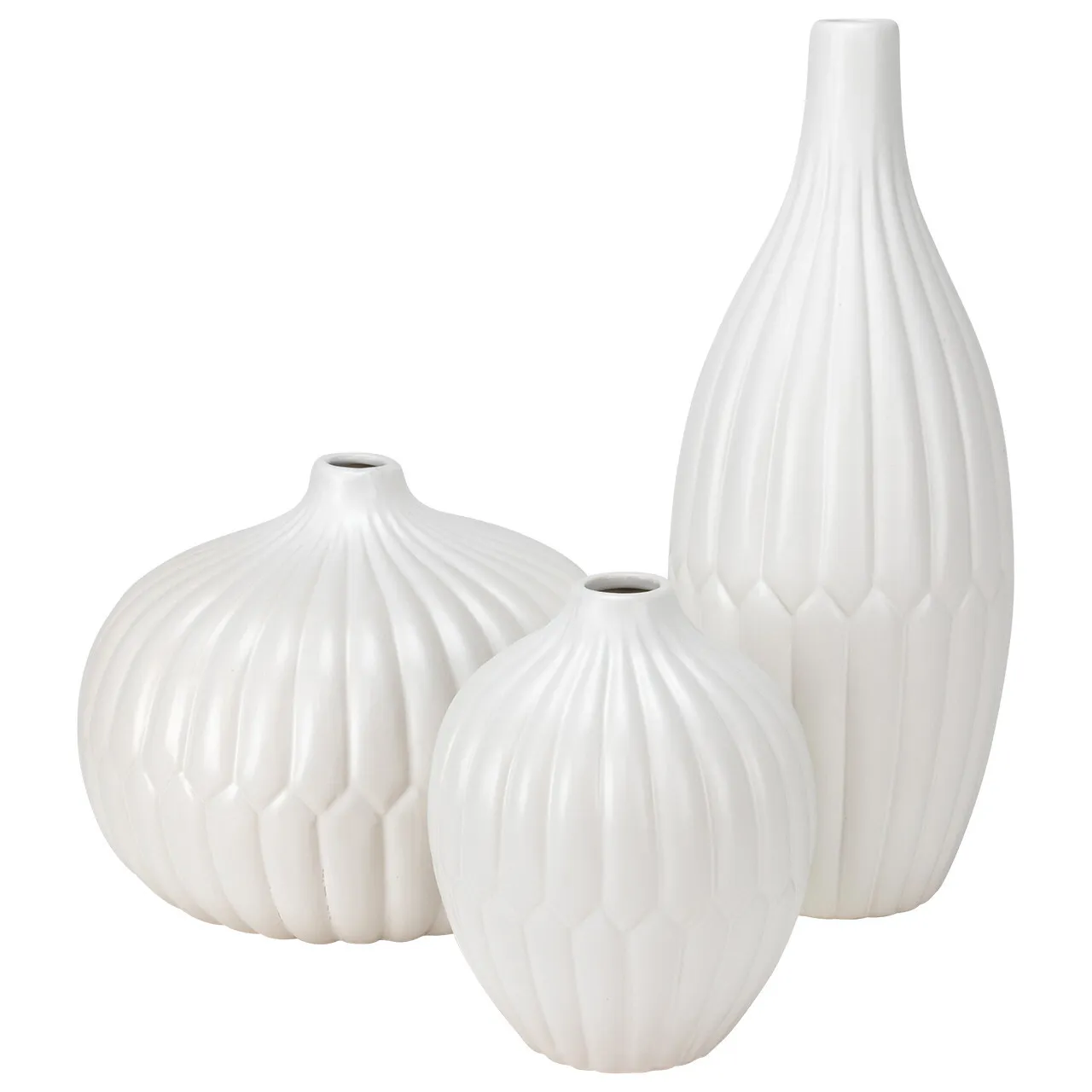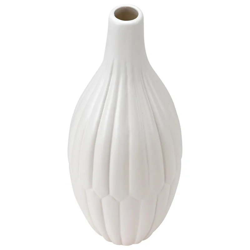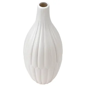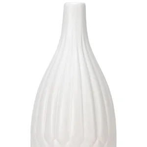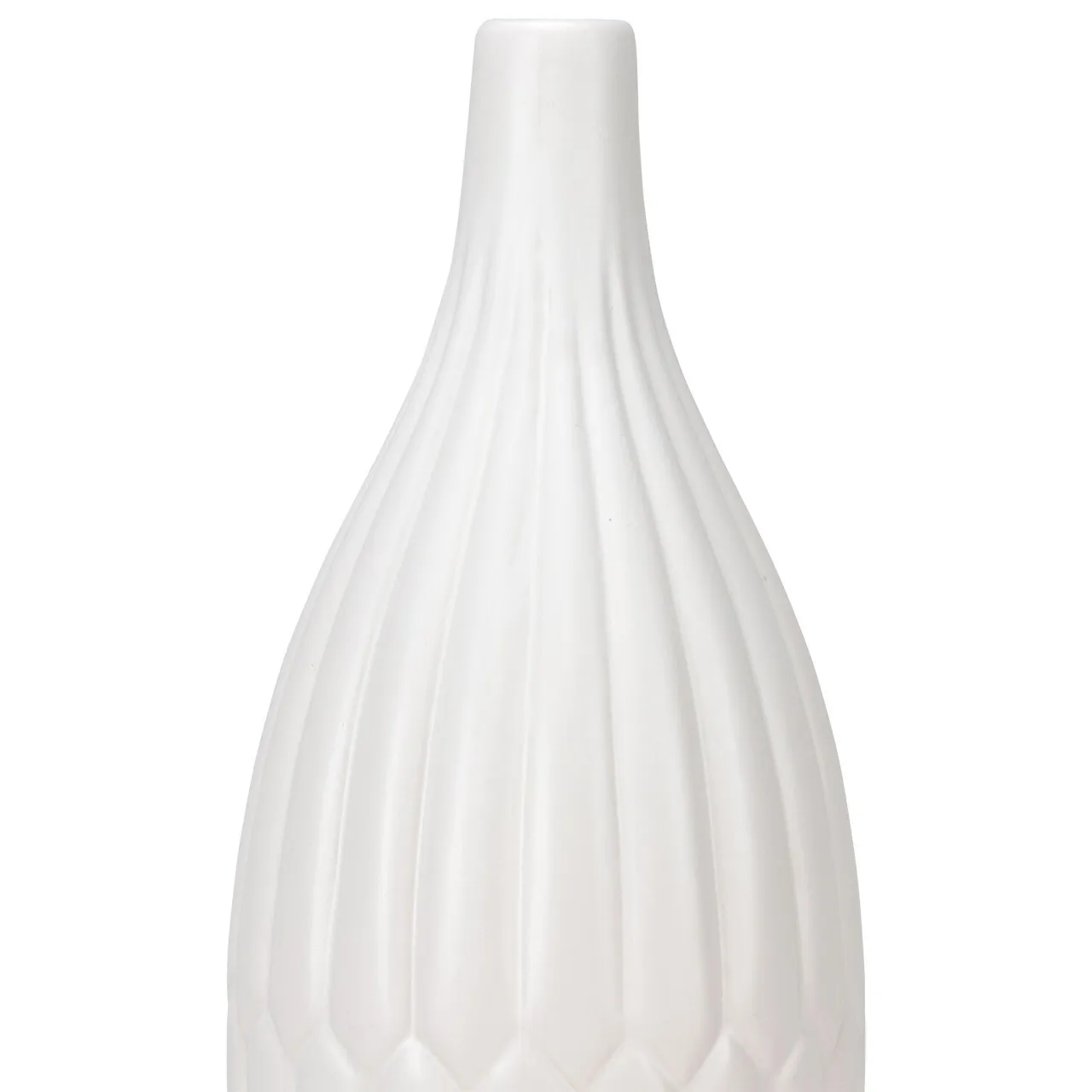The Wisnery Large Vase embodies sleek, contemporary elegance in every detail. Crafted from premium stoneware, this modern home decor piece showcases dramatic vertical ridges and a pristine matte white finish that creates captivating depth and dimension. Standing tall at 15 inches with a slender 6-inch diameter, this sculptural vase is perfectly proportioned for dining tables, console tables, or shelving displays. Its elongated silhouette with a refined narrow opening creates a striking profile, while the neutral white colorway adapts seamlessly to both minimalist and traditional decor styles. Perfect as a standalone statement piece or paired with dried botanicals, this versatile table vase adds modern sophistication with its clean lines and architectural presence.