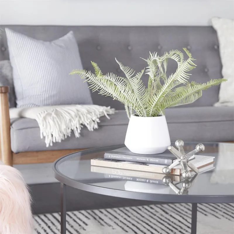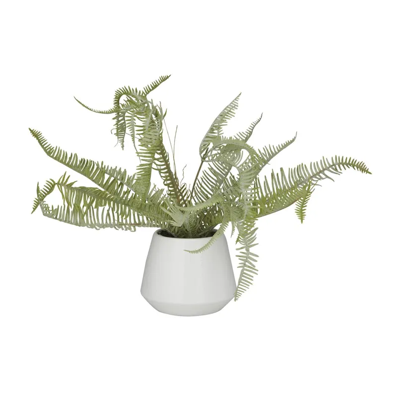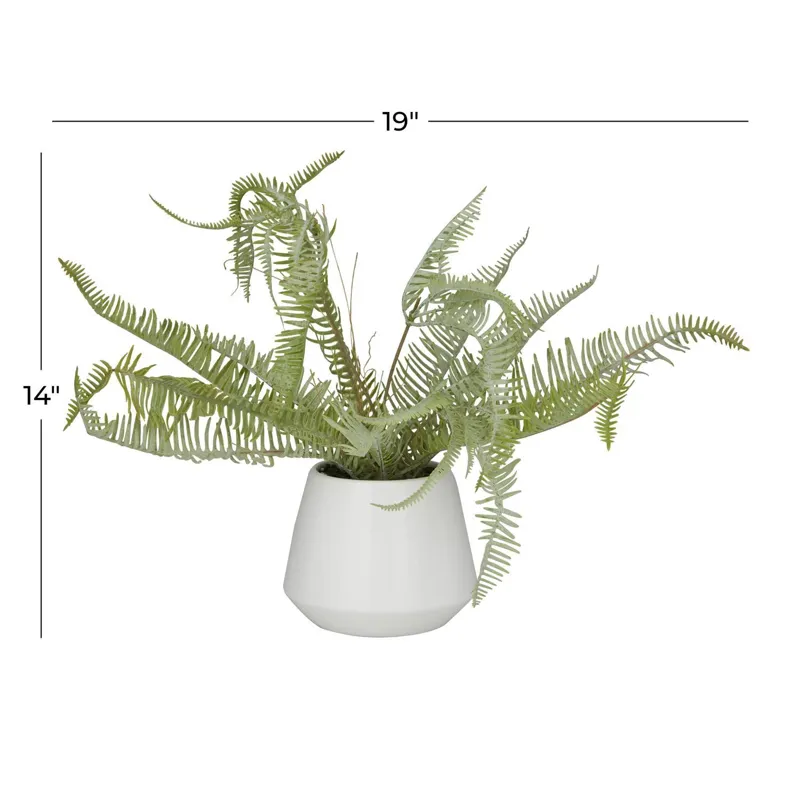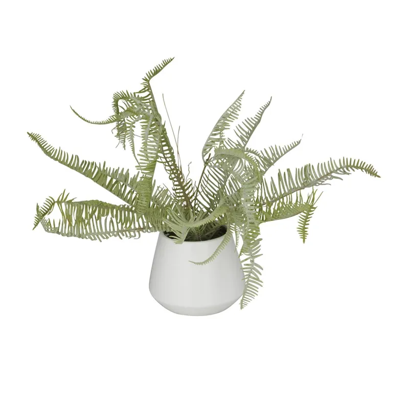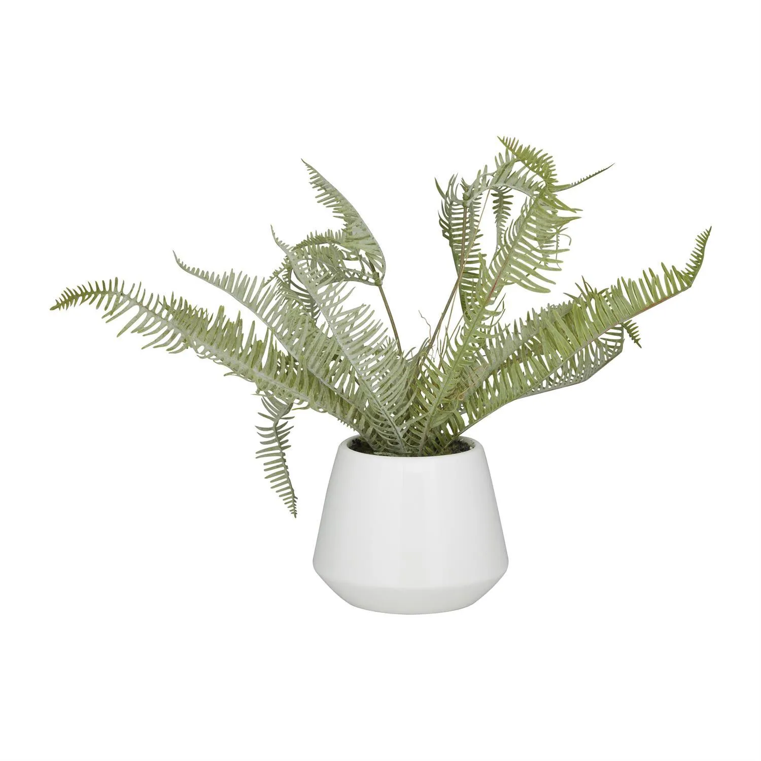 - The contemporary artificial plant home decor features molded and painted plastic material to create fern leaves, which are placed in a molded ceramic vase with Styrofoam and cement fillers