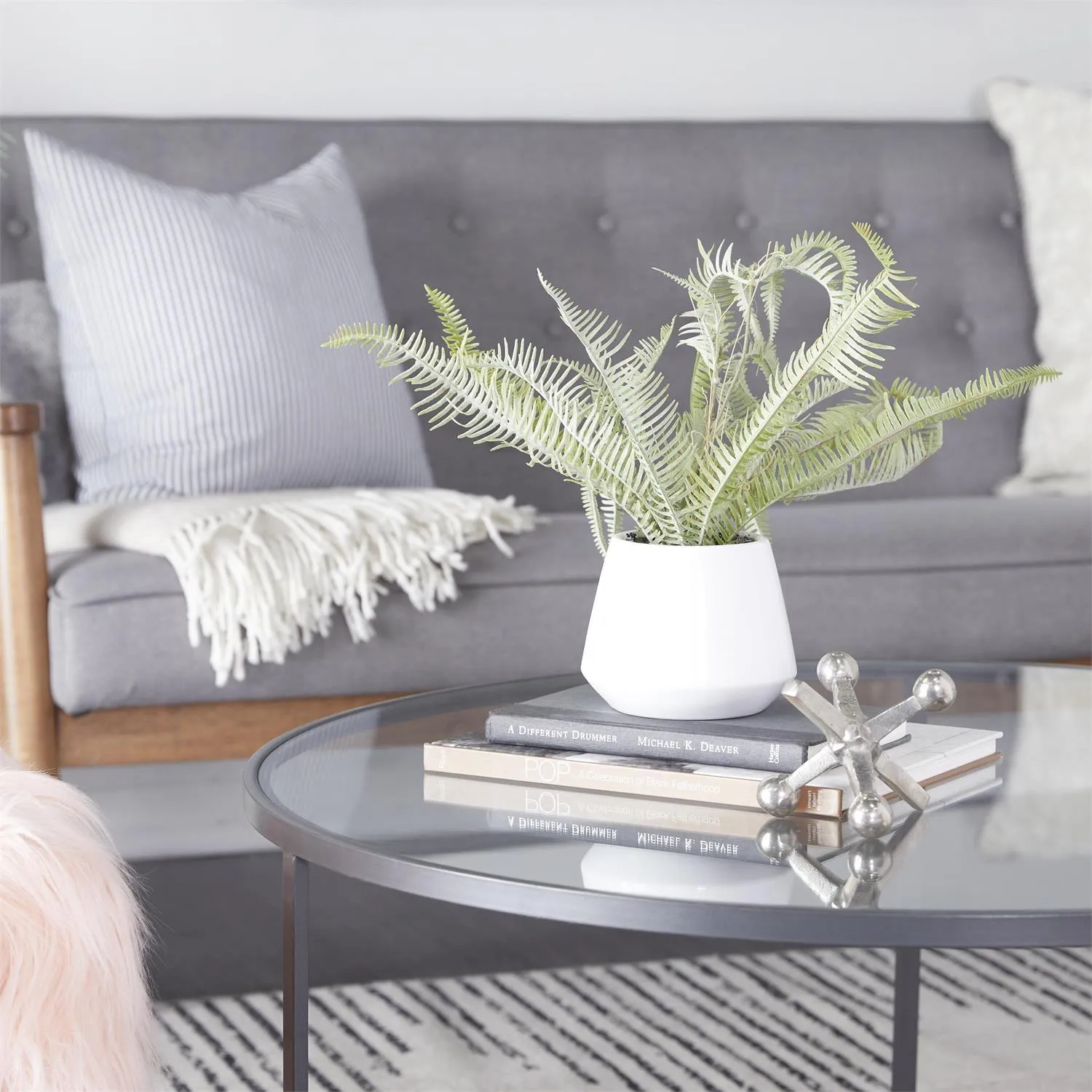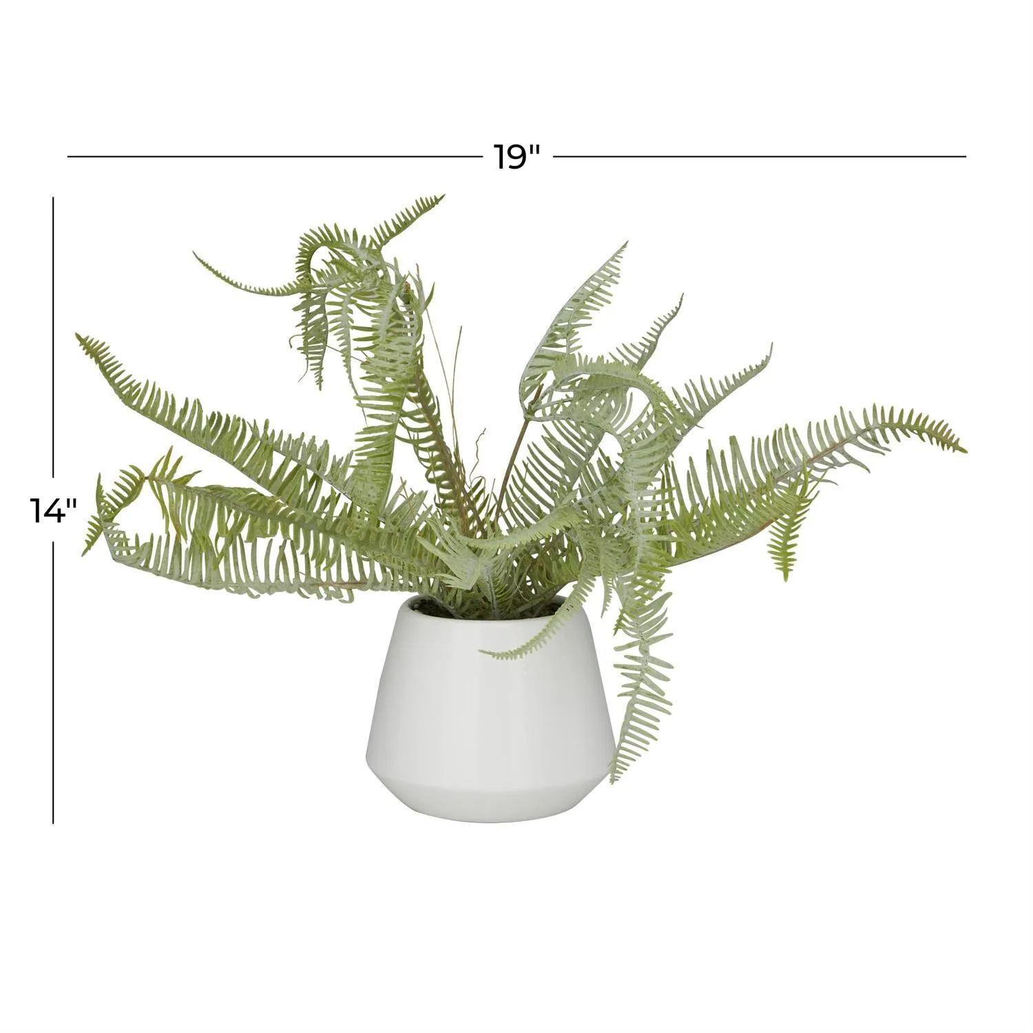 - The polished green faux plant boasts intricate fern shapes within a round tapered vase that adds depth and dimension