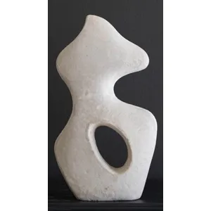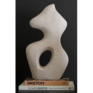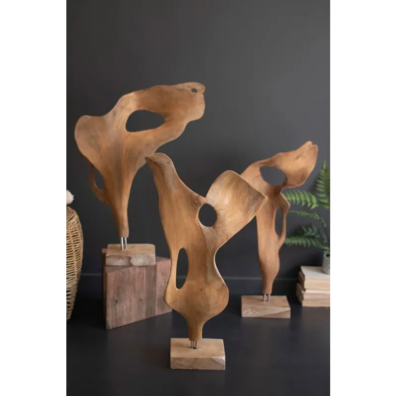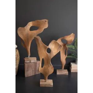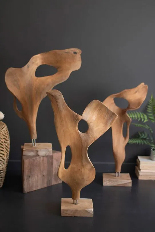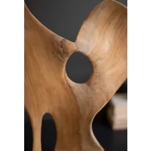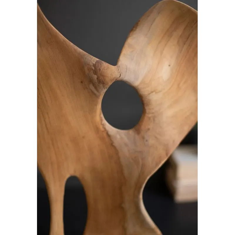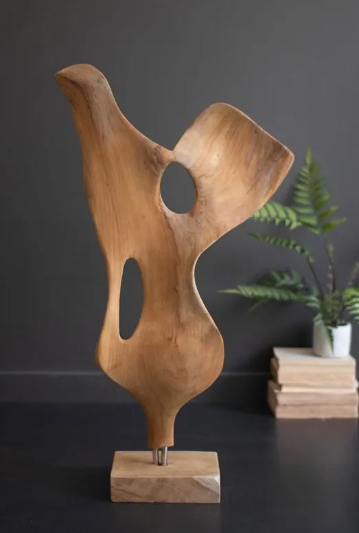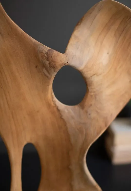 This wood sculpture on a base is smooth. The abstract shape brings to mind a breeze or wings in flight. Keep it near the ocean or where you wish to feel the breeze.