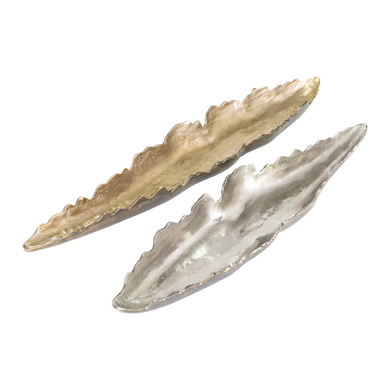 Elevate your home decor with the exquisite Willis Trays. Crafted from durable aluminum, these decorative trays come in two sizes and boast an eye-catching silver and gold finish. Featuring a sophisticated boat style, these trays are sure to add elegance to any room in your home. Use them as a centerpiece for your coffee or dining table, or as a decorative accent on a mantel or shelf. The possibilities are endless with these versatile and stylish trays. The Willis decorative trays come in a set of 2.