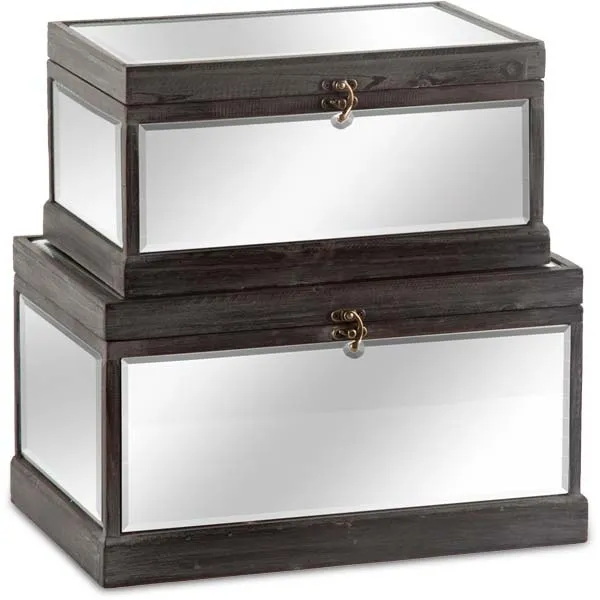 dark stained wood boxes with beveled mirror inlay and brass clasp