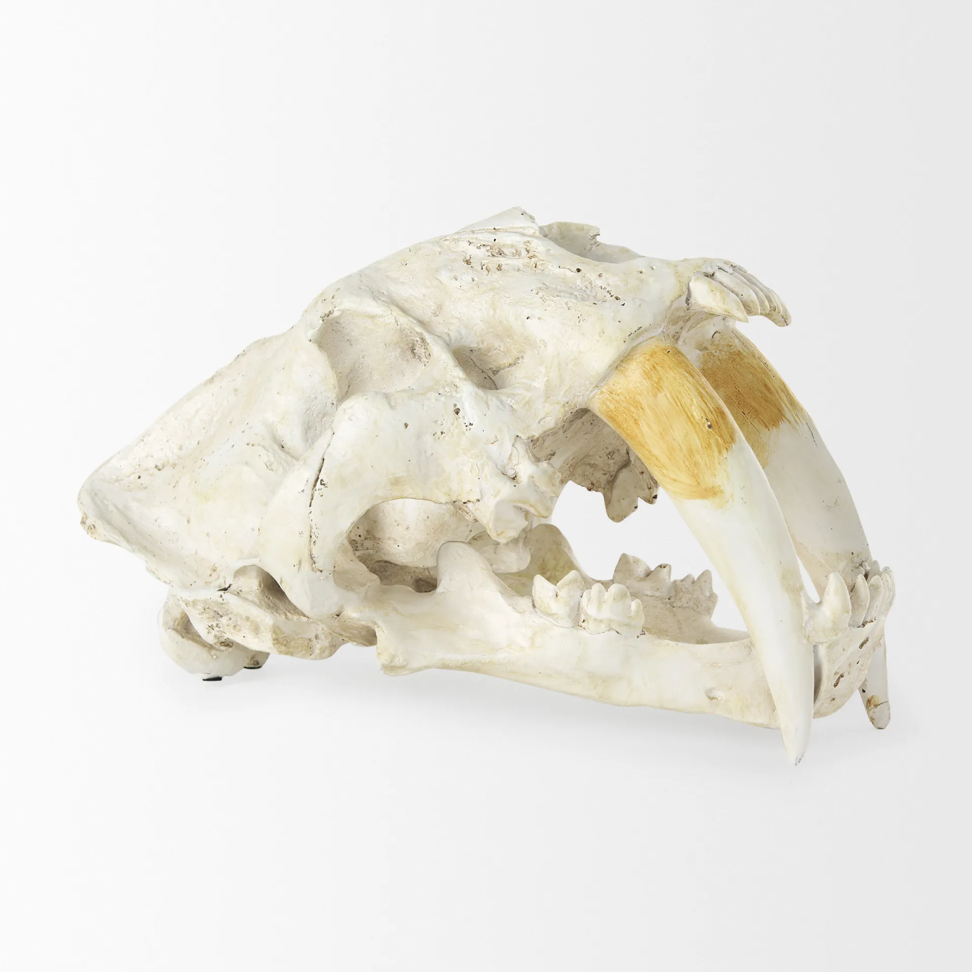 Resin sabretooth skull replica, with big pointy teeth.