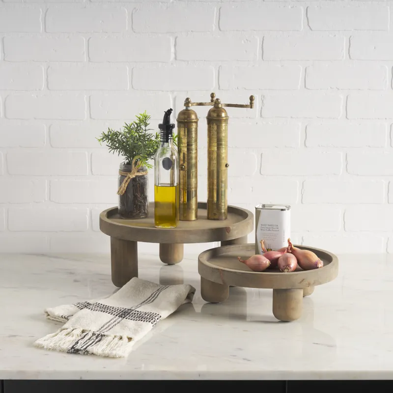 Virve is a set of two, round light brown solid wood trays with a subtle gray-wash finish.