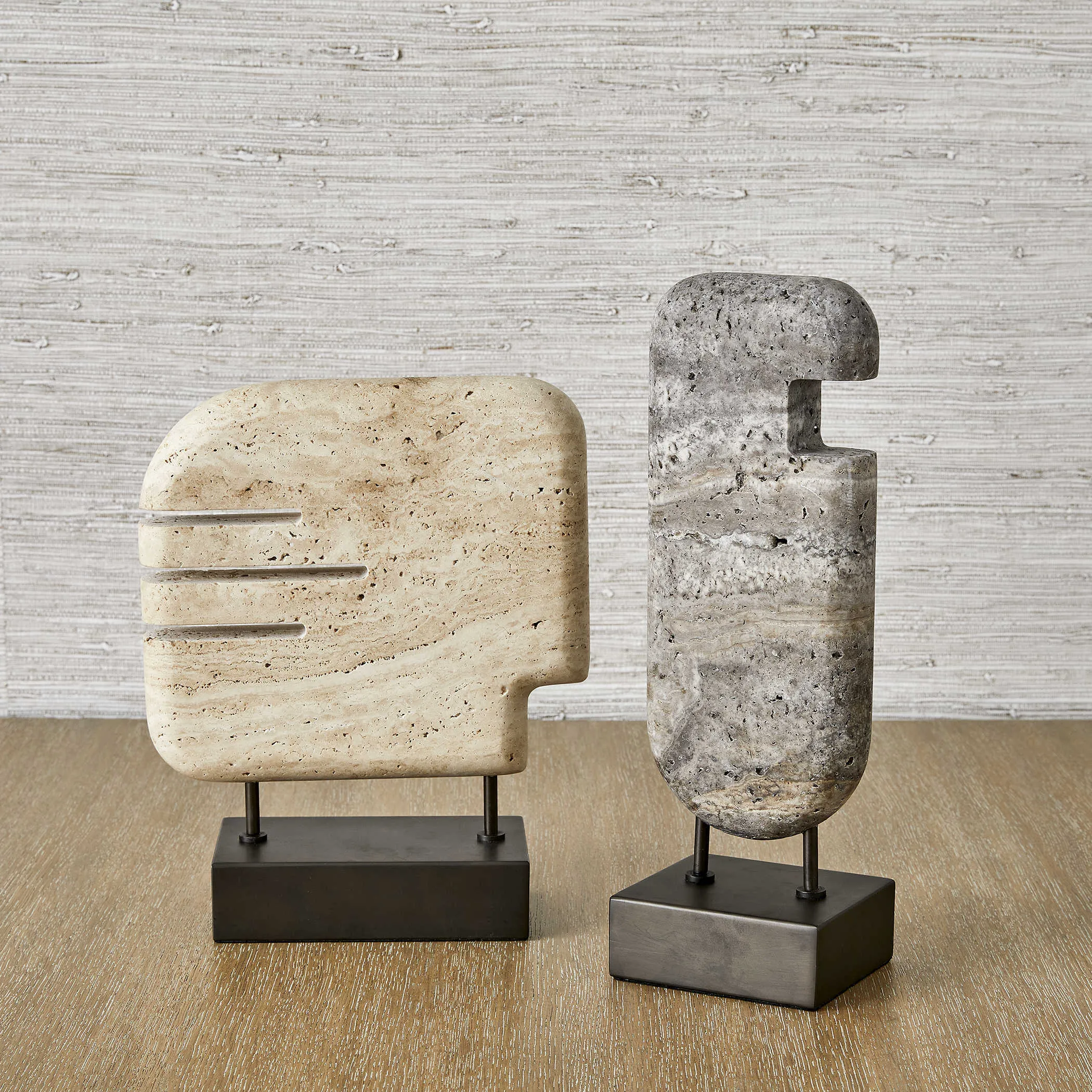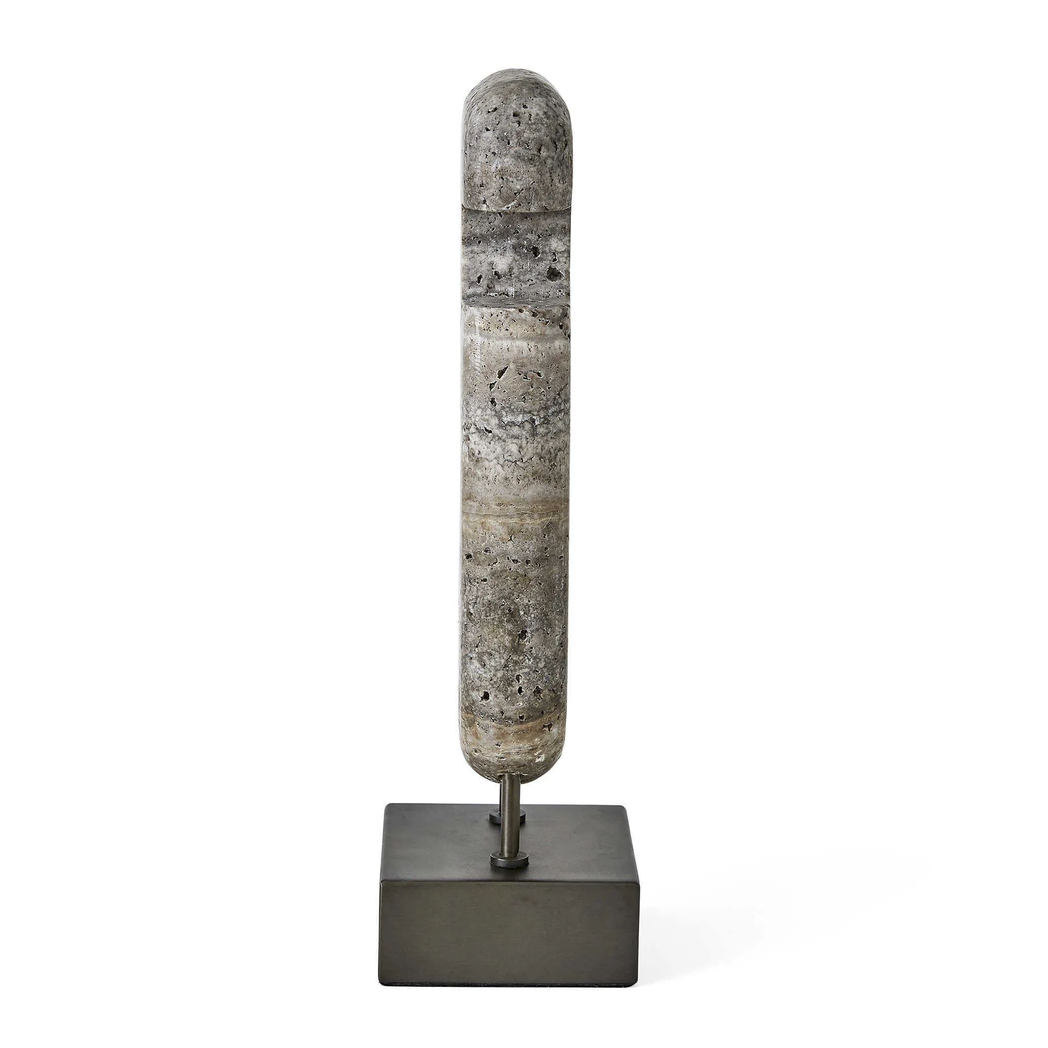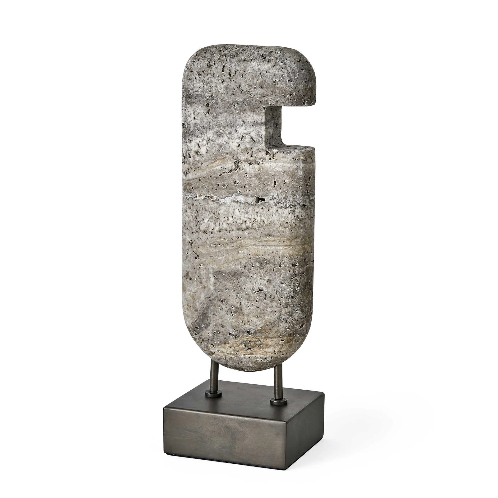 Icon-inspired and carved of gray unfilled travertine, this work is set on a bronzed steel base for a study in contrasts. Textured vs smooth, cool vs warm: the interplay invites a closer look whether displayed alone or as part of a grouping.