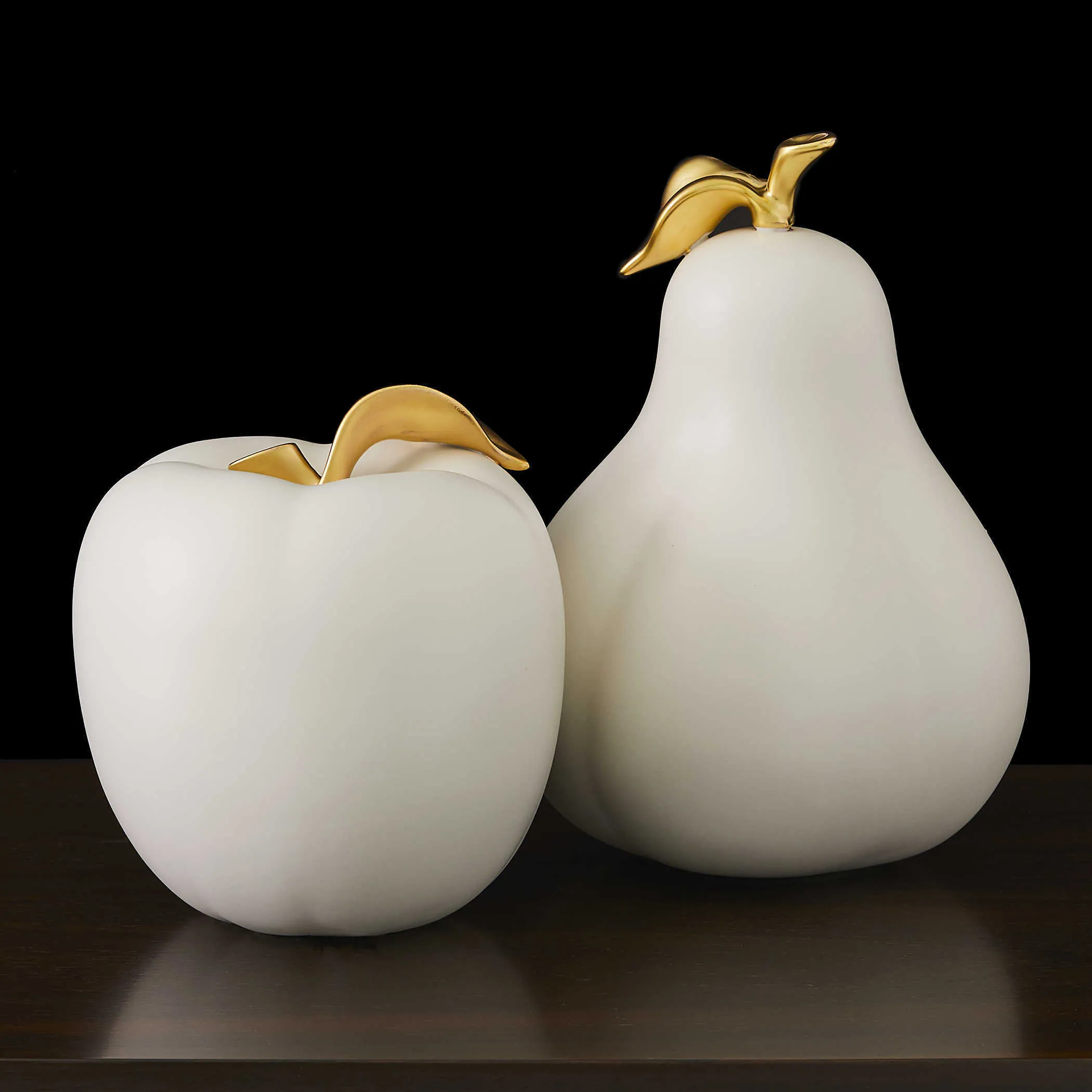 Beautifully sculpted ceramic apple and pear decorated in subtle matte white glaze highlighted with real gold decoration. Sizes: Apple-8x8x8, Pear-9x12x9