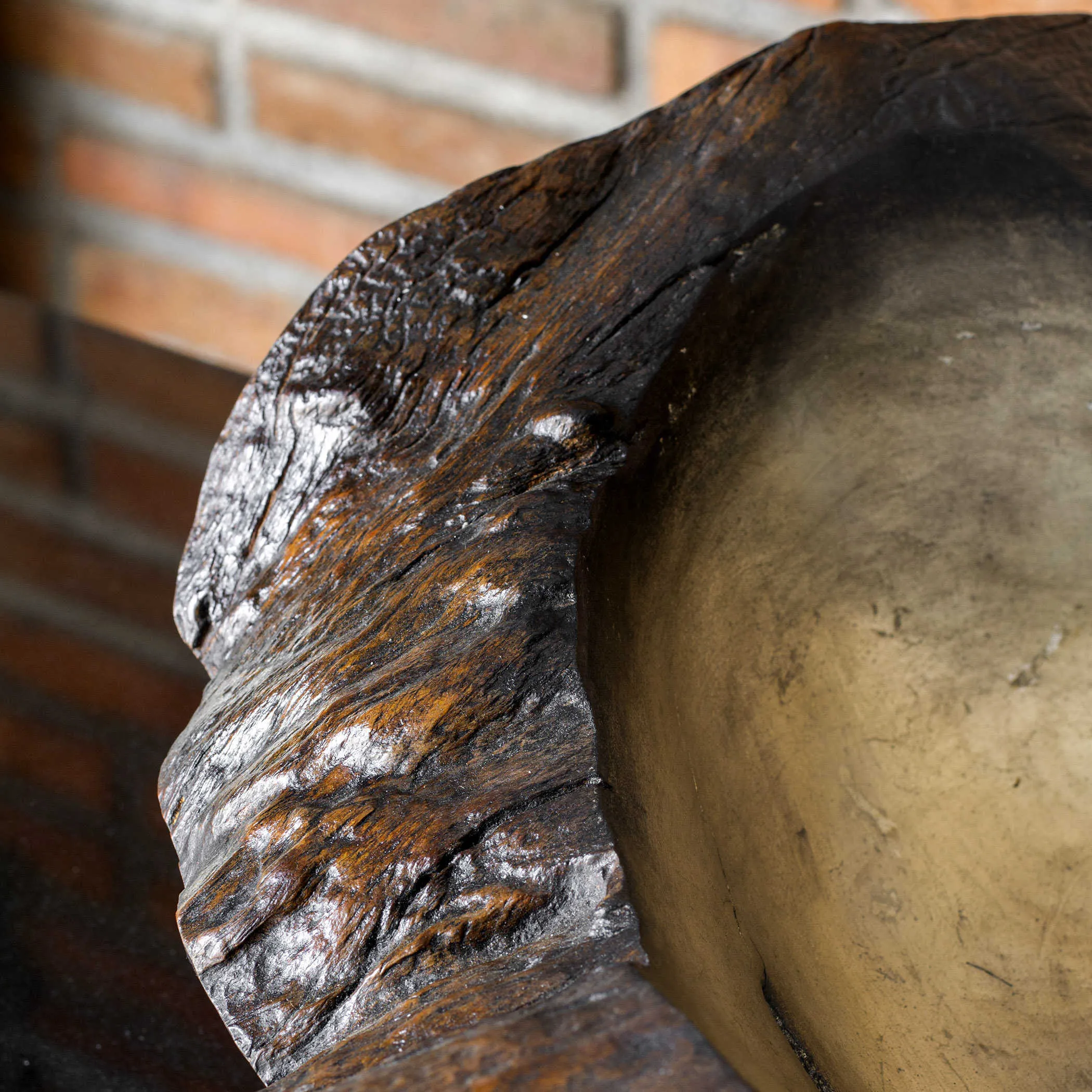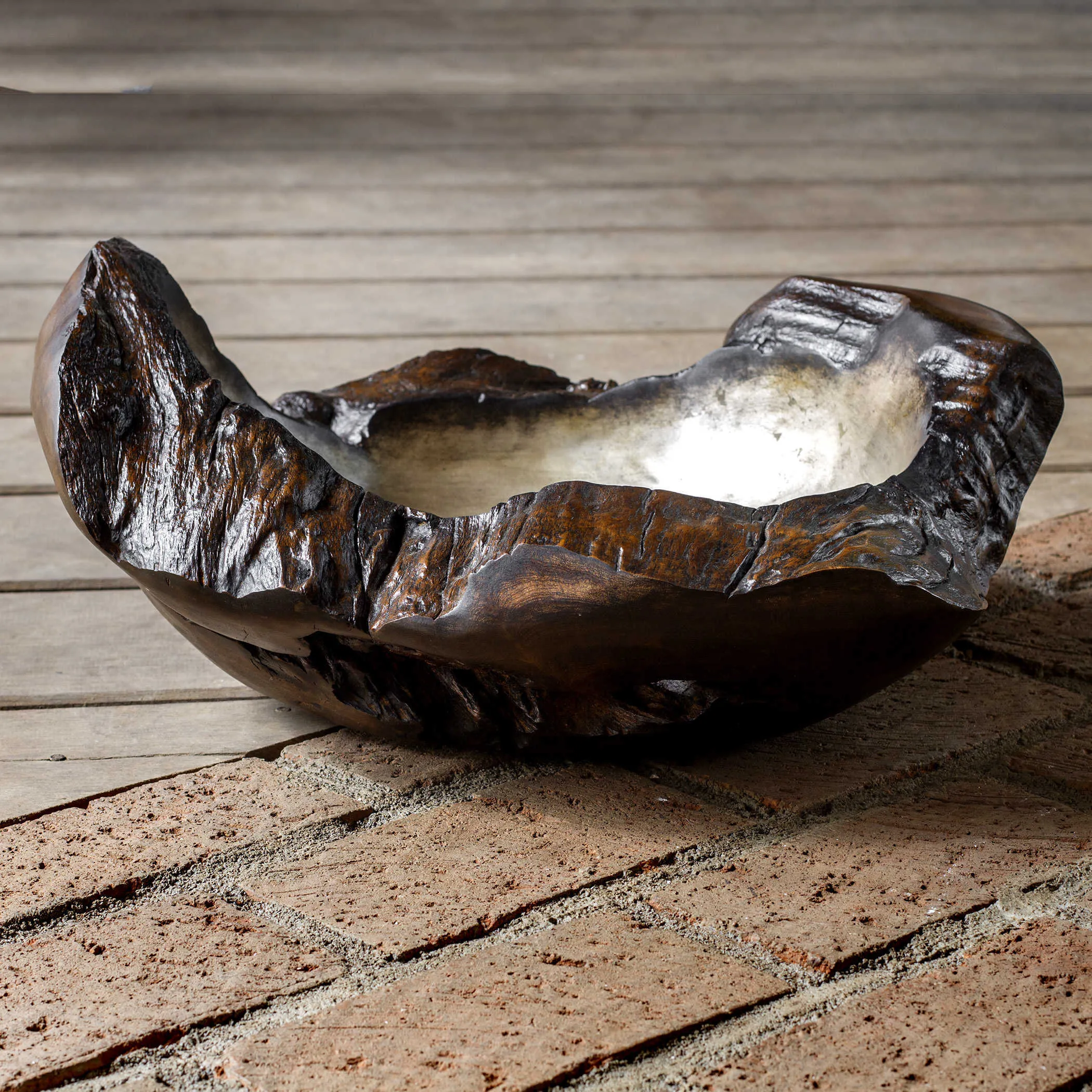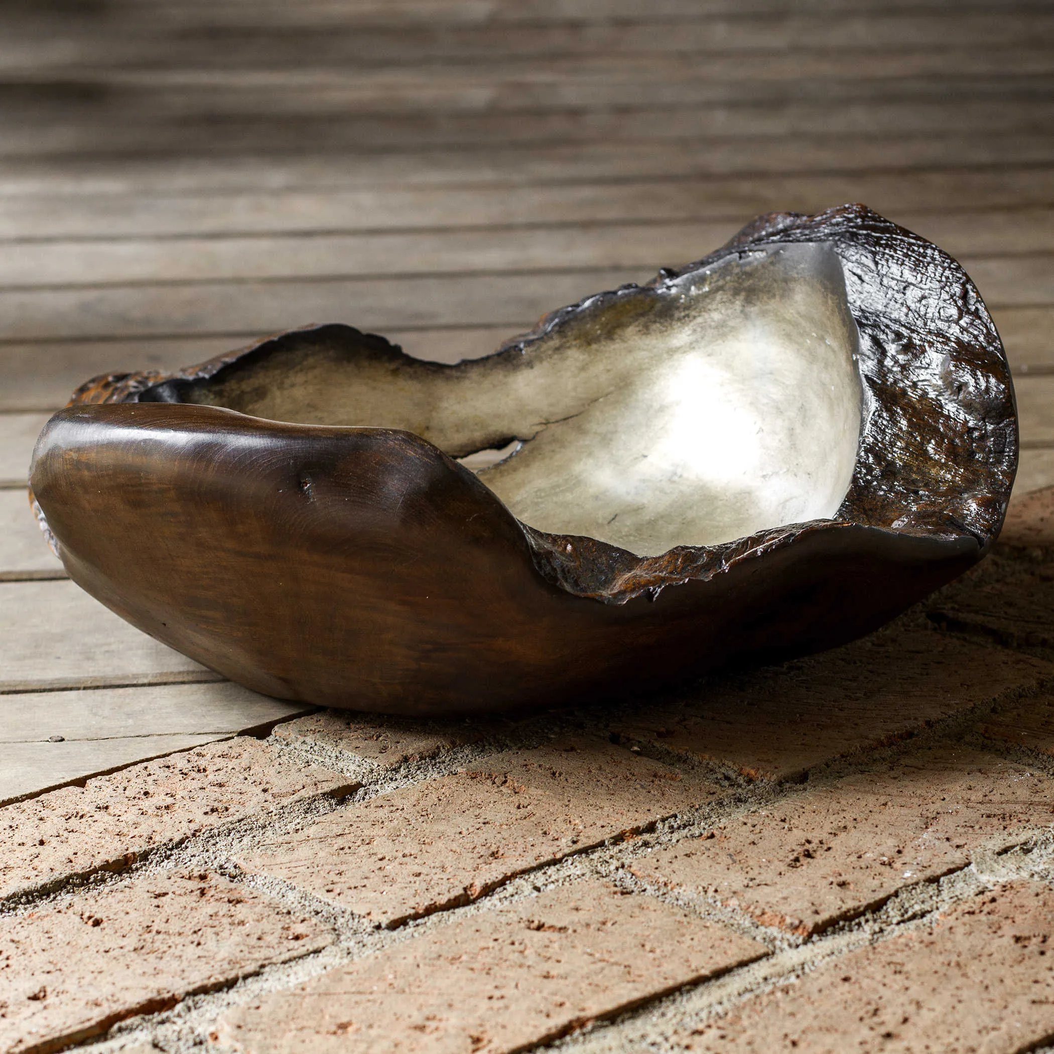 Beautifully handcrafted teak bowl, finished in a dark, stained exterior and cool burnished silver interior. Each will vary in size due to being uniquely handcrafted. Cracks and variations in grain are normal.
