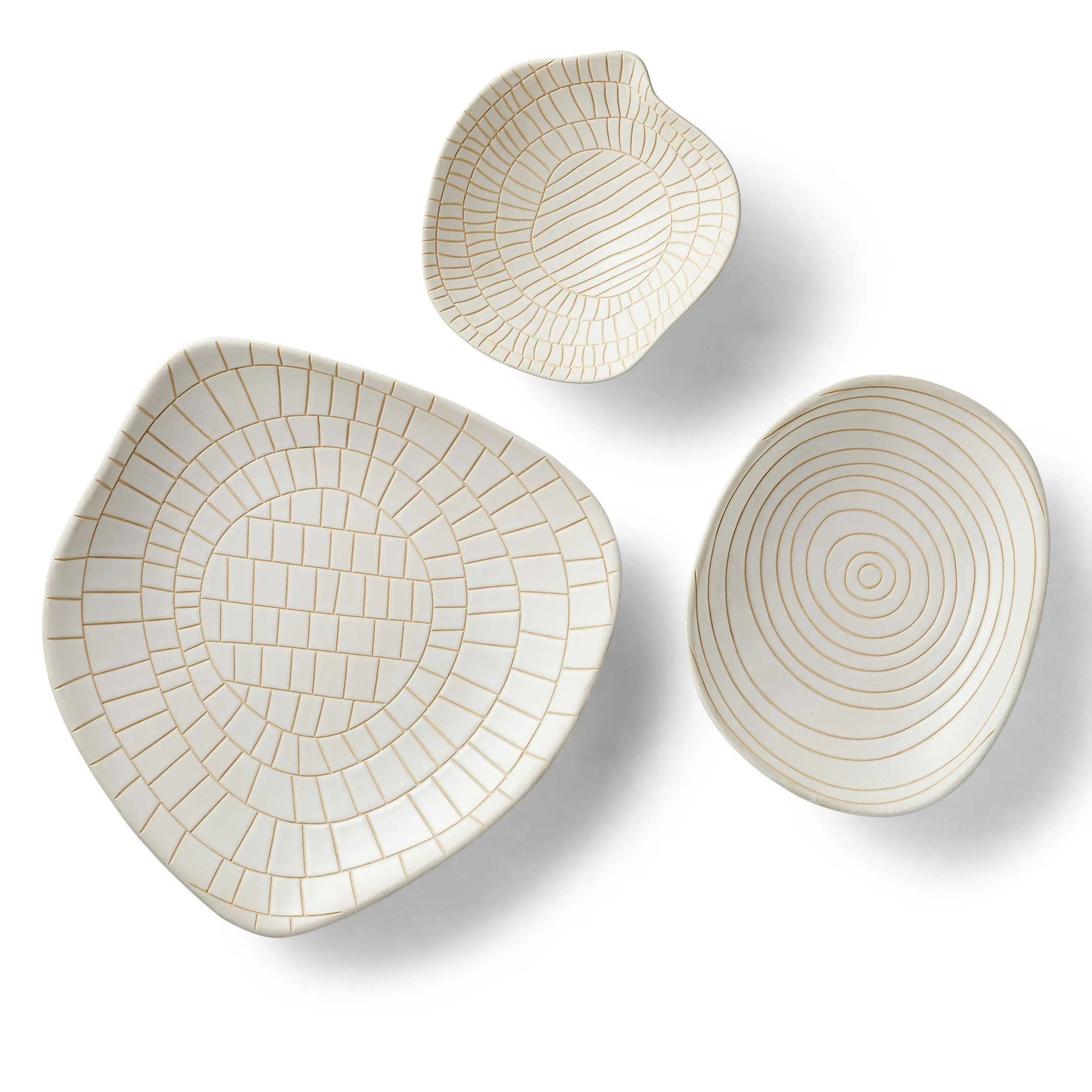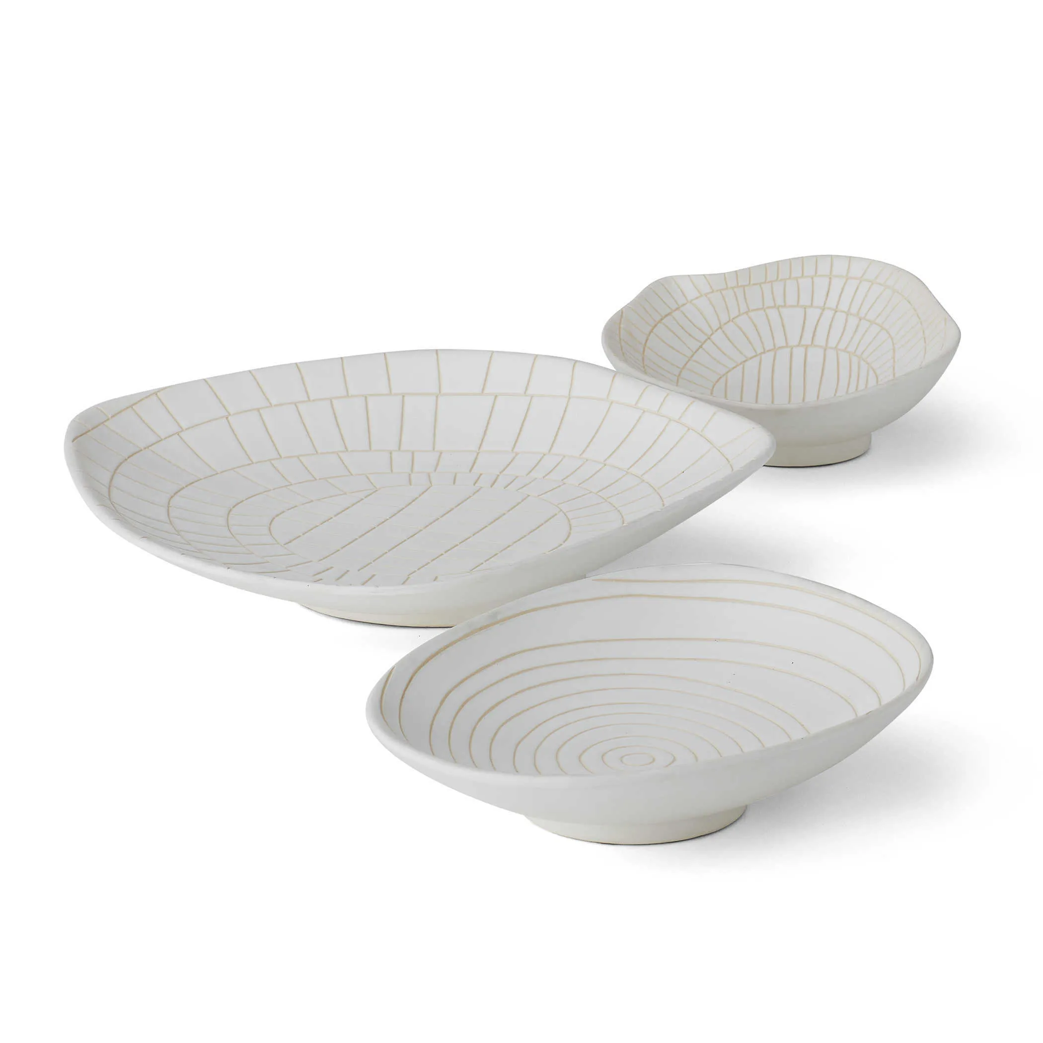 Unusual organic shapes made of terracotta with an off white matte glaze and a hand etched design reminiscent of ancient hieroglyphics and maps. Each bowl has hangers in four locations to allow for a multitude of options when creating wall installations. S - 9x9x4, M - 12x11x3, L - 16x16x4