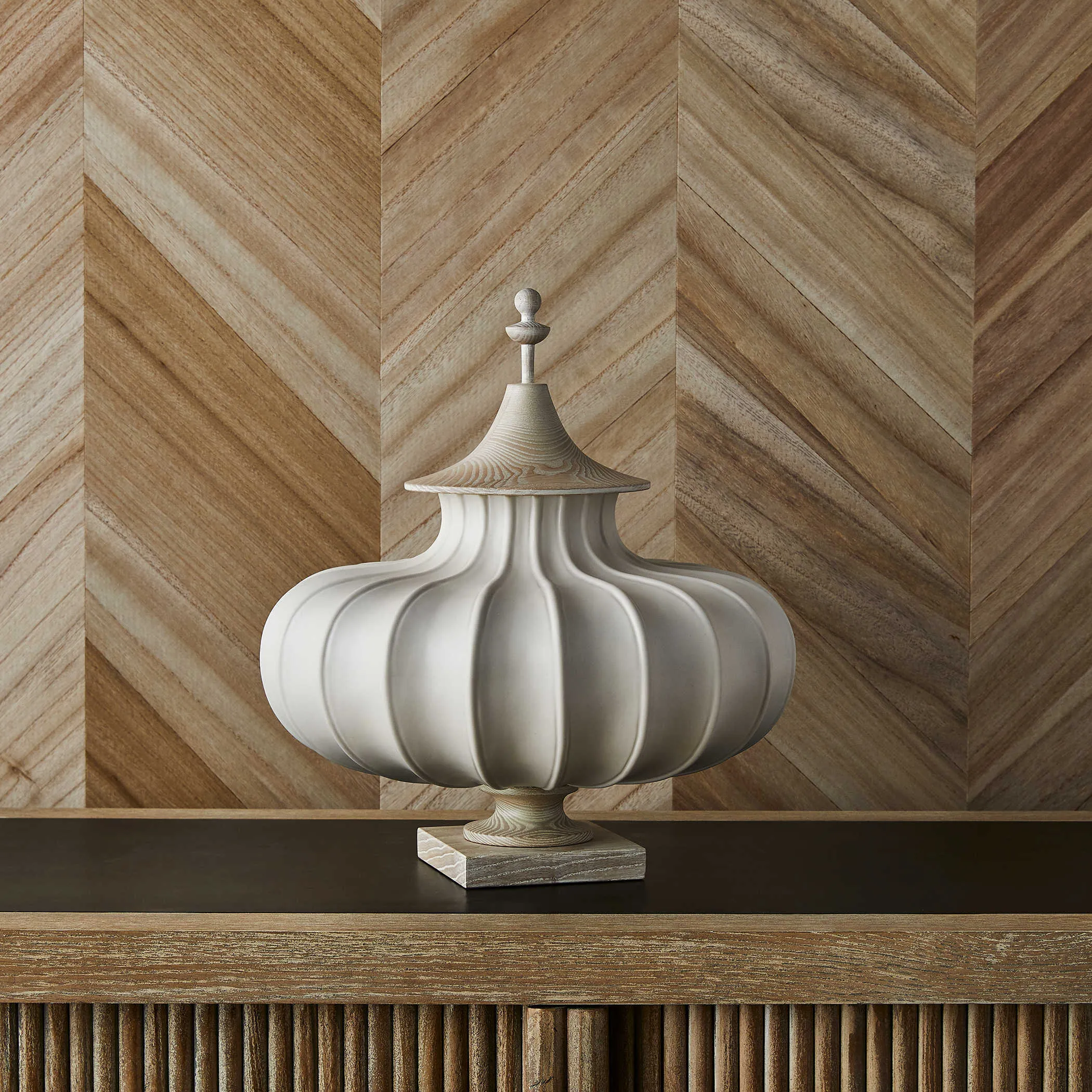 Ceramic urn inspired by classic Adam silver designs from early 19th century England is given an interesting new twist in a matte glaze finish. Ash base and lid with natural and white ceruse finish.