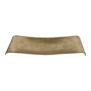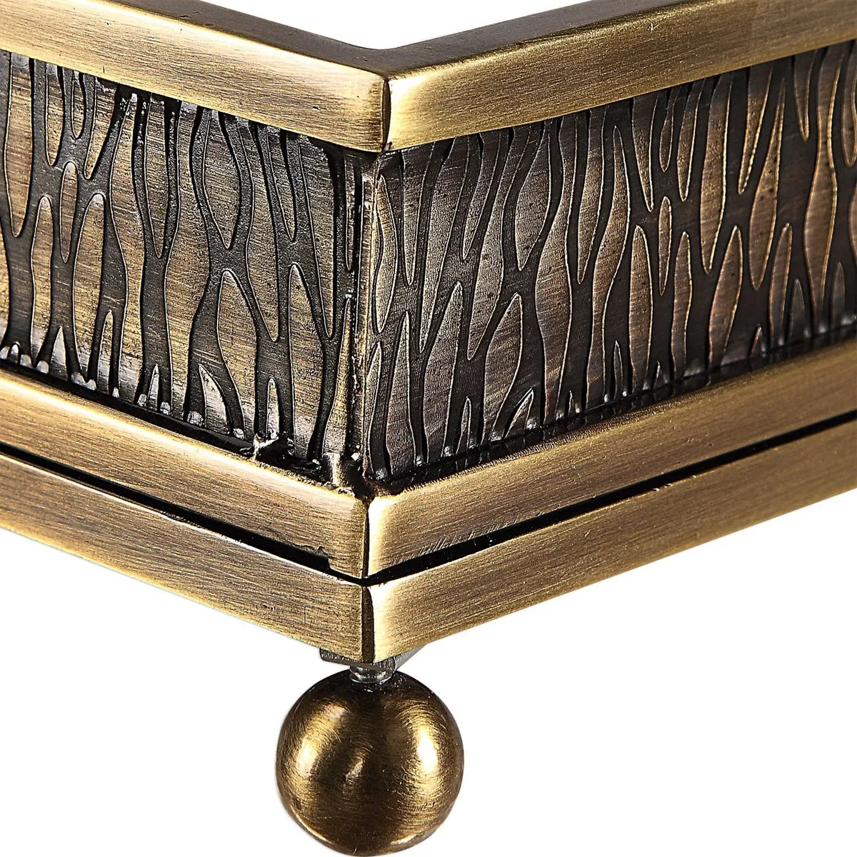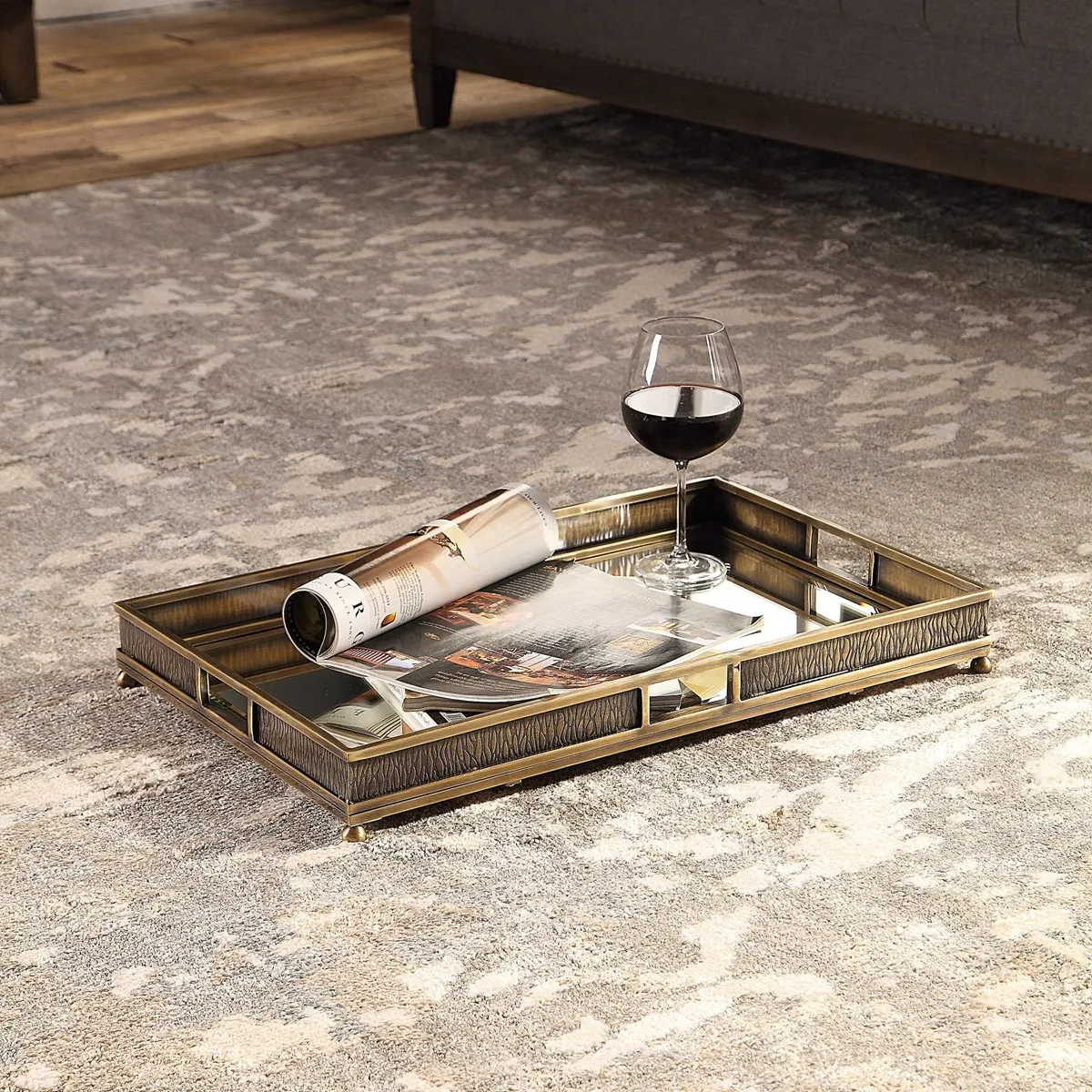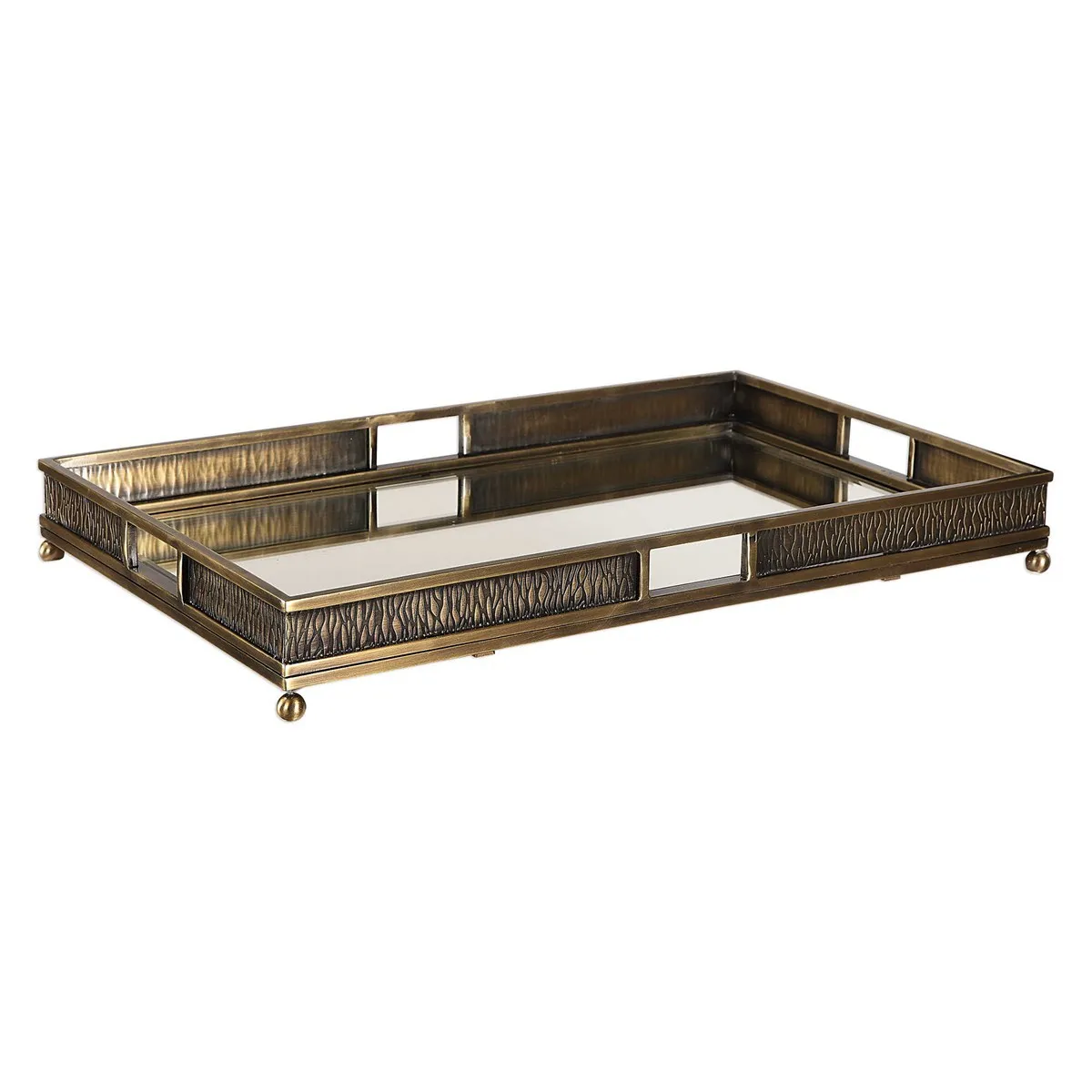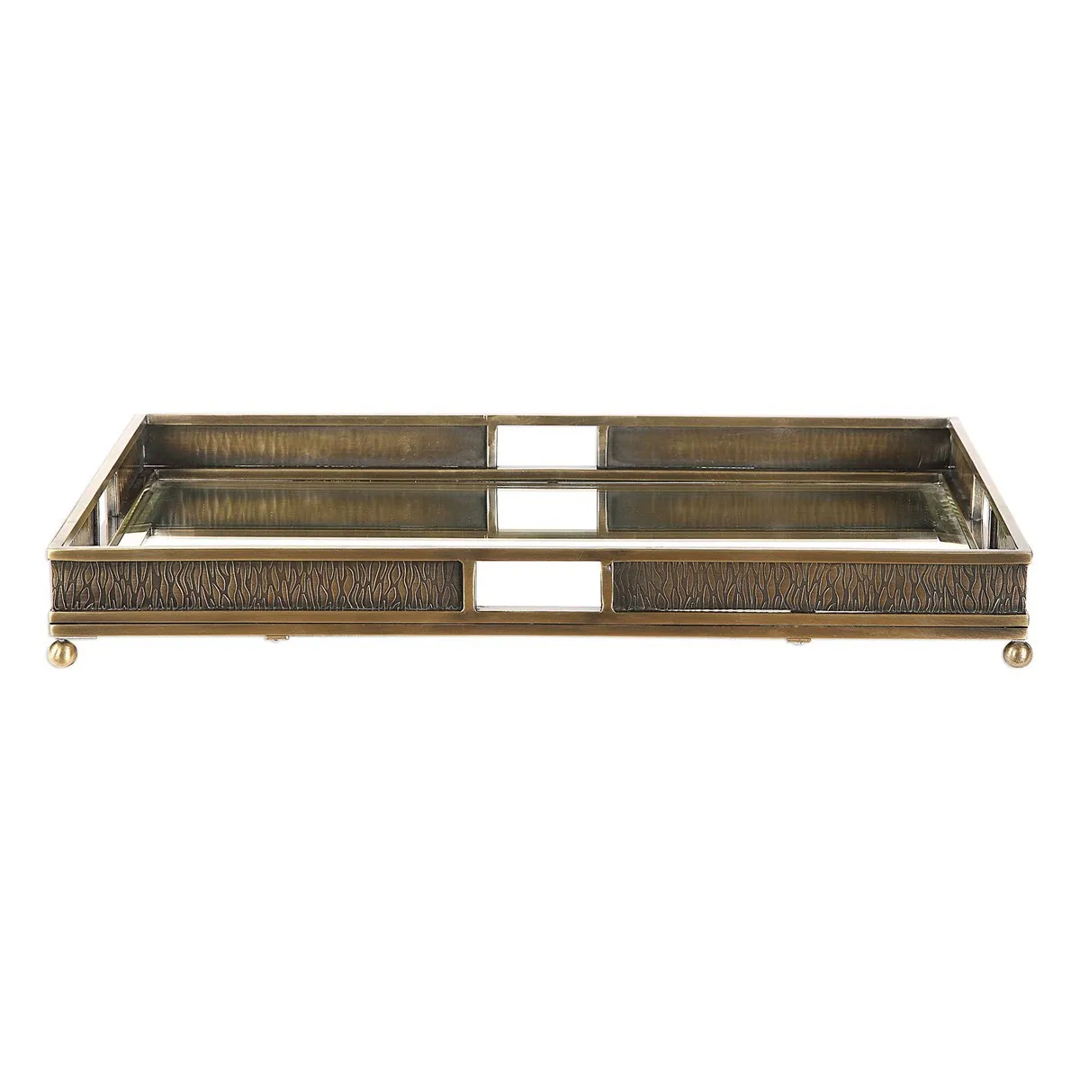 Steel tray with embossed edges and a heavily antiqued plated brass finish with mirrored base and elevated by ball feet.