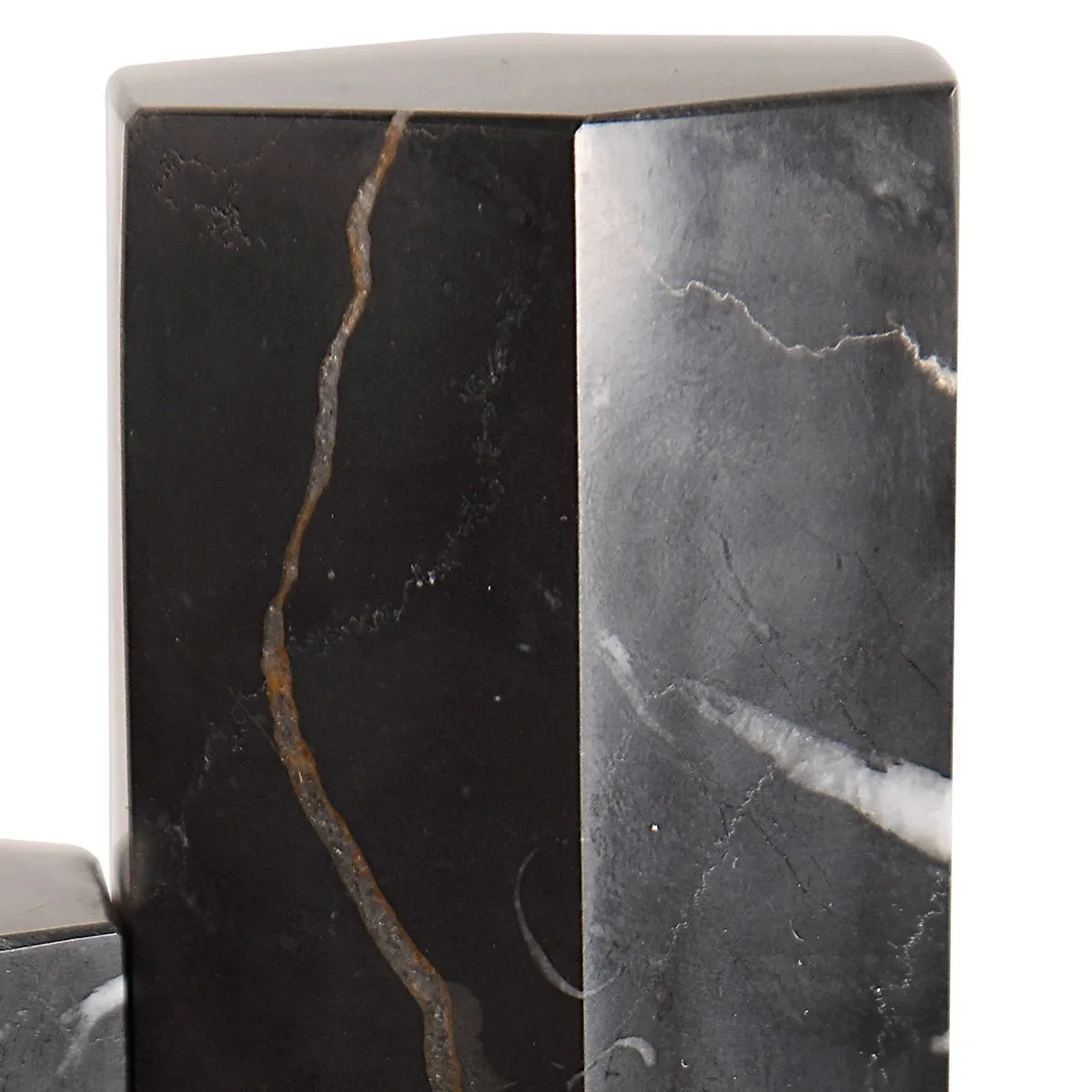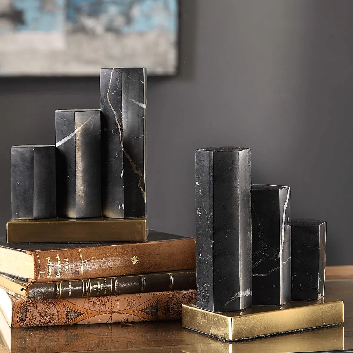 Set of two bookends, comprised of staggered hexagonal, black marble pillars set on an antique brass base.