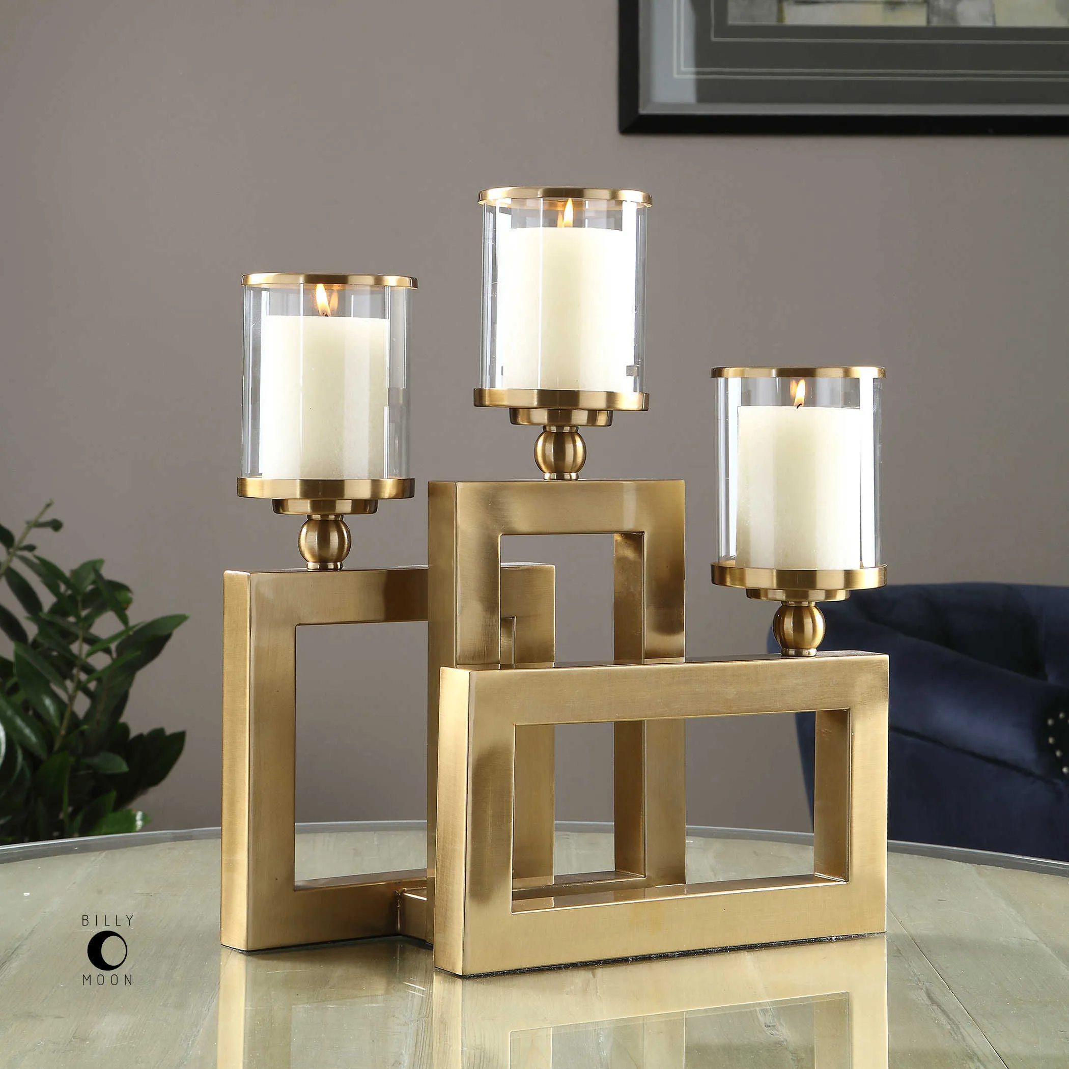 Cool geometric design, finished in a brass plating and accented by distressed beige candles and clear glass globes. Three, 3"x 4" distressed beige candles included.
