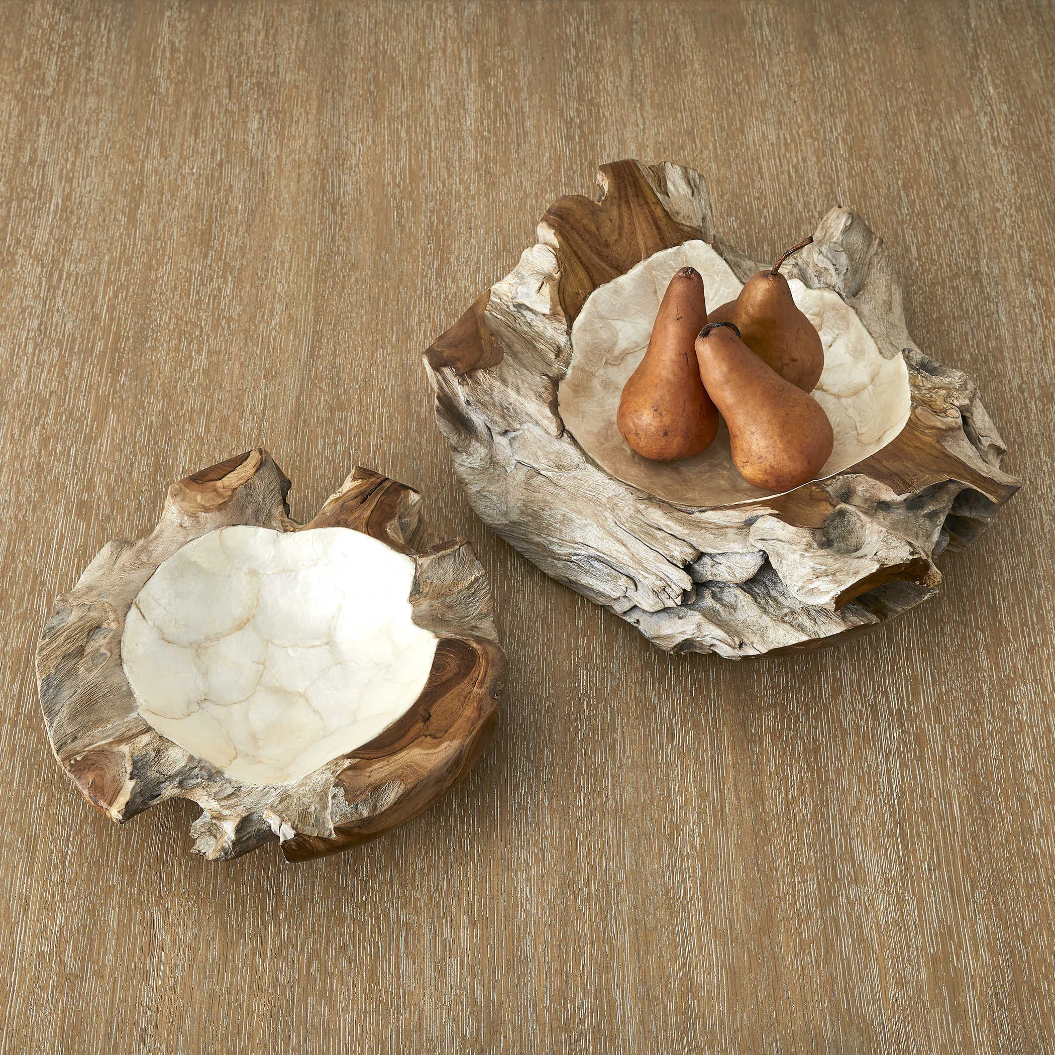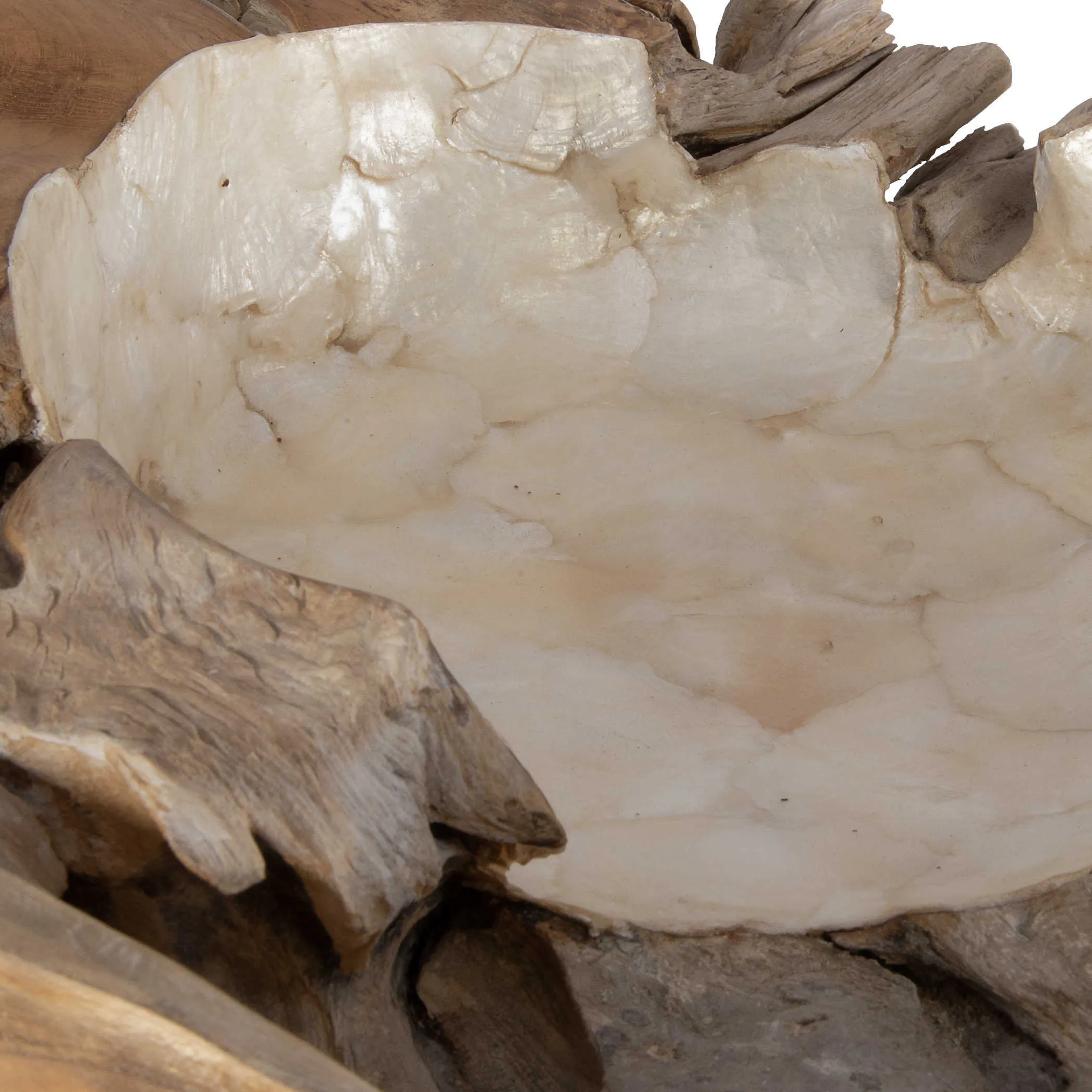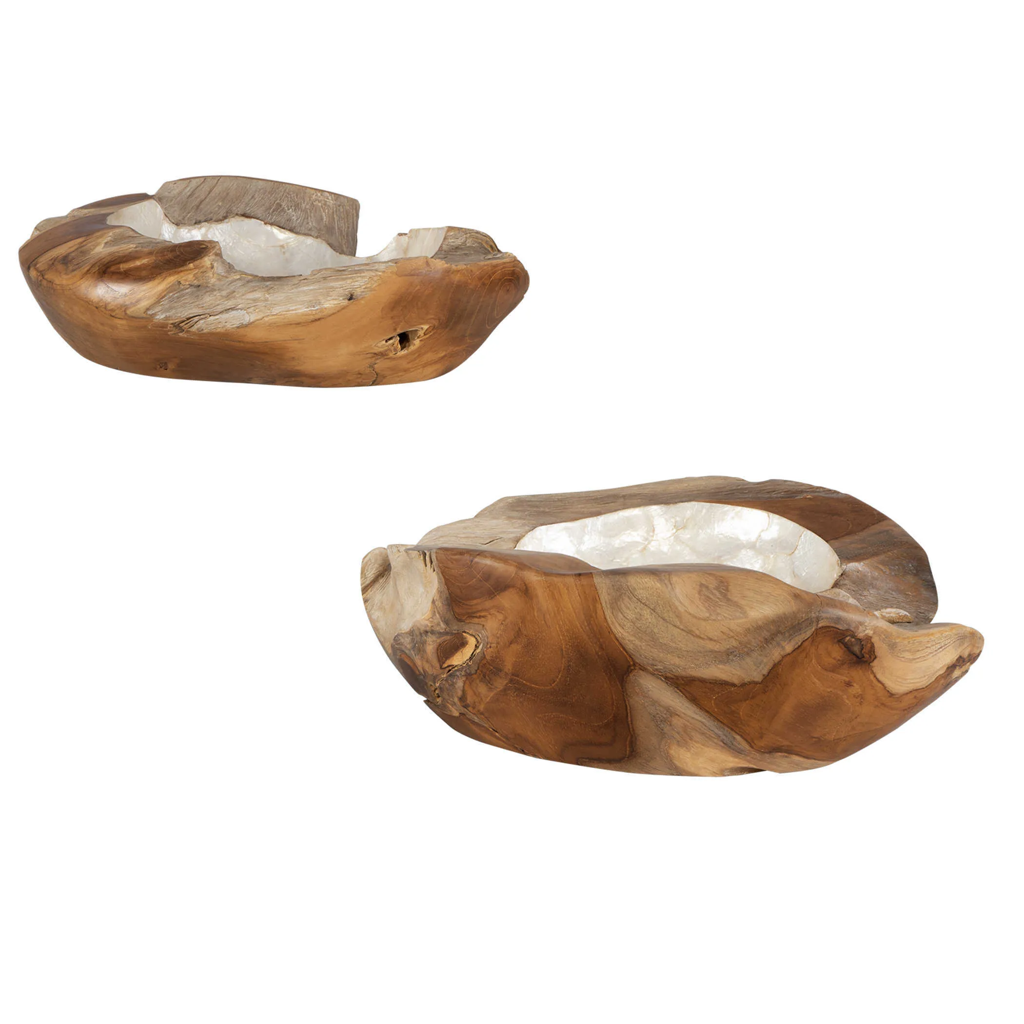Crafted by nature, the teak bowls are finished in a white wash exterior with lustrous Capiz shell interior. Each bowl will vary slightly in size and shape. Cracks and variations in grain are normal. Sizes: S-4x12x4, L-4x16x4