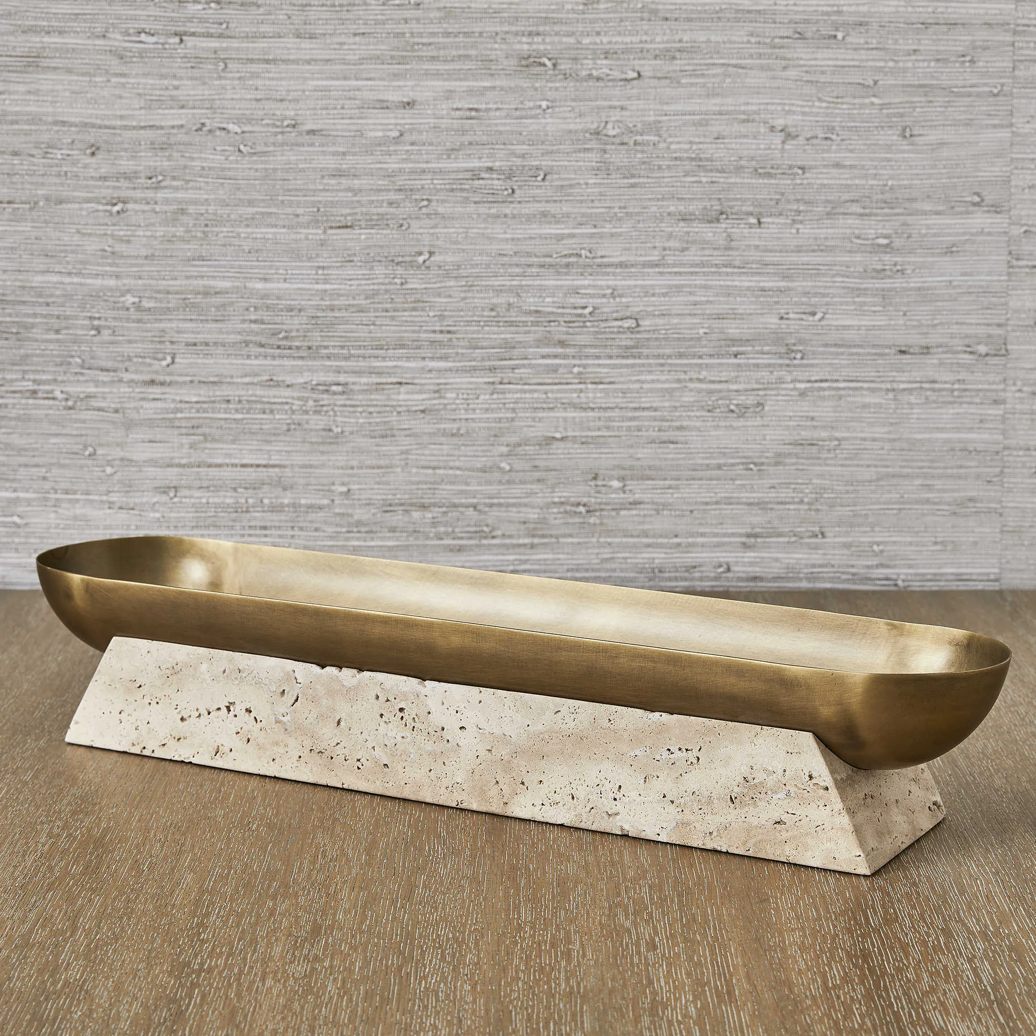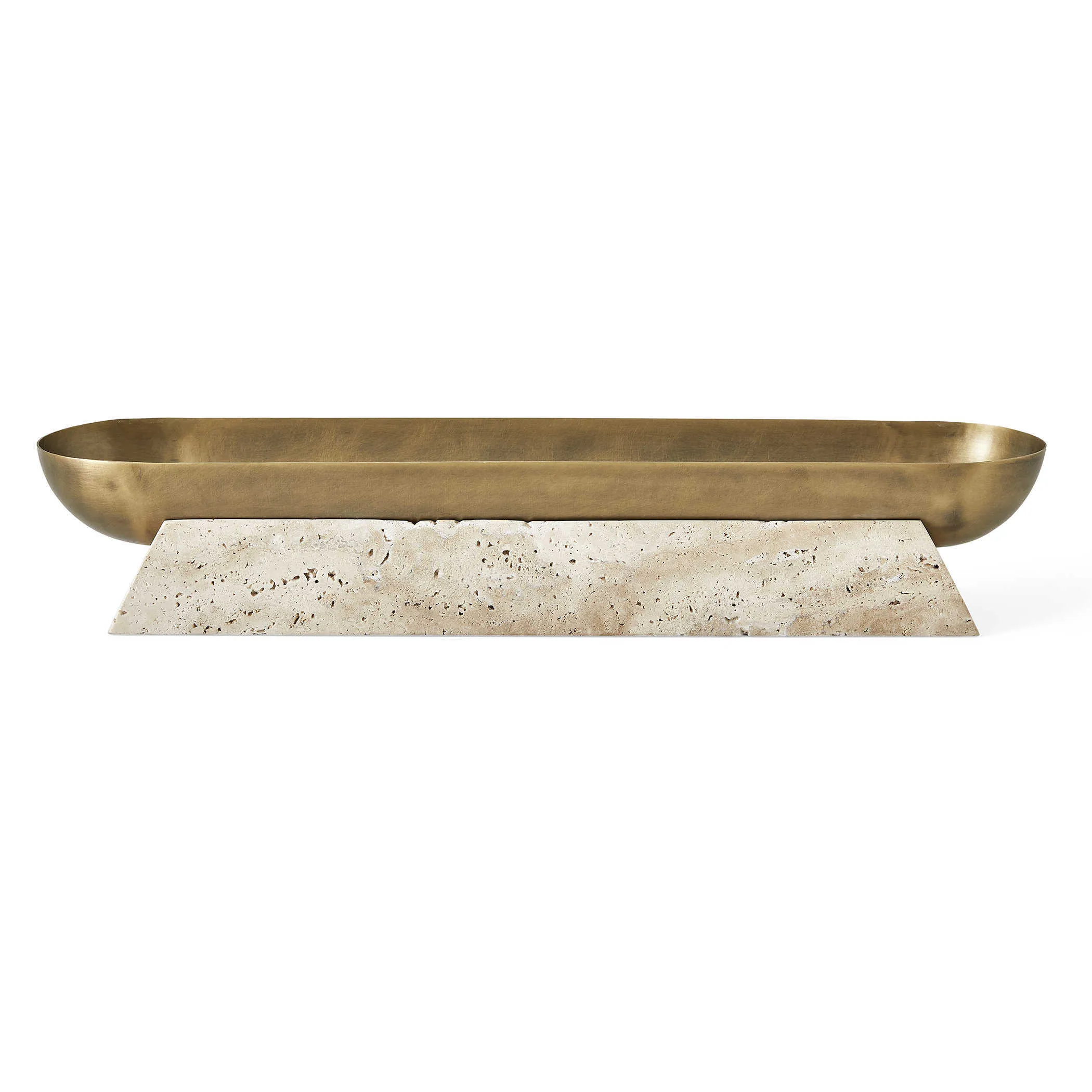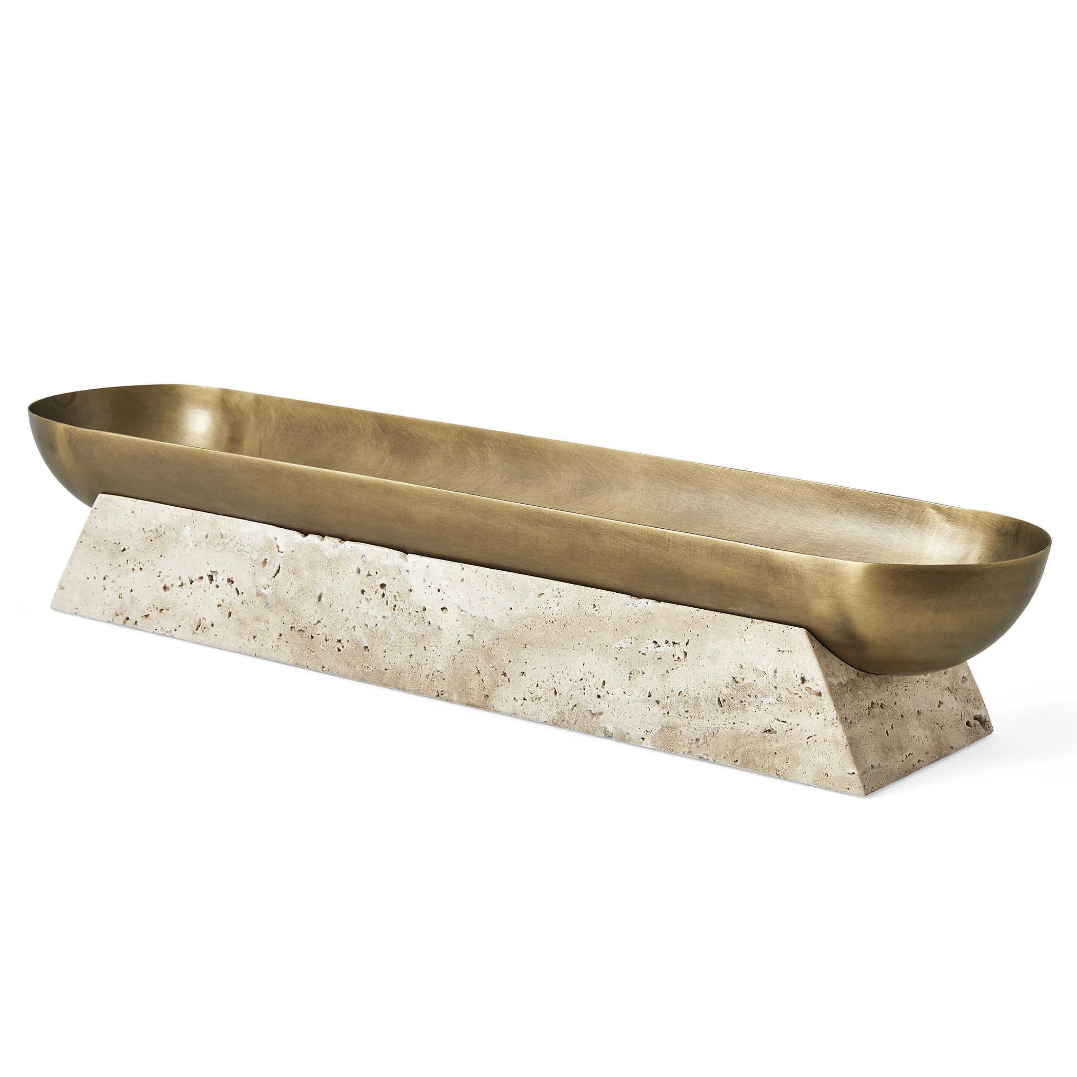 The luster of a smooth metal bowl, highlighted by its light antique brass finish, creates the perfect counterpoint to a textured pedestal carved from beige unfilled travertine. This decorative bowl holds so much potential, as a low-profile console accent under a widescreen or the most artful catchall ever. If using with plants that require water, a liner is recommended.