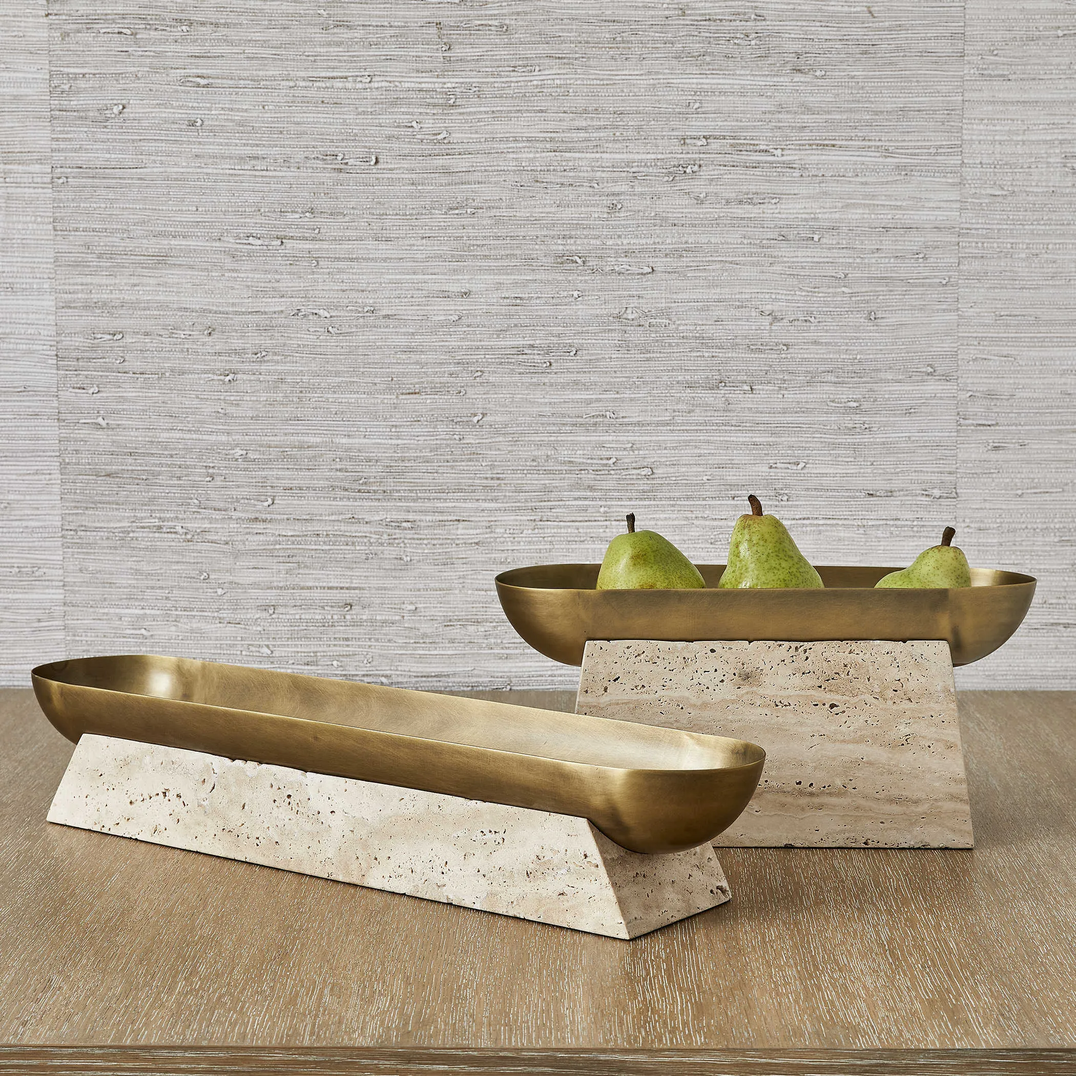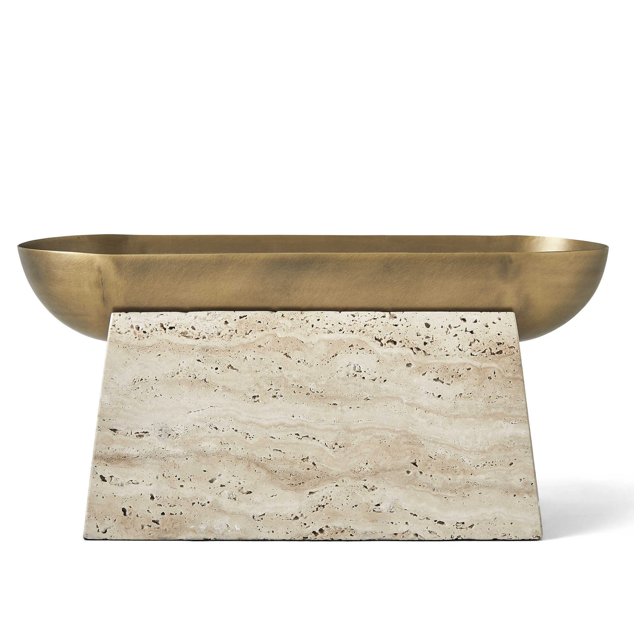 The luster of a smooth metal bowl, highlighted by its light antique brass finish, creates the perfect counterpoint to a textured pedestal carved from beige unfilled travertine. This decorative bowl holds so much potential, as a dramatic statement centerpiece or the most artful catchall ever. If using with plants that require water, a liner is recommended.