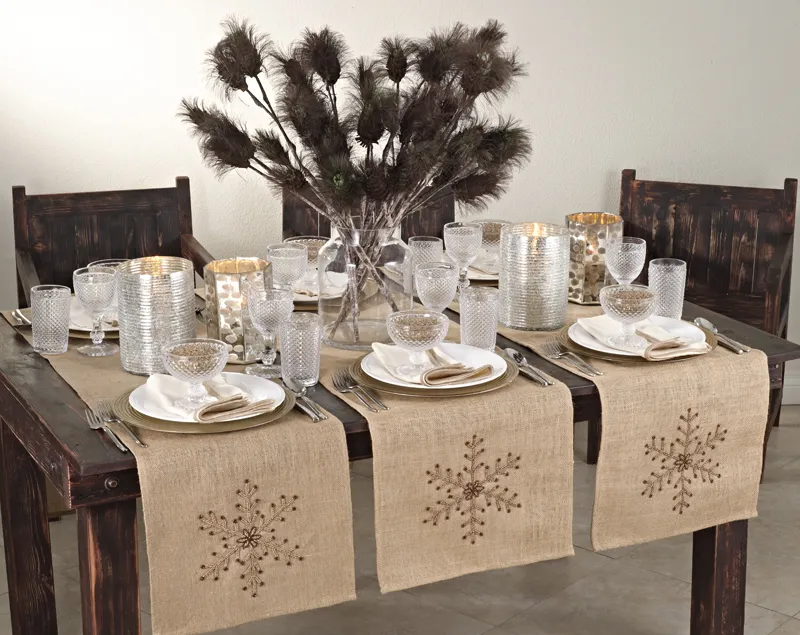 Beaded snowflake design holiday table runner. 100% jutedry cleanimported