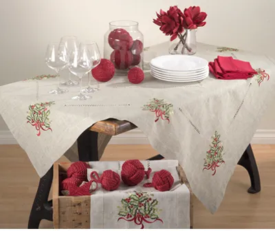 Embroidered xmas tree design table topper for a festive holiday table. 80% polyester - 20% linenmachine washableimported