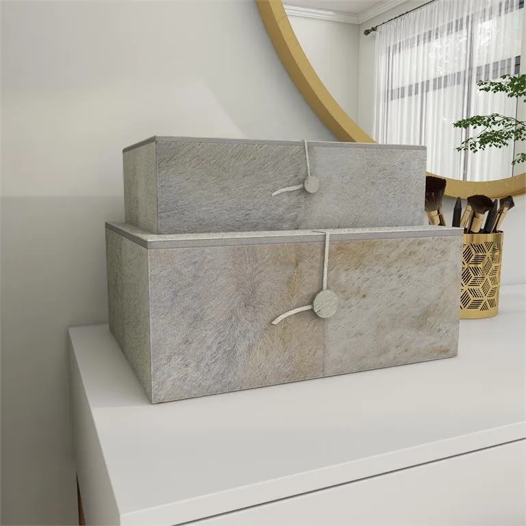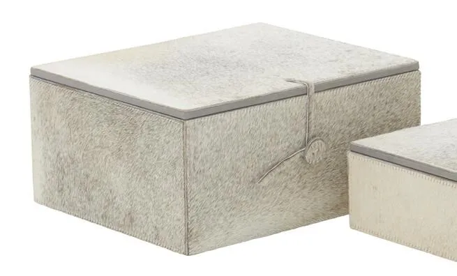 Add rich texture to your tabletops or shelves with this pair of rectangular real hide leather boxe, features soft white and gray natural hair and with light golden brown splotches, upholstered with white-stitched patches and gray velvet interiors.