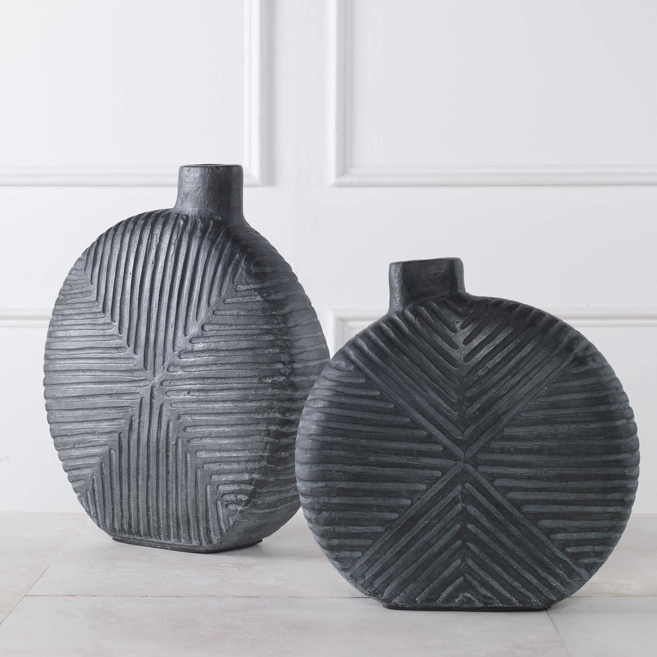 This vase is accented by contemporary geometric carving in aged black with off-centered openings, perfect for floral stems or placed among your other favorite accessories.